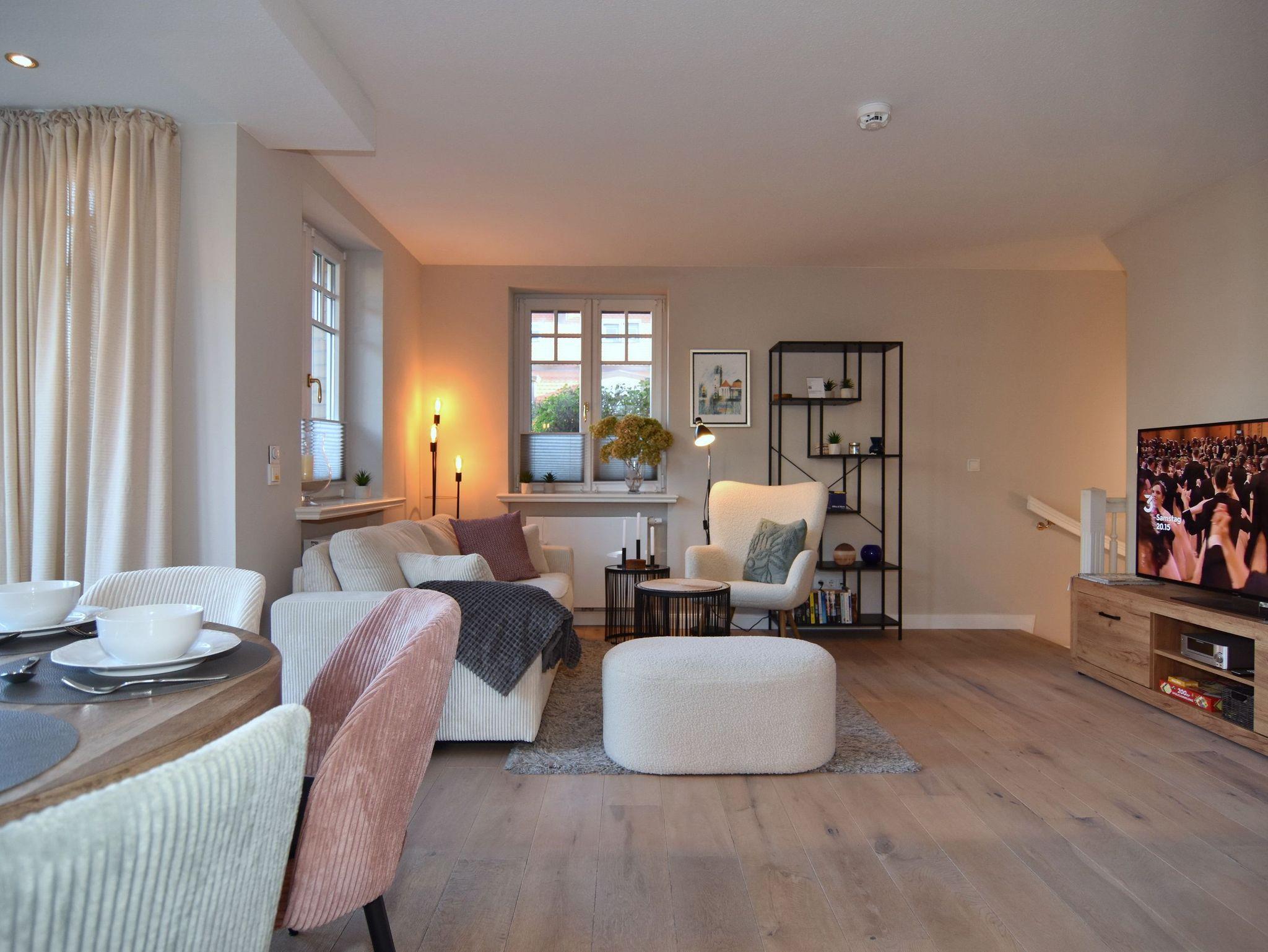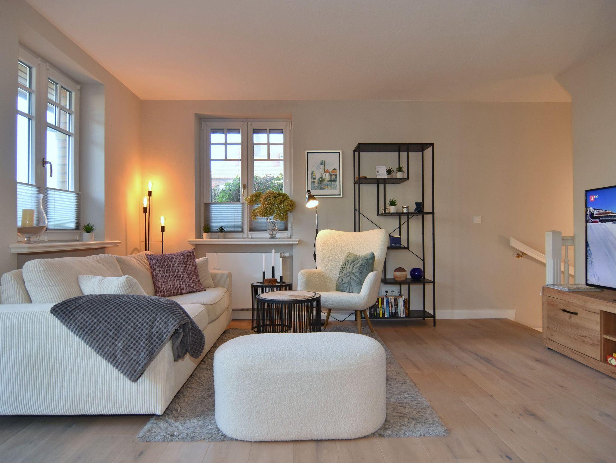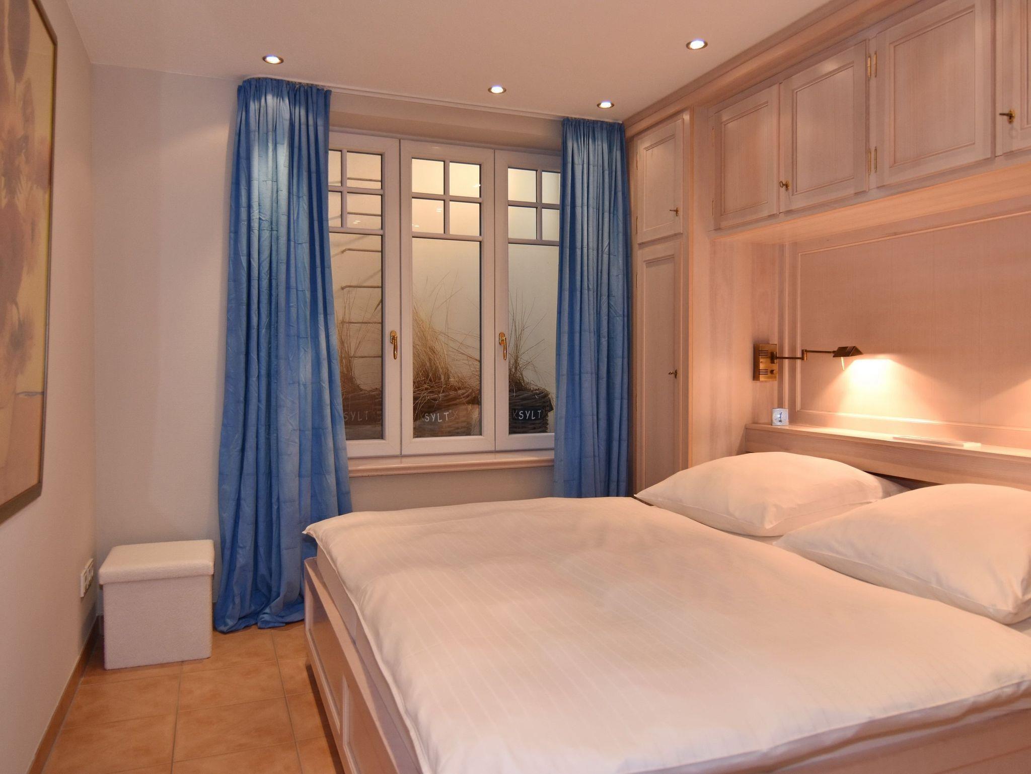 Die Wohnung Seestern befindet sich in zentraler und dennoch ruhiger Lage Westerlands nur unweit der Friedrichstraße. Mit ca. 63qm bietet diese Platz für bis zu 4 Personen auf 2 Ebenen. Im Erdgeschoß befindet sich das Wohnzimmer mit gemütlicher Sitzecke, Essplatz und Zugang zur Terrasse mit Strandkorb und Gartenmobiliar. Großer TV, W-Lan und Musikanlage sind selbstversändlich vorhanden. Die offene Küche verfügt über Geschirrspüler, Backofen/Mikrowellen-Kombigerät und neben der normalen Filter-Kaffeemaschine auch über eine Senseo-Maschine. Vom kleinen Vorflur mit Garderobe gelangen Sie zum Gäste-WC. Im Souterrain befinden sich zwei Schlafräume, ein geräumiges Duschbad / WC mit Fön, Schminkspiegel und eingebautem Radio sowie ein Abstellraum mit Waschtrockner, Bügelbrett etc. Das größere Schlafzimmer hat ein Einbaudoppelbett (180x200) und Schränke und Safe, das kleinere ein Doppelbett (140x200 - Achtung leichte Schräge, siehe Foto), Kommode und TV. Das Souterrain hat Fußbodenheizung. Zu der Wohnung gehört ein Pkw-Aussenstellplatz, der sich direkt am Haus befindet. Tierhaltung und Rauchen sind in der Wohnung nicht gestattet. Bettwäsche und Handtücher sind zur Anreise aufgezogen.