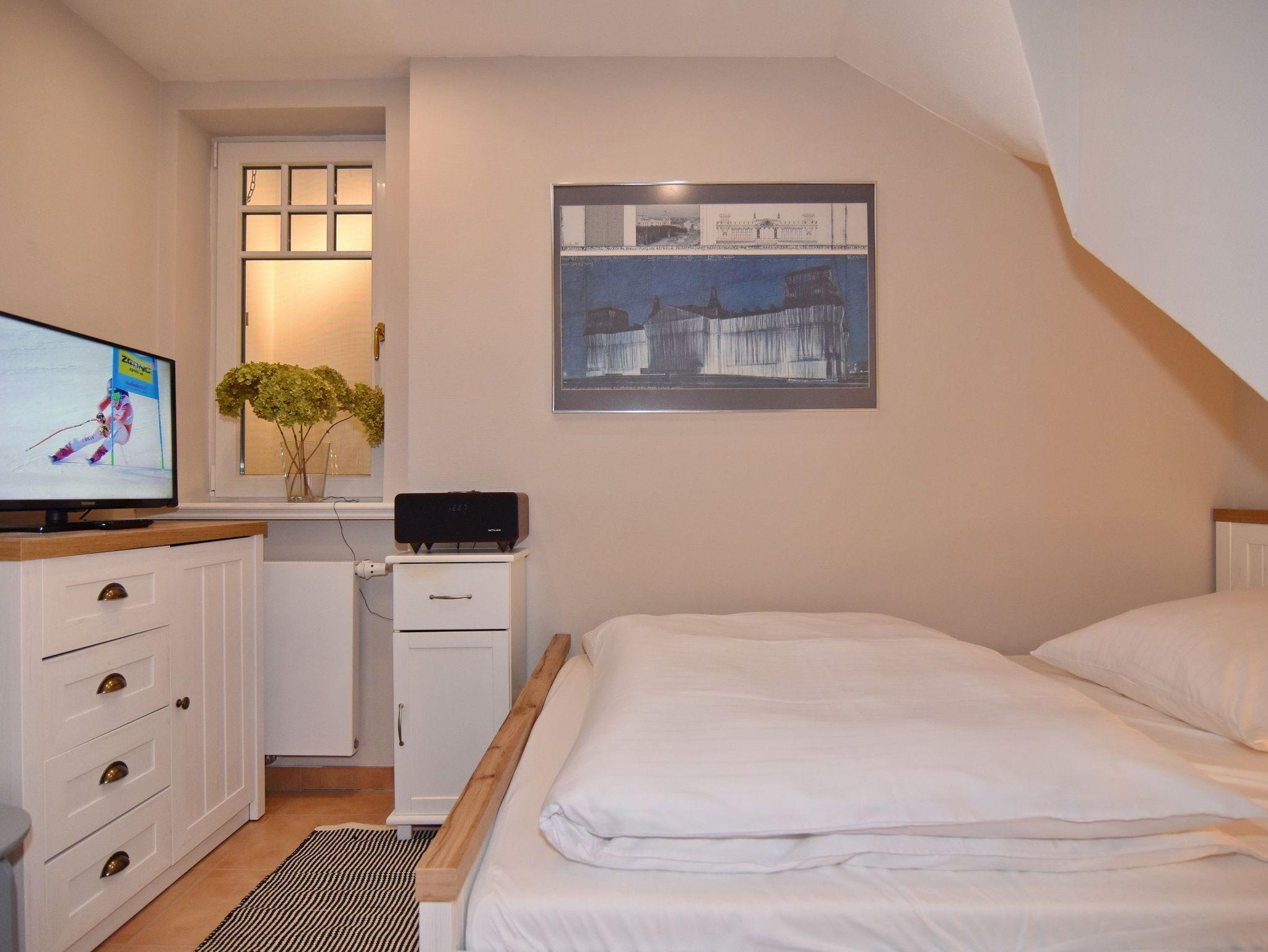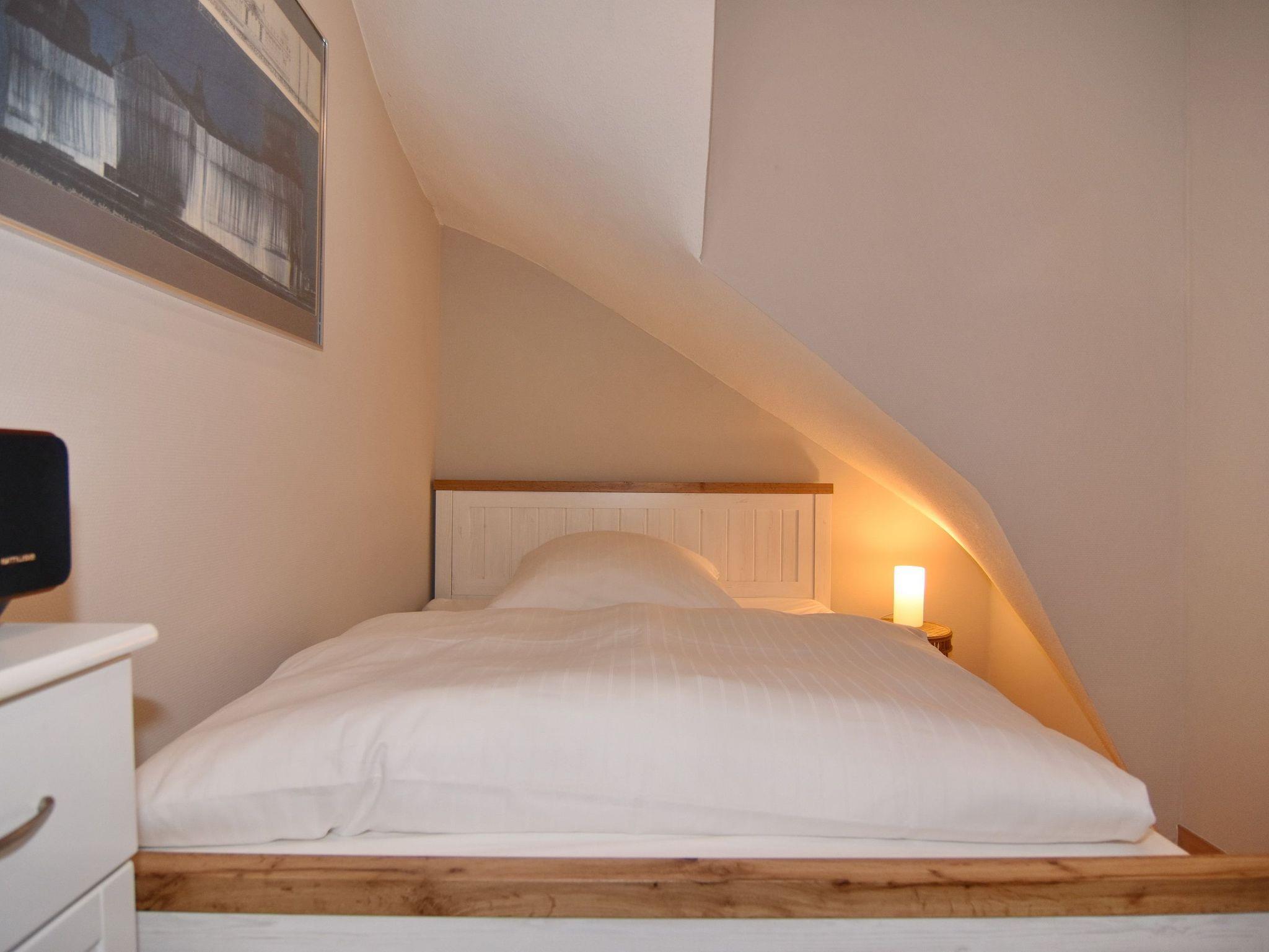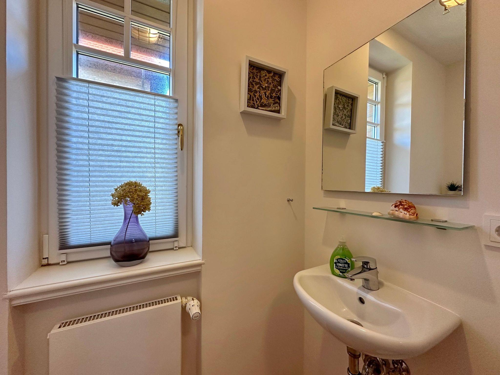 Die Wohnung Seestern befindet sich in zentraler und dennoch ruhiger Lage Westerlands nur unweit der Friedrichstraße. Mit ca. 63qm bietet diese Platz für bis zu 4 Personen auf 2 Ebenen. Im Erdgeschoß befindet sich das Wohnzimmer mit gemütlicher Sitzecke, Essplatz und Zugang zur Terrasse mit Strandkorb und Gartenmobiliar. Großer TV, W-Lan und Musikanlage sind selbstversändlich vorhanden. Die offene Küche verfügt über Geschirrspüler, Backofen/Mikrowellen-Kombigerät und neben der normalen Filter-Kaffeemaschine auch über eine Senseo-Maschine. Vom kleinen Vorflur mit Garderobe gelangen Sie zum Gäste-WC. Im Souterrain befinden sich zwei Schlafräume, ein geräumiges Duschbad / WC mit Fön, Schminkspiegel und eingebautem Radio sowie ein Abstellraum mit Waschtrockner, Bügelbrett etc. Das größere Schlafzimmer hat ein Einbaudoppelbett (180x200) und Schränke und Safe, das kleinere ein Doppelbett (140x200 - Achtung leichte Schräge, siehe Foto), Kommode und TV. Das Souterrain hat Fußbodenheizung. Zu der Wohnung gehört ein Pkw-Aussenstellplatz, der sich direkt am Haus befindet. Tierhaltung und Rauchen sind in der Wohnung nicht gestattet. Bettwäsche und Handtücher sind zur Anreise aufgezogen.
