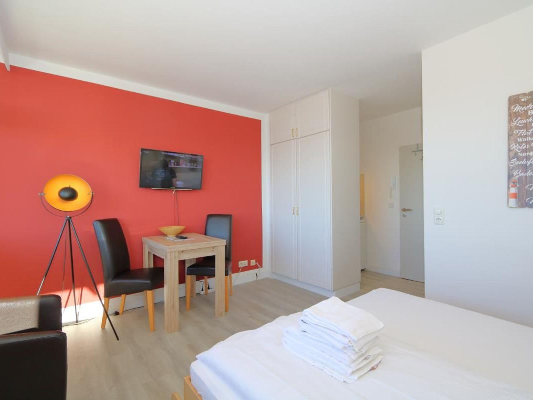 Im Wohnzimmer des Appartements stehen 2 Sessel und der Essplatz. In einer weißen Schrankwand ist das Doppelschrankbett untergebracht. Eine Pantryküche bietet die entsprechende Möglichkeit zu kochen. Das Bad hat eine Dusche. WLAN ist vorhanden.