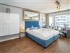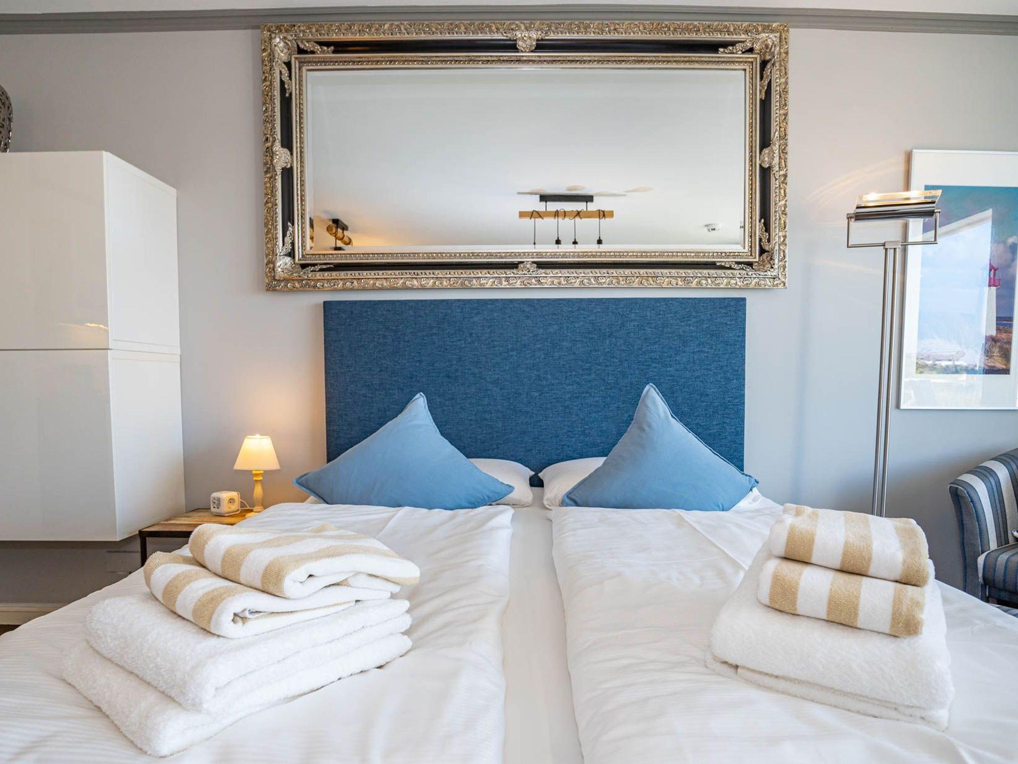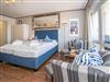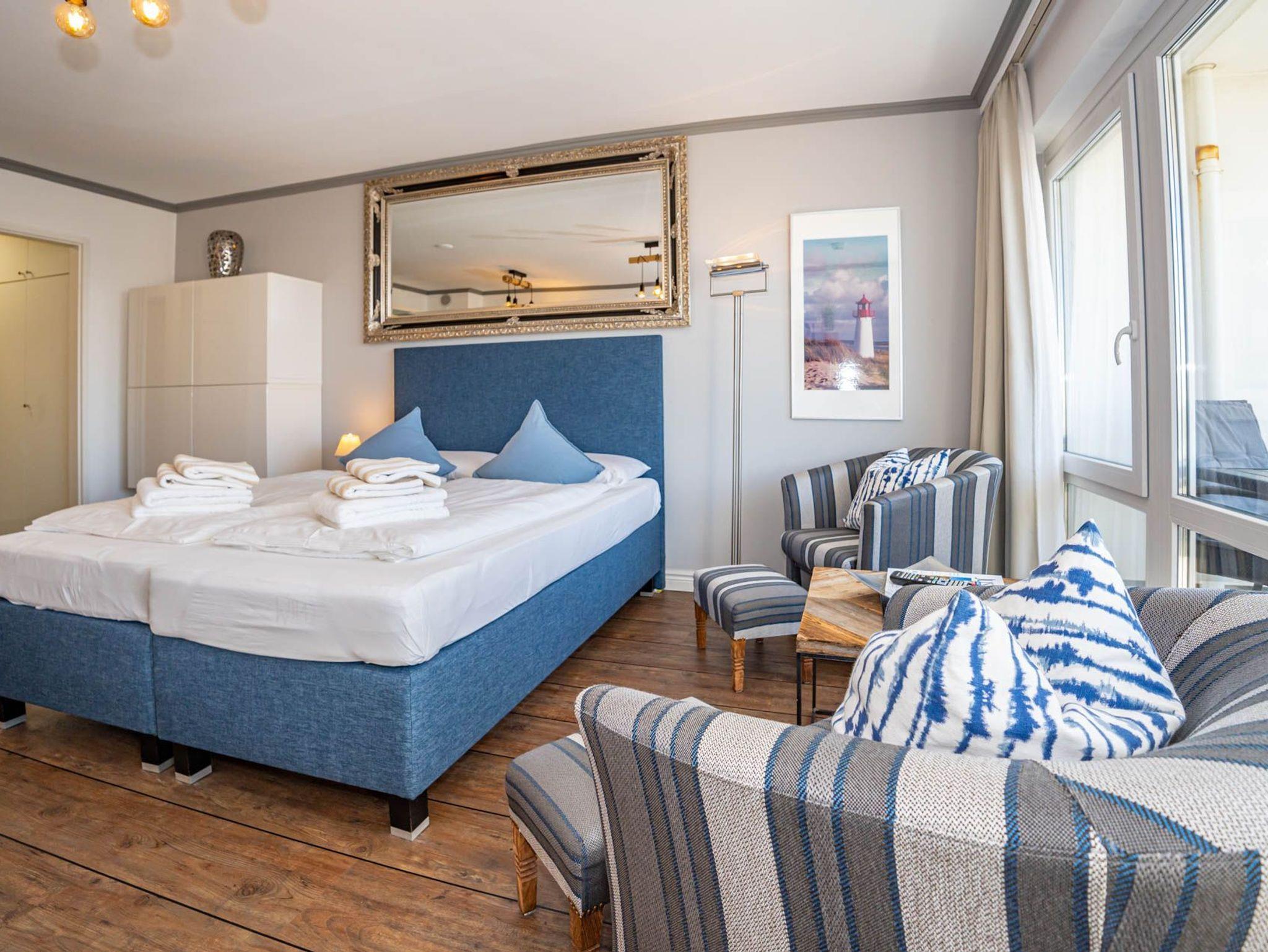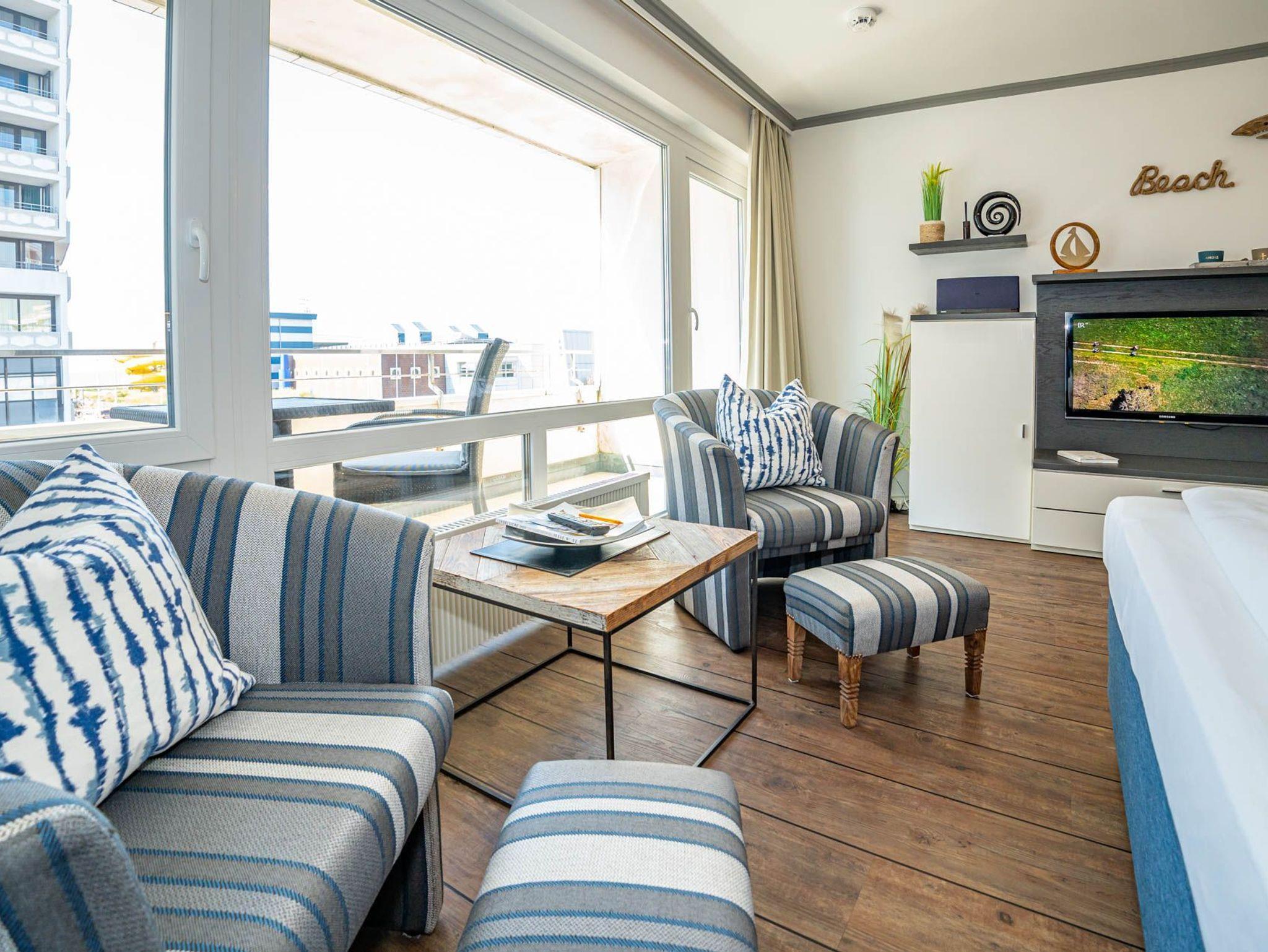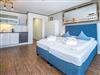 Im hellen Wohn- und Schlafbereich erwartet Sie ein neues Doppelbett (1,60 x 2,00 m), zwei bequeme Cocktailsessel mit Fußhocker sowie eine separate Essecke. Der moderne Designerboden in Holzoptik rundet das stilvolle Ambiente ab. Für Ihre Unterhaltung sorgen ein Flachbild-TV und ein Radio/CD-Gerät.