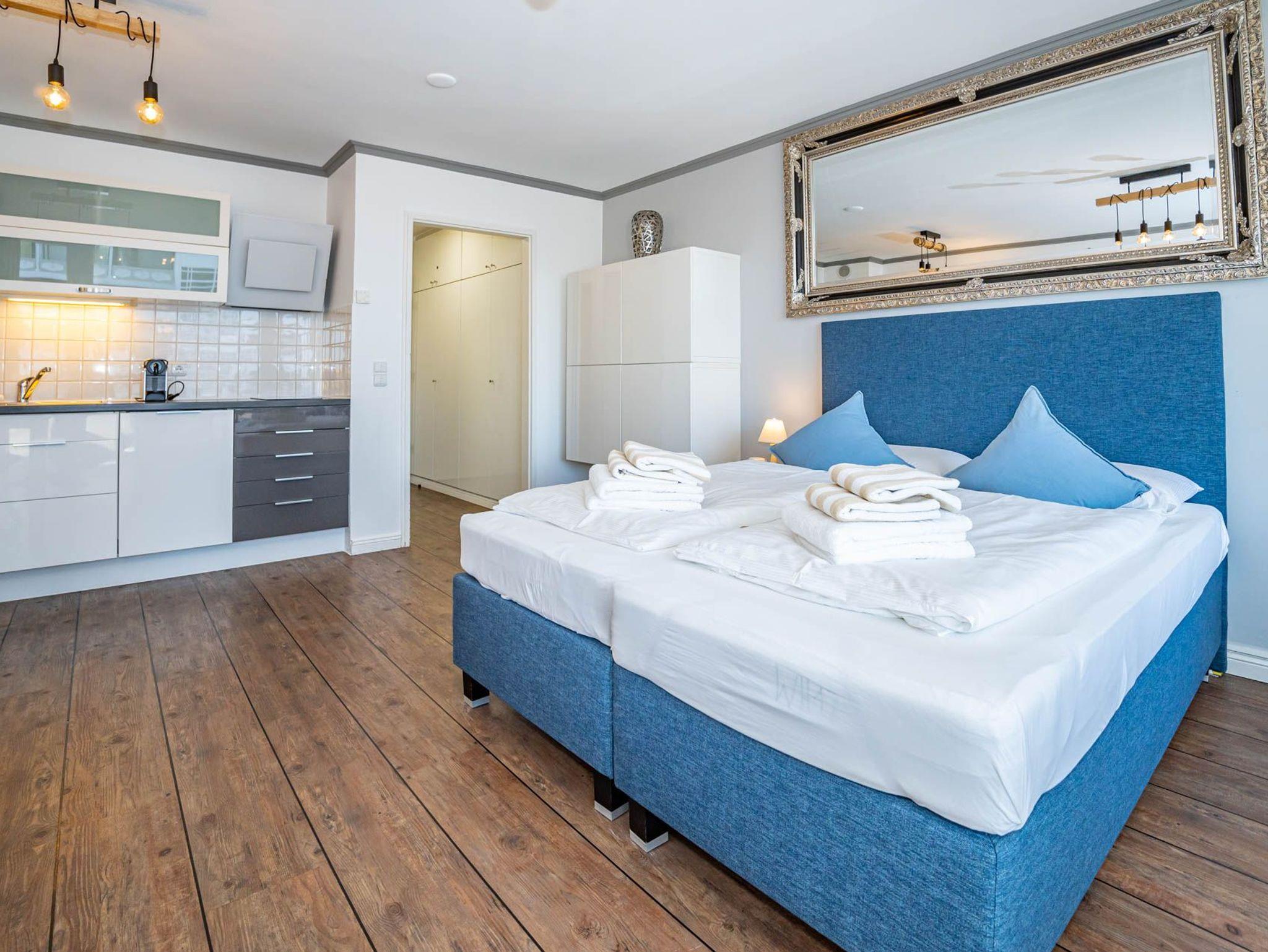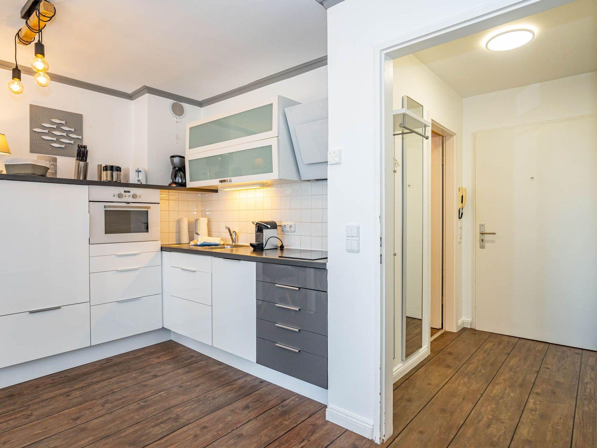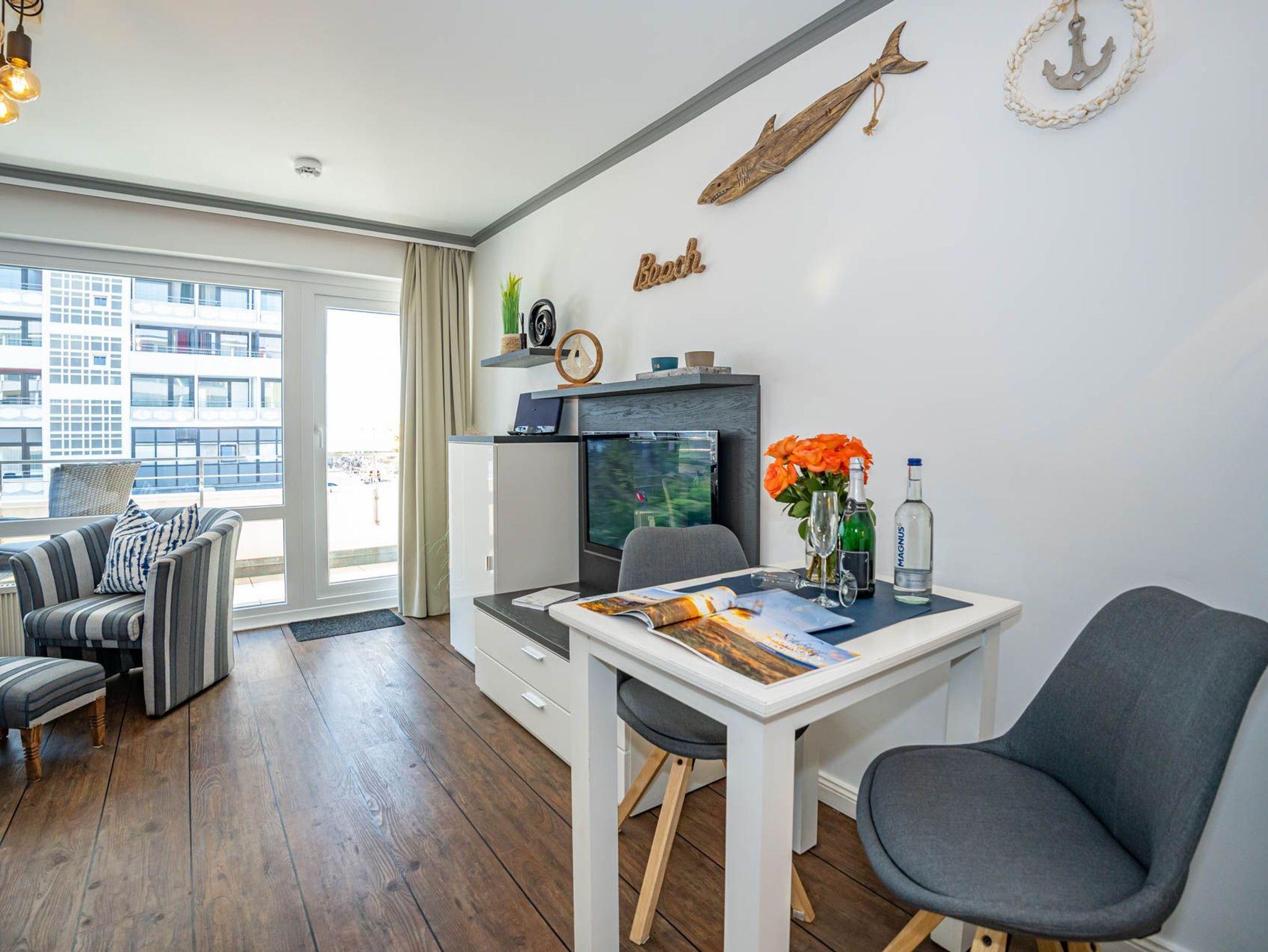 Diese gut ausgestattete und renovierte 1-Zimmer-Nichtraucher-Ferienwohnung (ca. 30 qm) bietet einen kleinen Meerblick sowie einen Westbalkon, der in der Nachmittagssonne mit bequemen Möbeln und Auflagen zu entspannten Stunden einlädt. Die Wohnung befindet sich in der 2. Etage und ist ideal für zwei Personen.