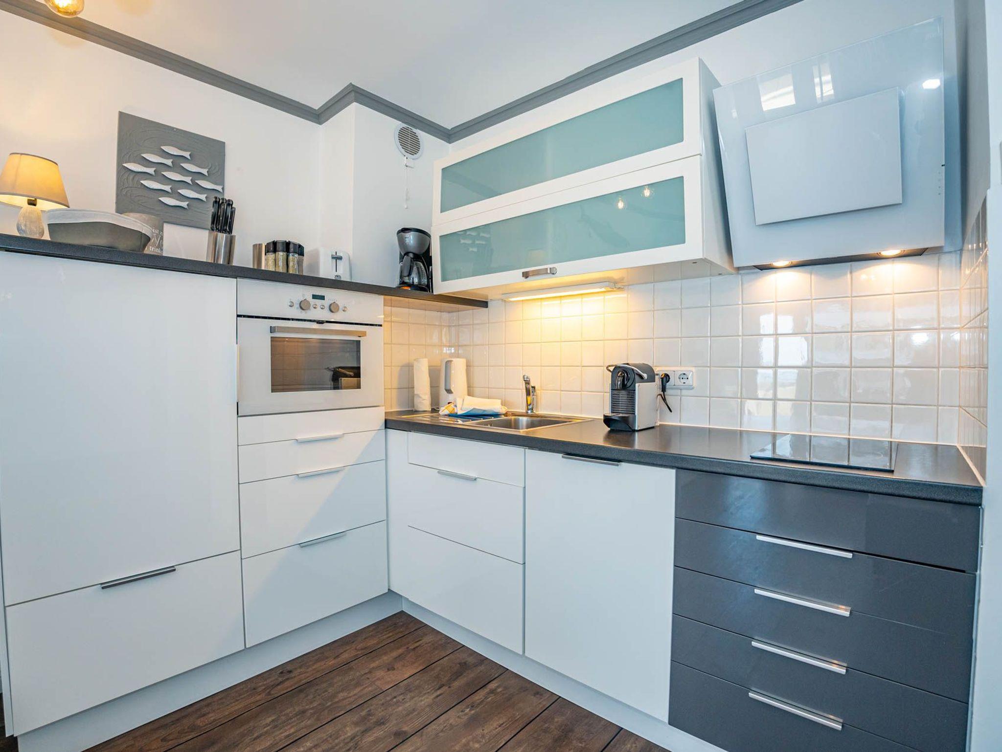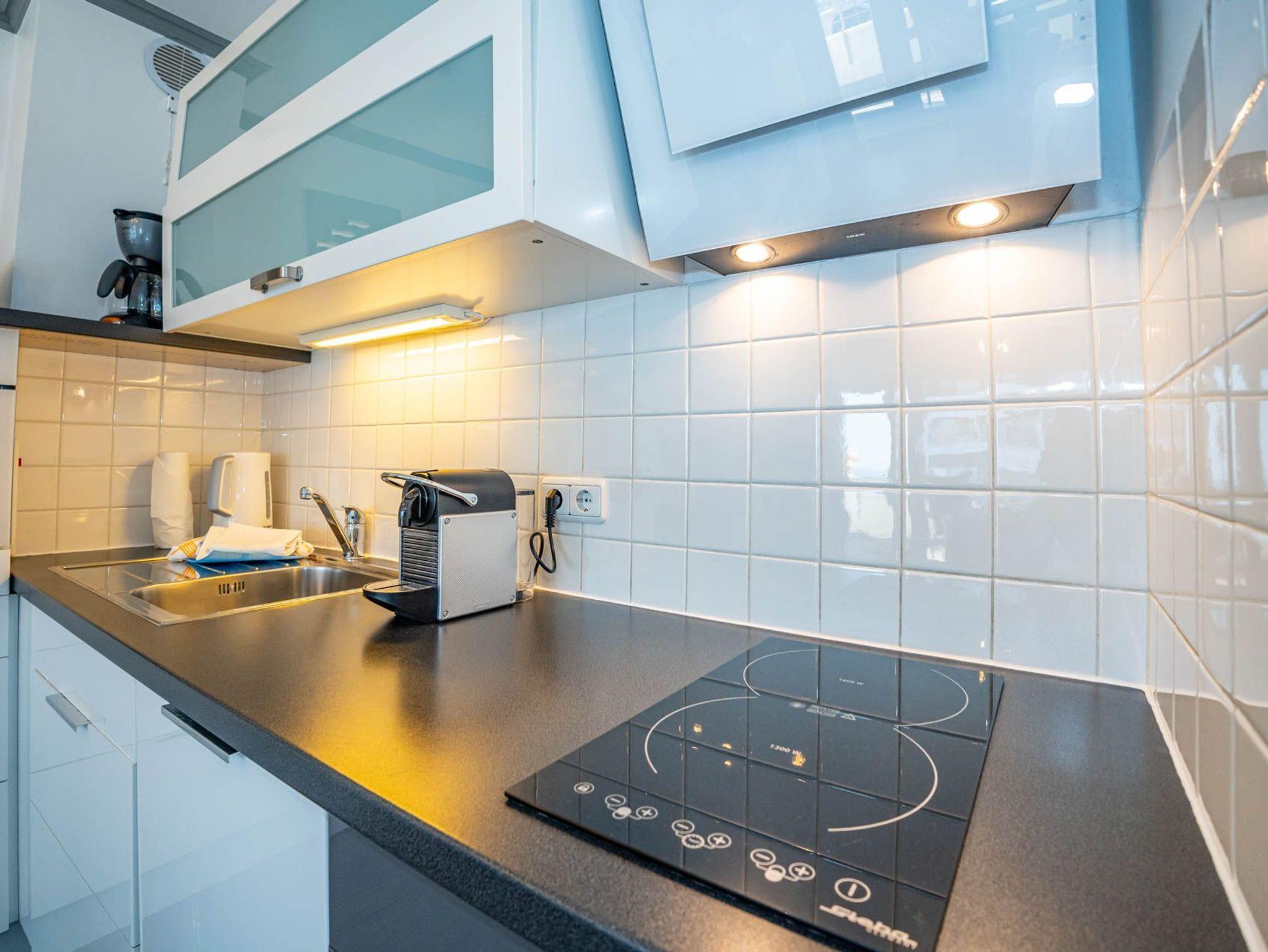Die offene Küche ist bestens ausgestattet: Neben einer Nespresso-Kapsel-Maschine, einem Geschirrspüler und einem Induktionskochfeld finden Sie auch eine Mikrowelle/Backofen-Kombination sowie eine Designer-Dunstabzugshaube. Zur Grundausstattung gehören zudem eine Kaffeemaschine, ein Wasserkocher und ein Toaster.