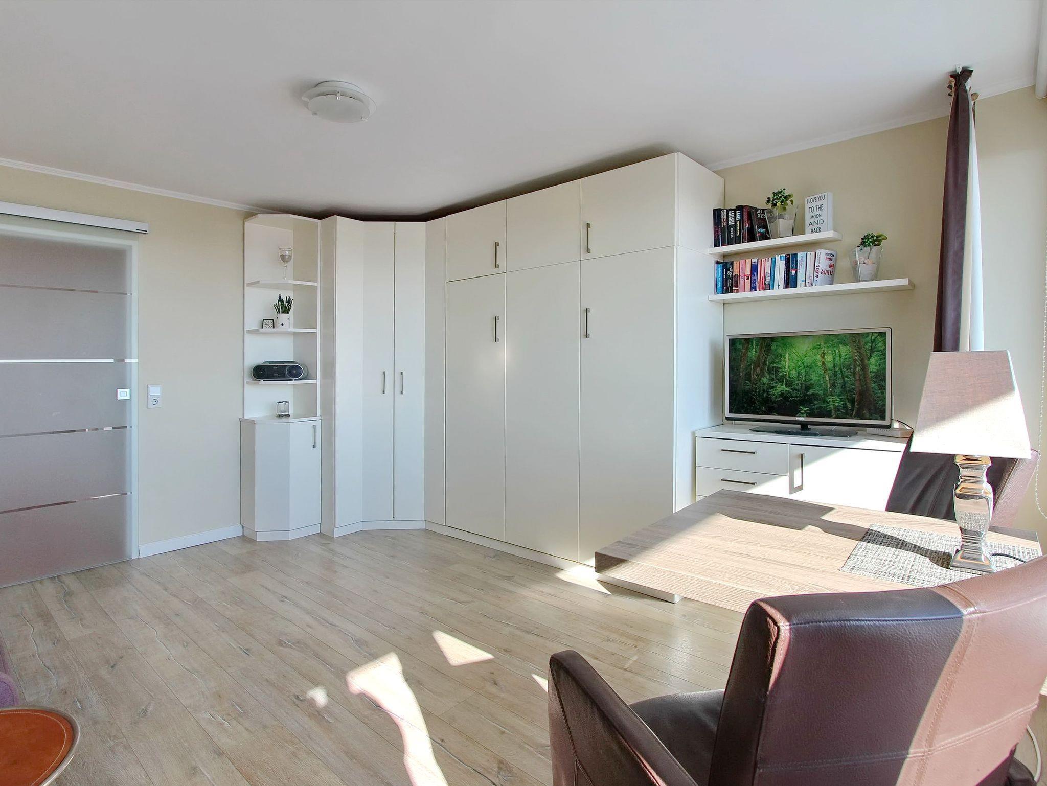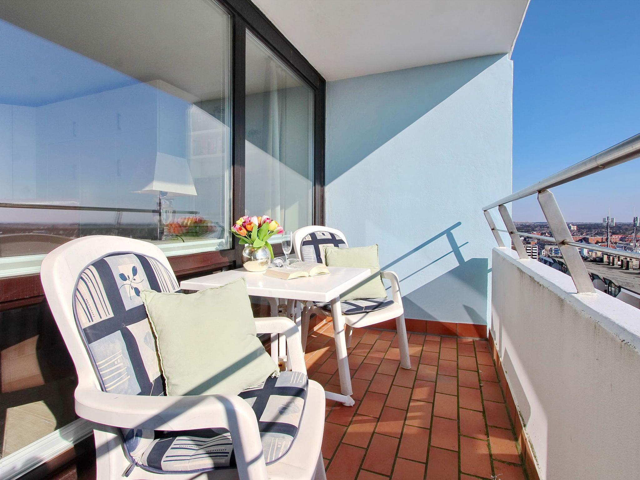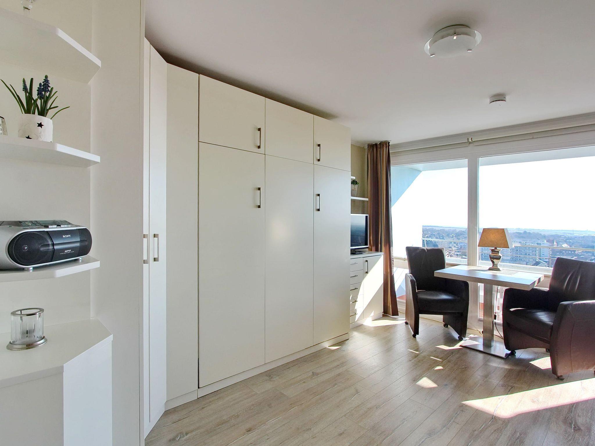Im Haus Metropol in der 12. Etage befindet sich diese wunderschöne Einzimmerwohnung. Sie hat einen herrlichen Weitblick über die Insel und die Stadt und bei klarem Wetter können Sie bis zum nordfriesischen Wattenmeer und dem Festland schauen. Der Wohn-Schlafraum mit vorgelagertem Balkon zur Ostseite (inkl. Balkonmöbeln) hat bodentiefe Fenster und ist daher lichtdurchflutet. Direkt am Fenster steht der Essplatz mit 2 bequemen Sesseln und des weiteren gibt es eine Couch und eine Schrankwand mit einem Doppelschrankbett. Stauraum für Ihre persönlichen Dinge ist vorhanden. Das Badezimmer hat eine Dusche, Handtuchtrockner und einen Fön. Die Einbauküche mit 2 Cerankochplatten befindet sich im Flur. Zur technischen Ausstattung der Wohnung gehört ein Flachbildfernseher, ein DVD Player, sowie ein Stereo-CD-Radioplayer. Ein freies WLAN Netzwerk (WEG Haus Metropol - Passwortfrei - ohne Gewähr) steht ihnen kostenfrei zur Verfügung. Diese Nichtraucherwohnung hat eine Größe von ca. 30 m².