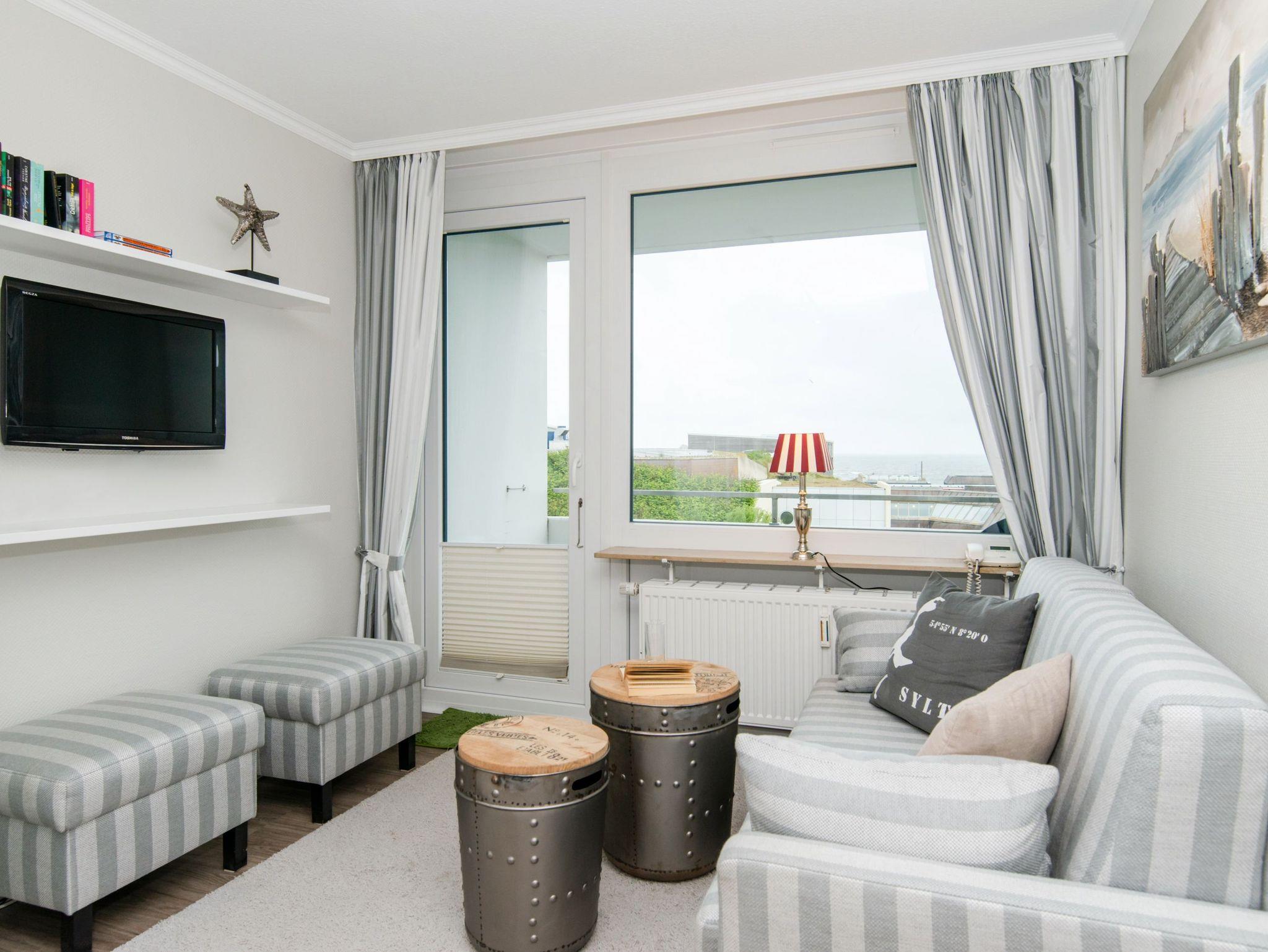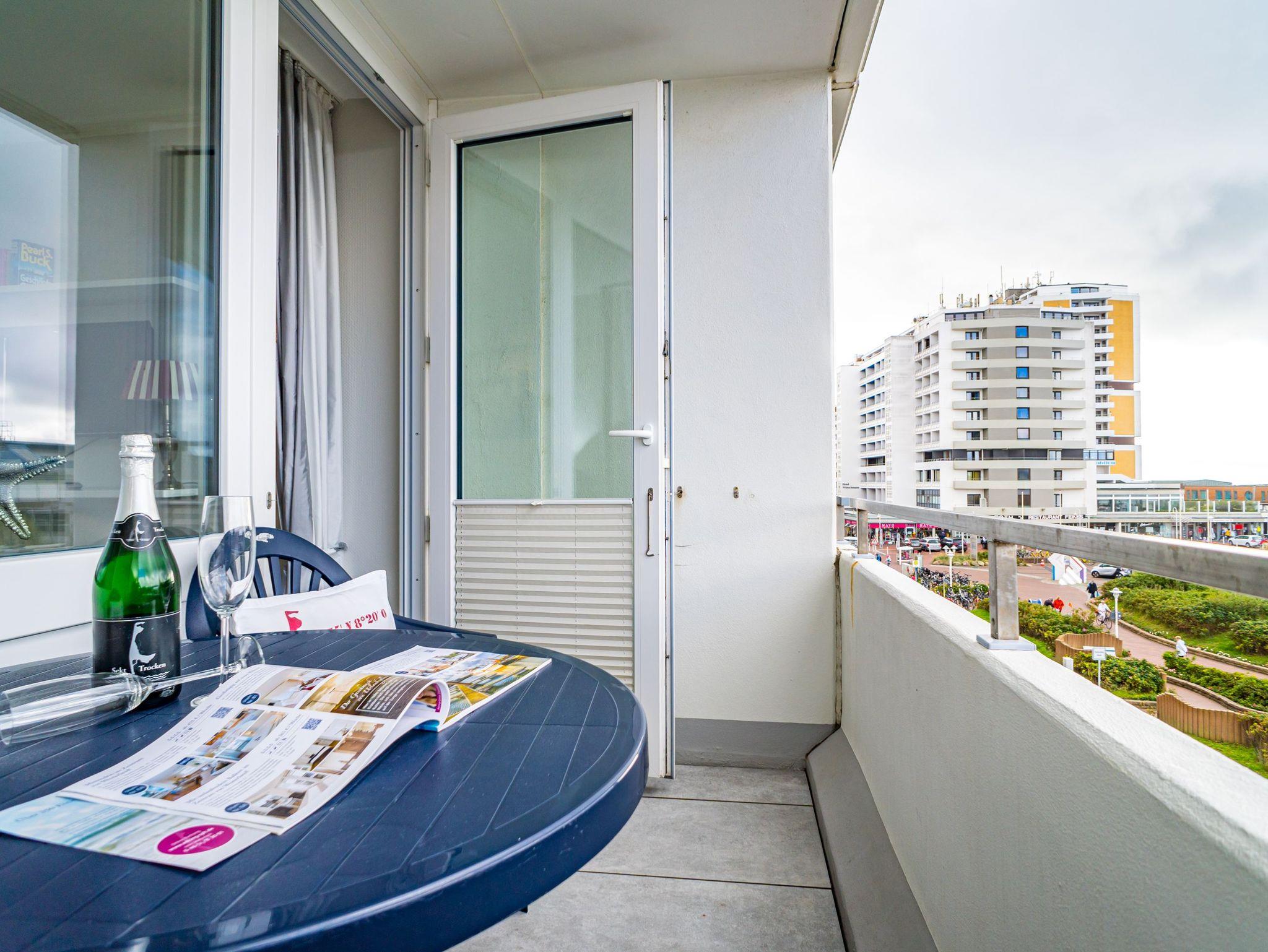 1-Zimmer-Nichtraucher-Ferienwohnung (ca. 25 qm) in der 3. Etage zur Seeseite mit Westloggia und Meerblick (Nachmittagssonne, mit Balkonmöbeln und Auflagen) für max. 2 Personen.