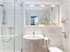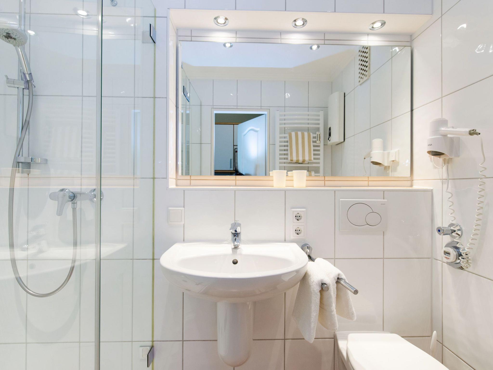 Im neuen Bad befinden sich eine flache Dusche, ein WC, ein Waschtisch, ein Handtuchtrockner und ein Fön.