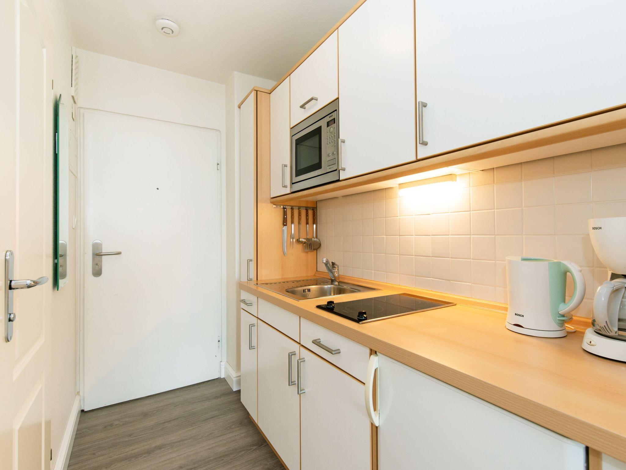 Die Küchenzeile hat eine Mikrowelle, ein Cerankochfeld und einen Kühlschrank mit 3*-Gefrierfach. Kaffeemaschine, Wasserkocher und Toaster gehören zur Grundausstattung.