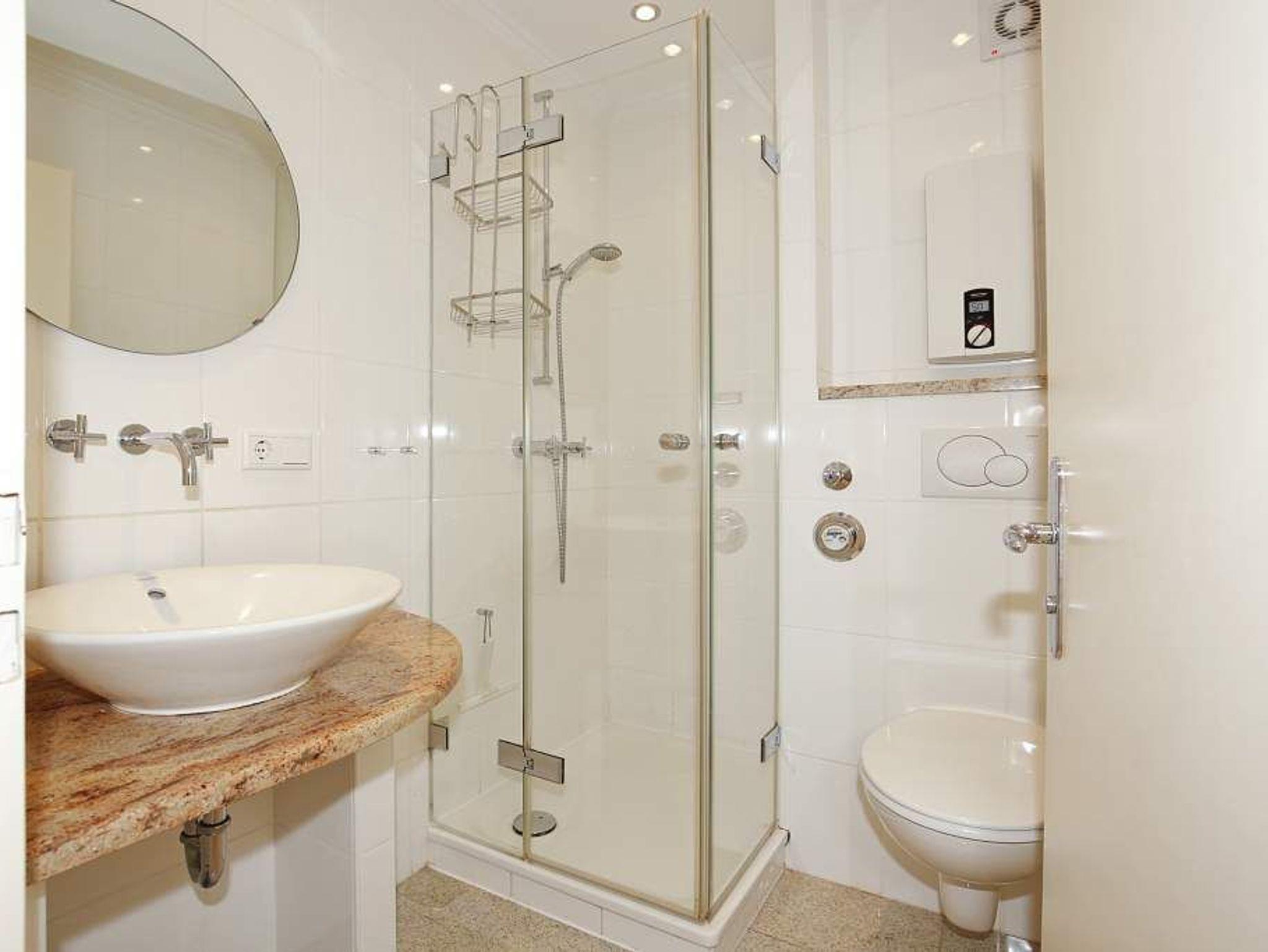 Das Badezimmer ist mit einer Dusche, einem Waschtisch, einem WC , einem Fön und einem Schminkspiegel mit Licht ausgestattet.