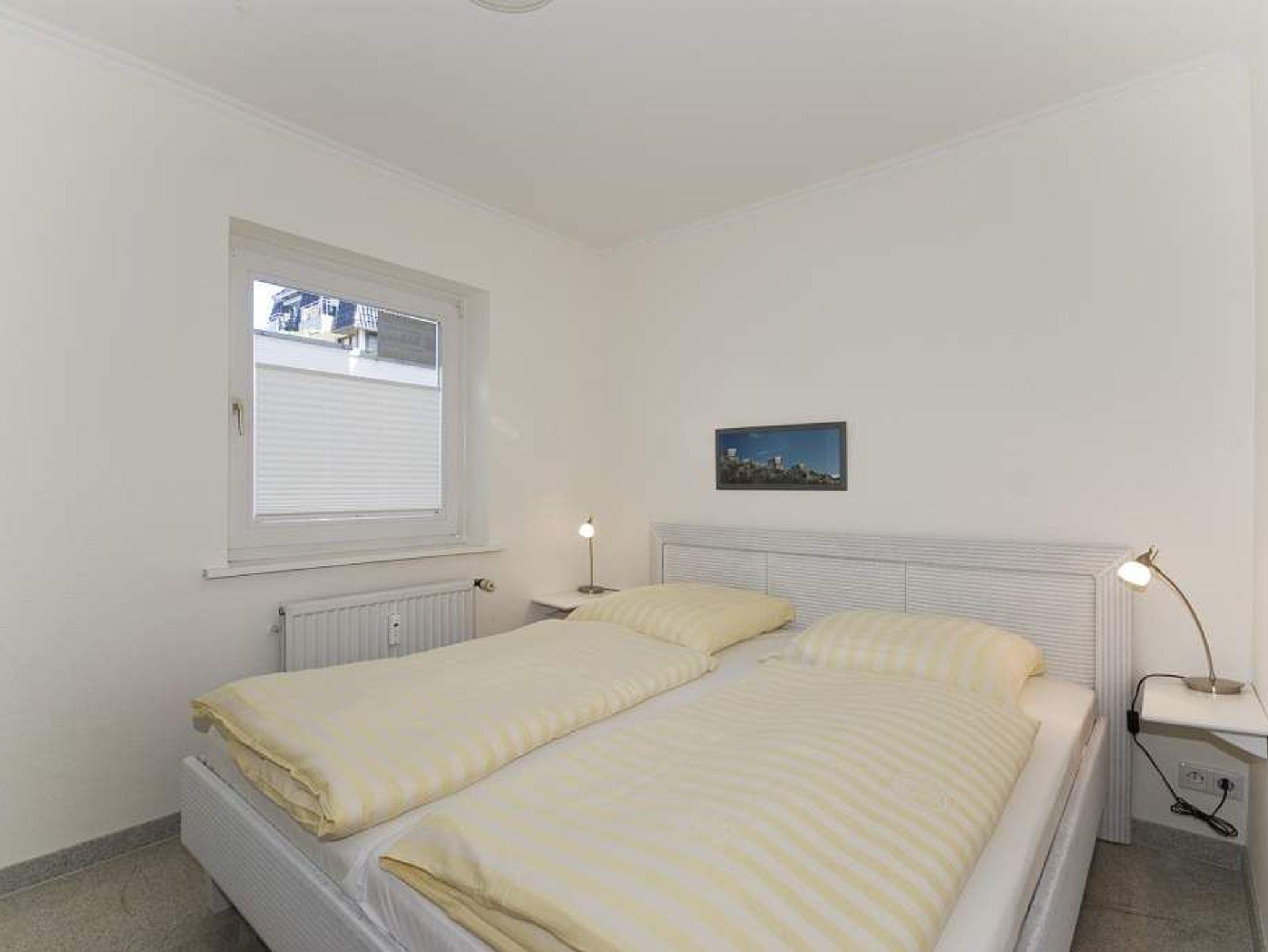 Das Schlafzimmer ist mit einem guten Doppelbett (zwei Einzelmatratzen je 0,90 x 2,00 m) und einem Wecker eingerichtet.