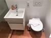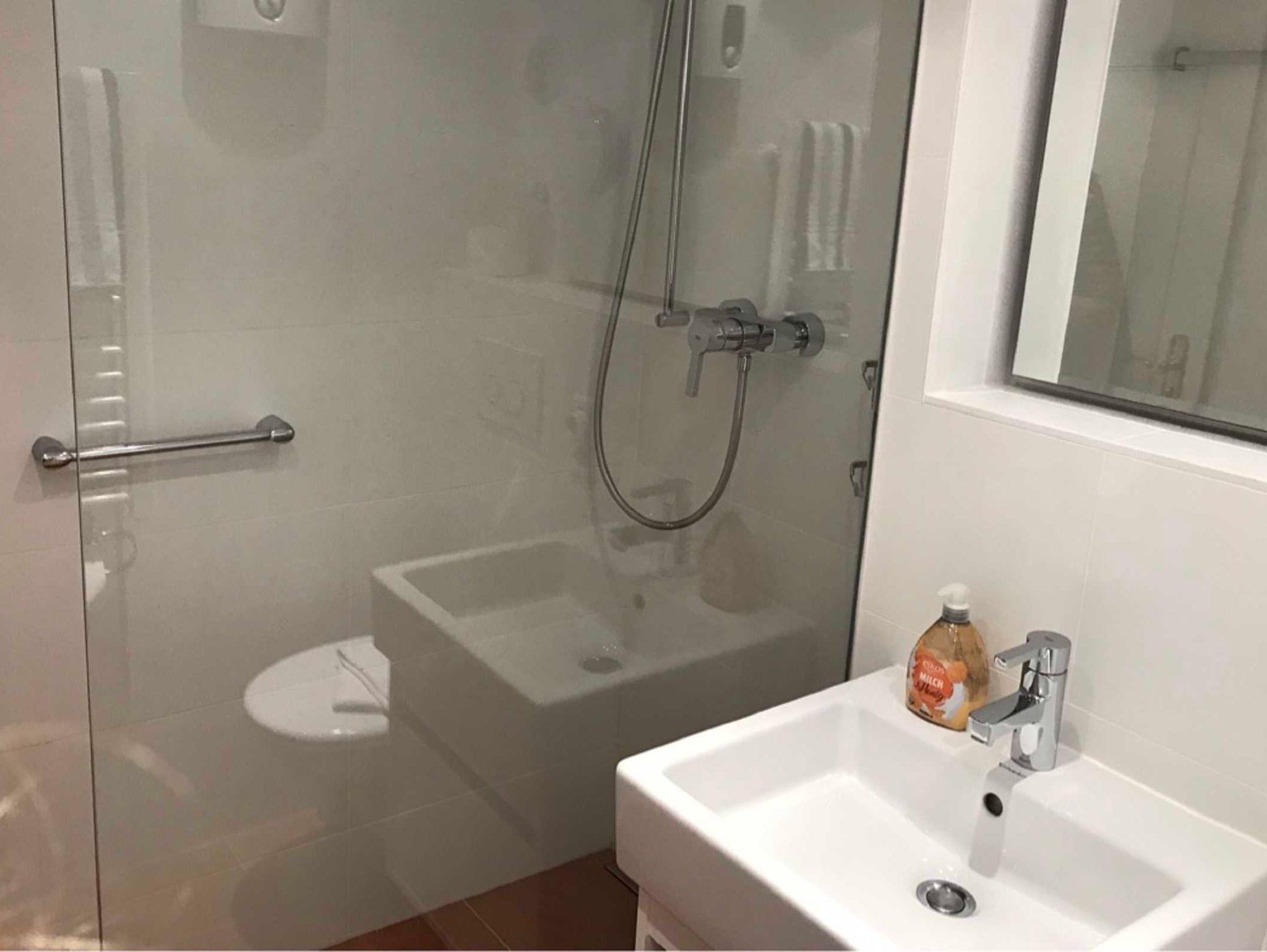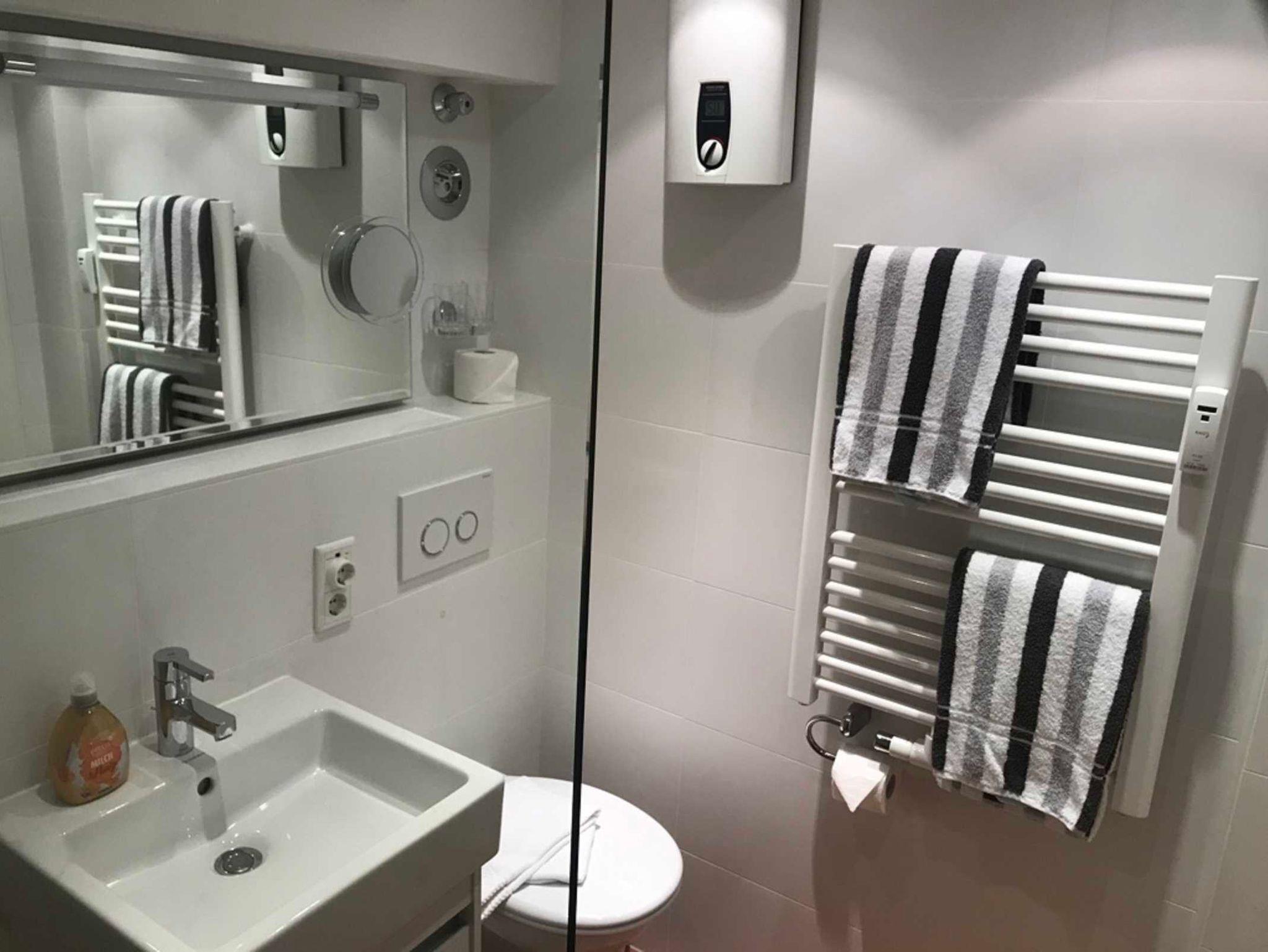 Ebenfalls im Souterrain das neue, moderne Bad mit Dusche ebenerdiger Einstieg, WC, Waschtisch, Handtuchtrockner und Fön.