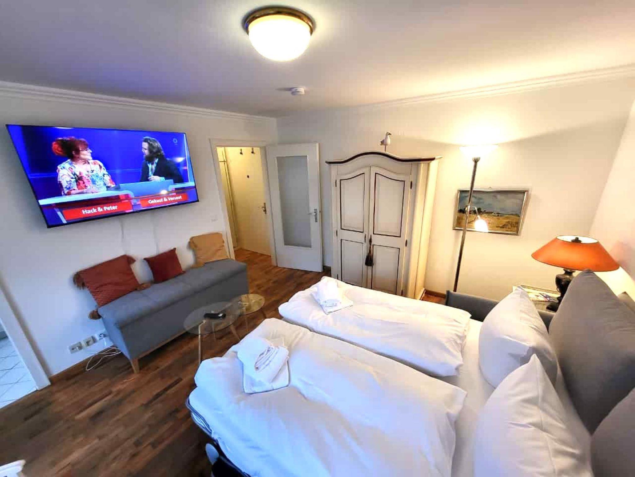 Ein kombinierter Wohn-Schlafraum mit einer hochwertigen und sehr bequemer Ausziehcouch (160x200cm), Flachbild-TV und Essecke ist der Mittelpunkt dieser Wohnung.