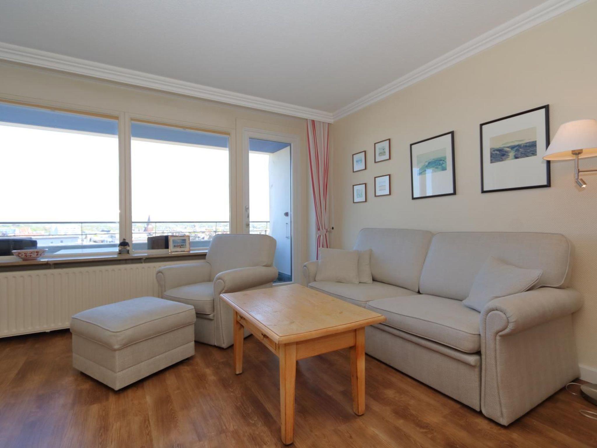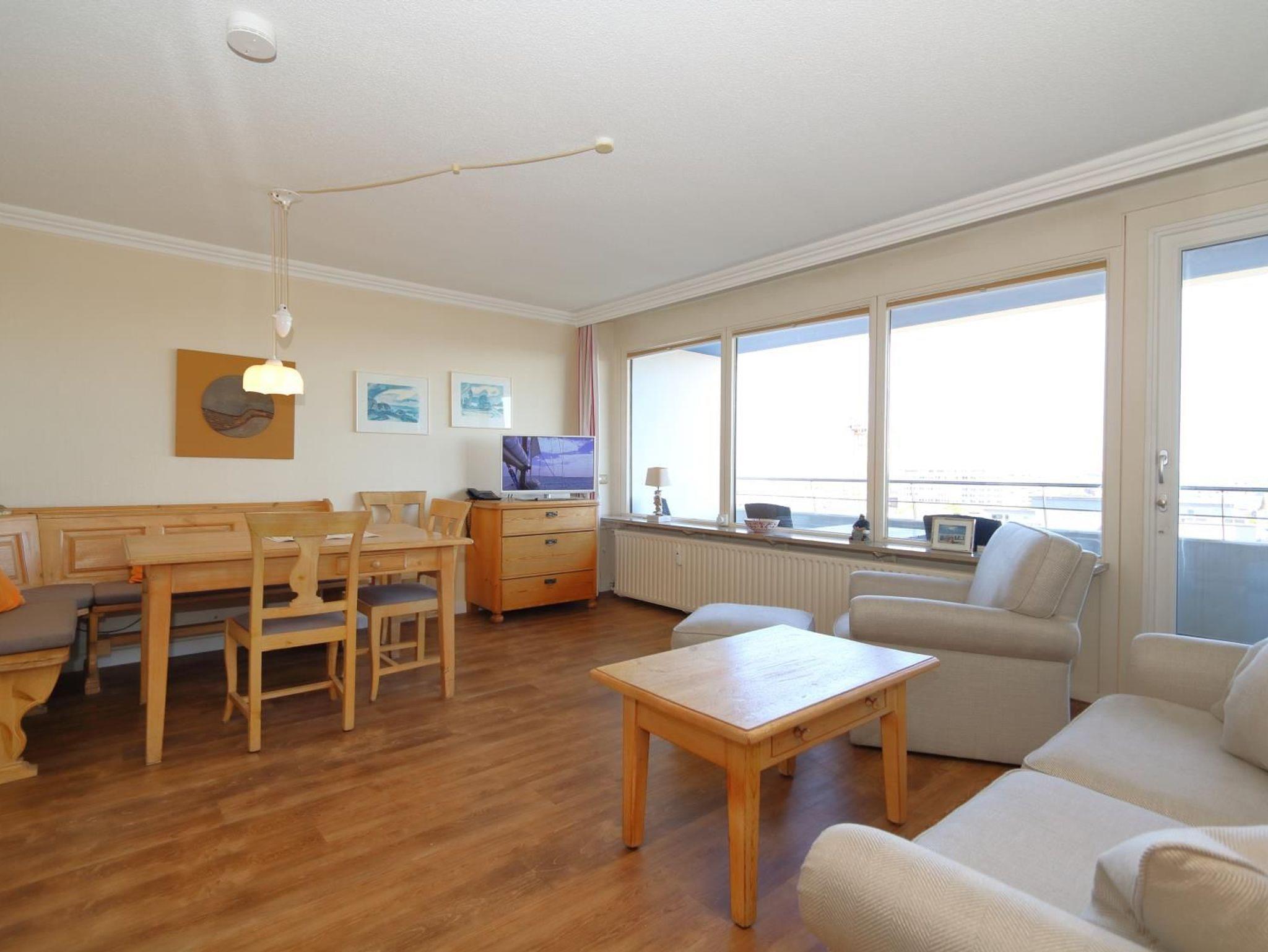 Das Appartement mit großem Ostbalkon befindet sich in der 6. Etage eines gepflegten Appartementhauses im Kurzentrum, direkt am Hauptstrand. Das Haus liegt zentral in Westerland, zwischen den beiden großen Fußgängerzonen..