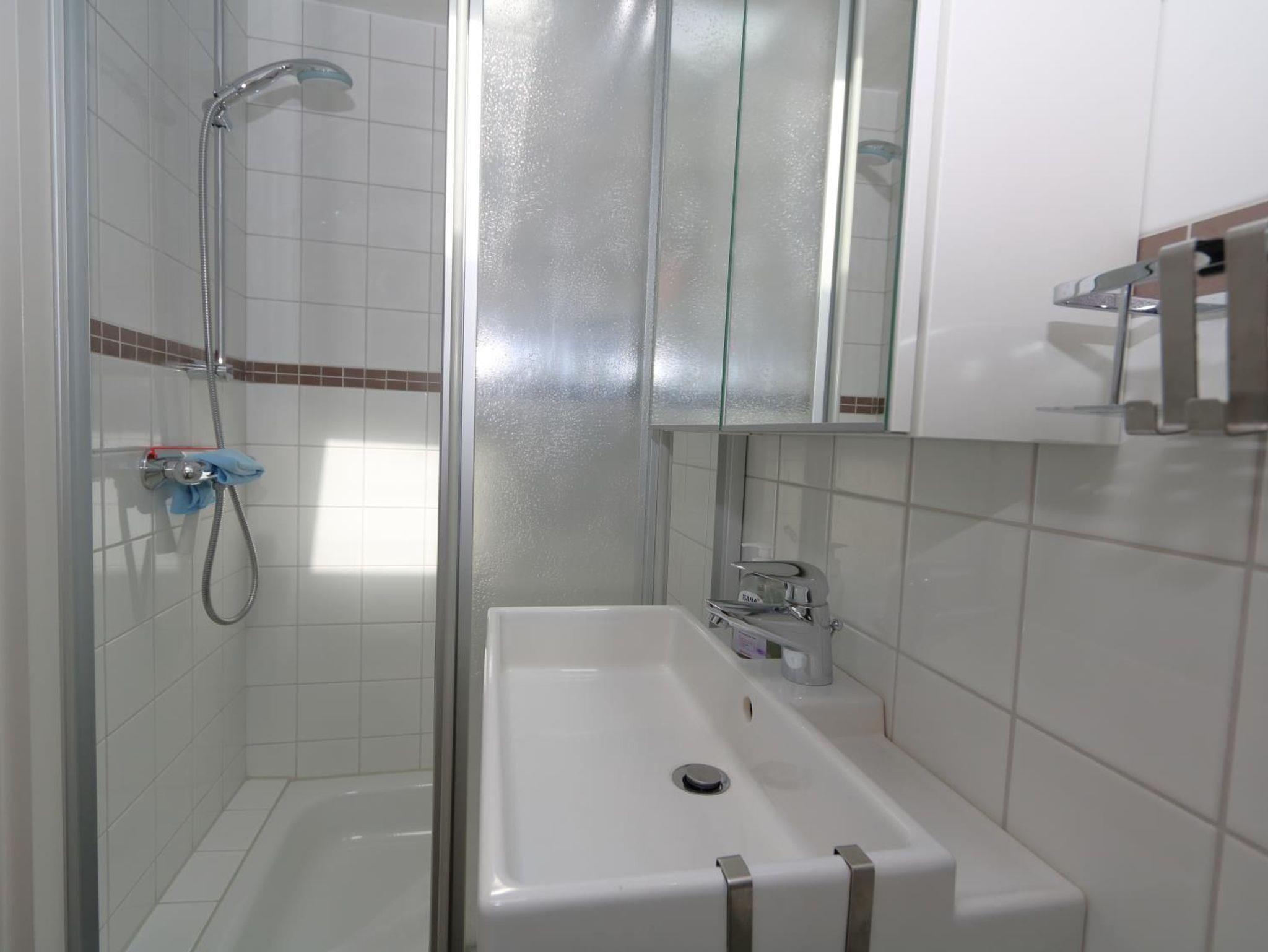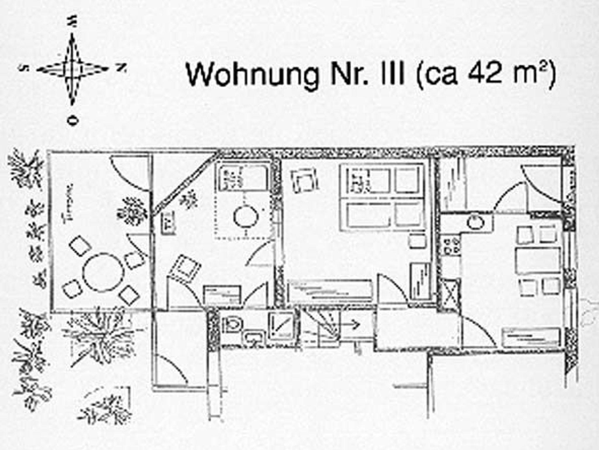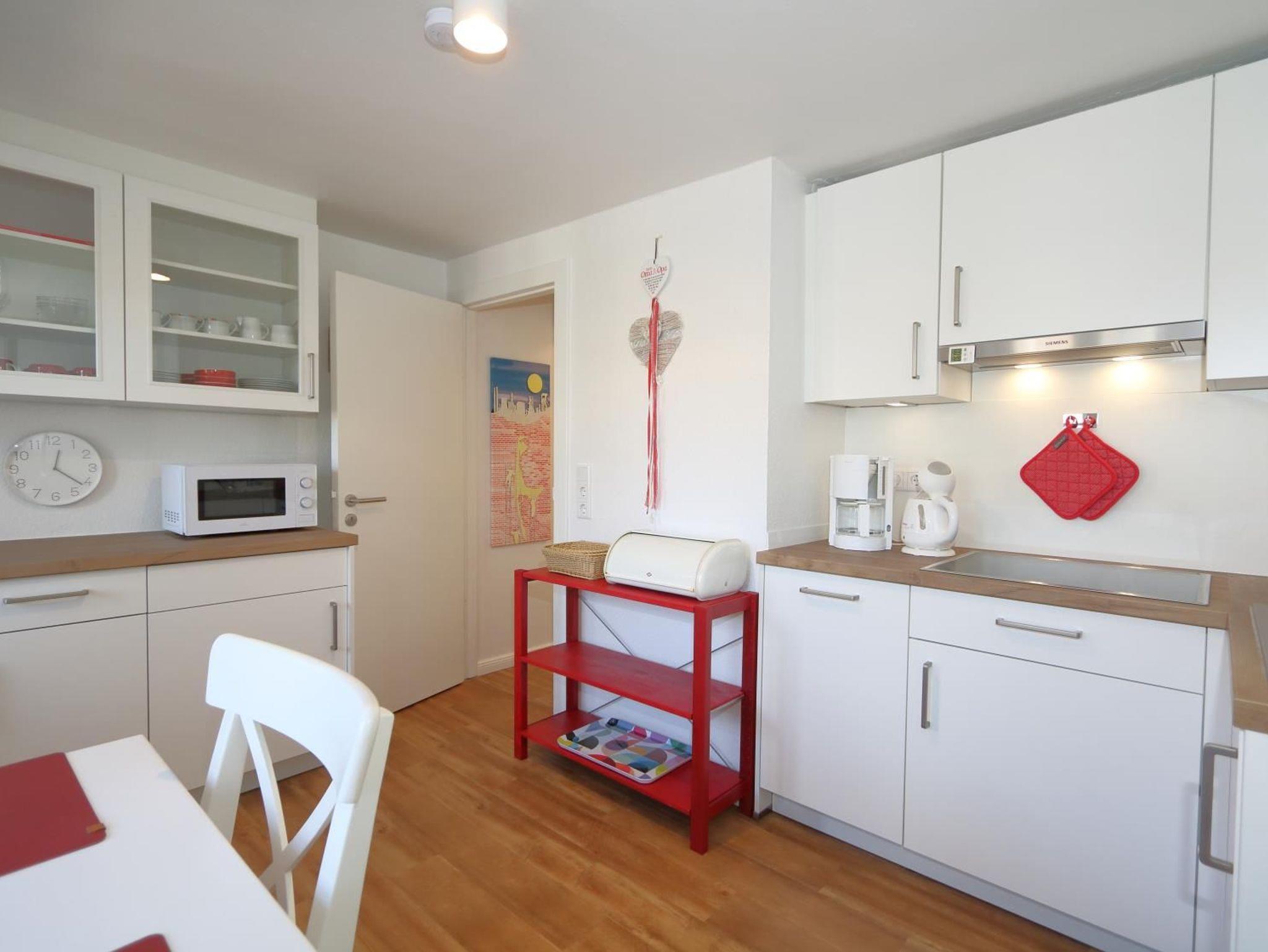 Ausstattung: Das Wohnzimmer ist mit Kabel-TV, Video, Stereo und Internetzugang ausgestattet. In der wohnlich eingerichteten Küche (Mikrowelle und Spülmaschine) ist auch der Essplatz untergebracht. Das innenliegende Schlafzimmer erhält Licht und Luft durch eine zu öffnende Lichtkuppel.Es hat ein Doppelbett und einen zusätzlichen Fernseher inkl. DVD. Das Schlafzimmer ist durch eine breite Glastür vom Wohnzimmer getrennt. Das neue Bad hat Dusche, WC und einen zusätzlichen Heizstrahler. Der vor dem Haus liegende Einstellplatz ist für den Eigentümer reserviert. Wenn dieser nicht anwesend ist, gehört er zum Appartement 2.