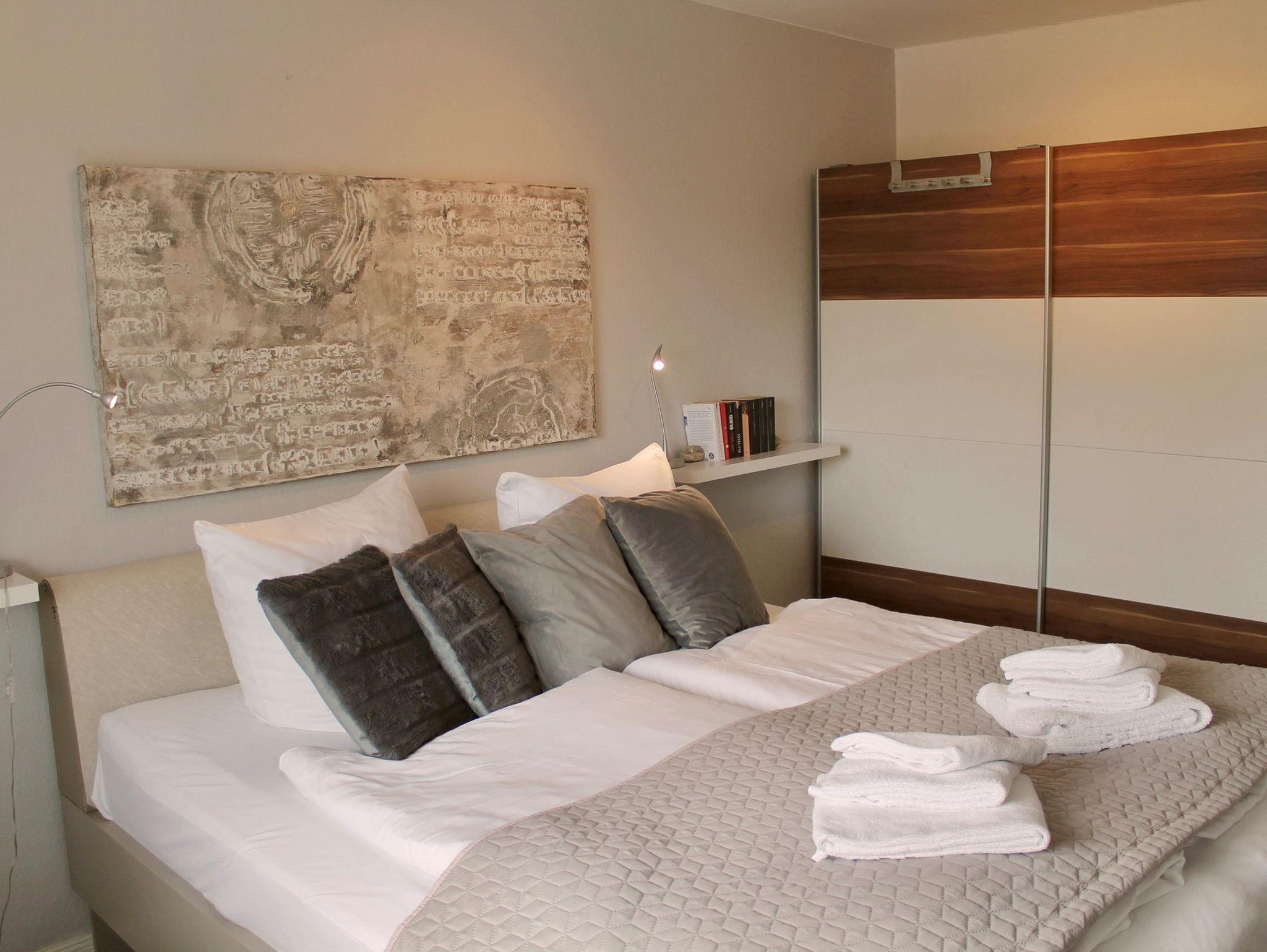 Das hell gestaltete Schlafzimmer, welches mit einem bequemen Doppelbett und einem großen Kleiderschrank ausgestattet ist, lädt Sie ein auch hier ein paar behagliche Stunden des Tages zu verbringen. Fahrstuhl sowie Schwimmbad und Sauna im Haus vorhanden.