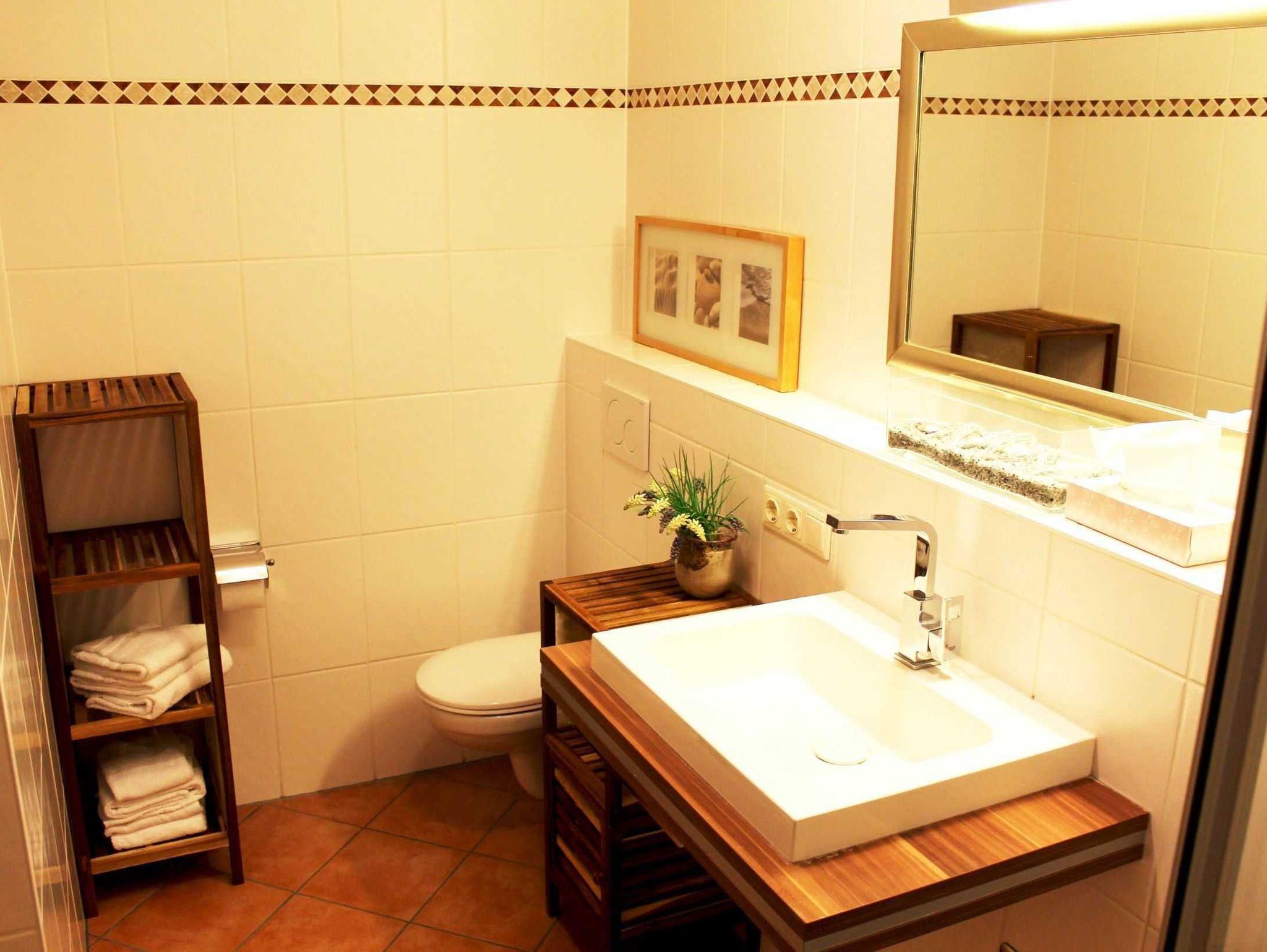 Das Appartement befindet sich im 1. Obergeschoss und ist in Richtung Westen ausgerichtet, wodurch es die letzten Sonnenstrahlen des Tages einfängt. Der Wohnbereich verfügt über ein gemütliches Schlafsofa, welches den Gast zum Erholen und Entspannen einlädt. Die integrierte, voll ausgestattete Küche lässt keine kulinarischen Wünsche offen, von der Mikrowelle bis zum Eierkocher werden Sie hier alle wichtigen Utensilien für ein gelungenes Mahl finden. Selbst für den morgendlichen Cappuccino steht eine Tassimo Kaffeemaschine bereit.
