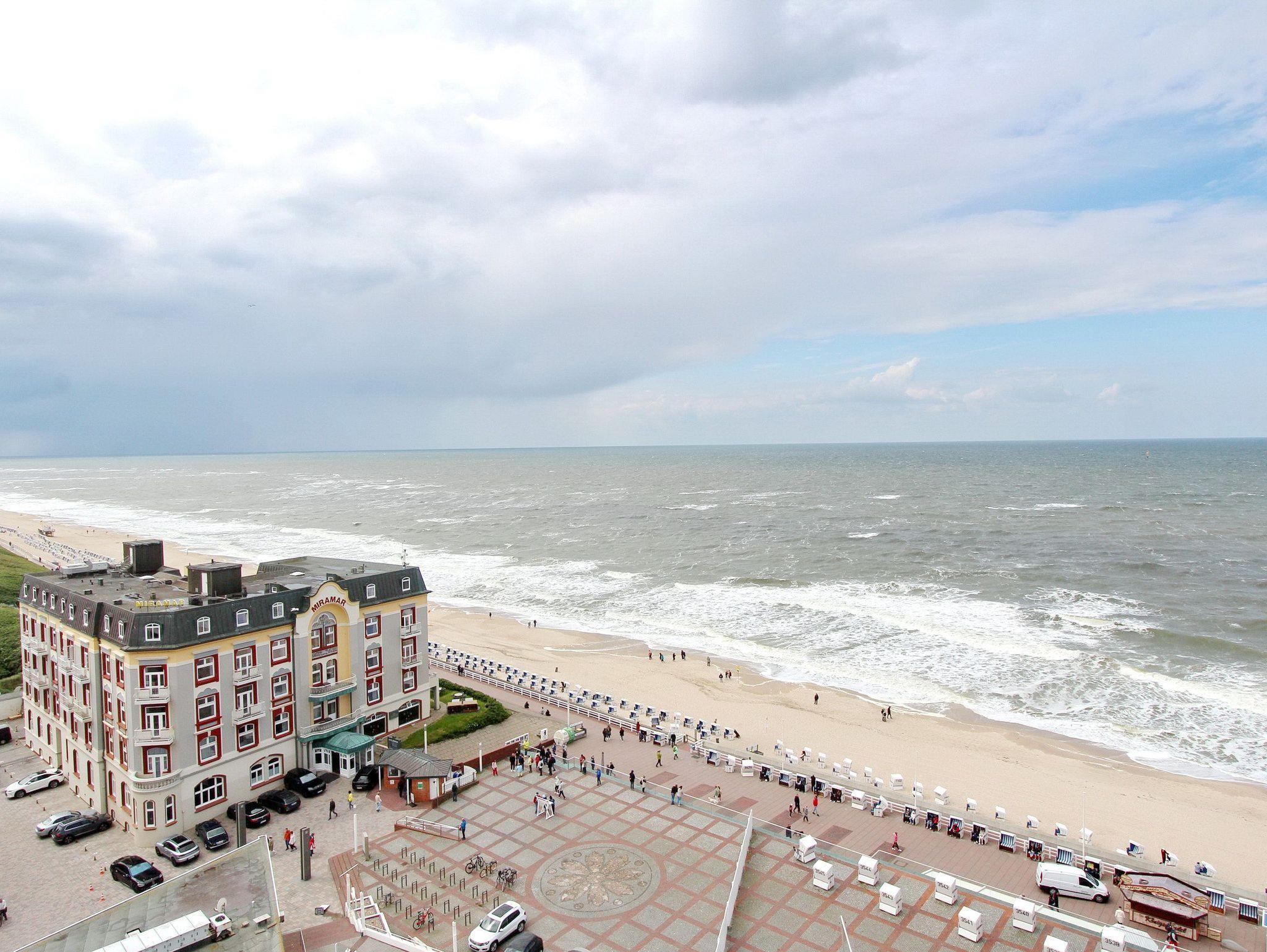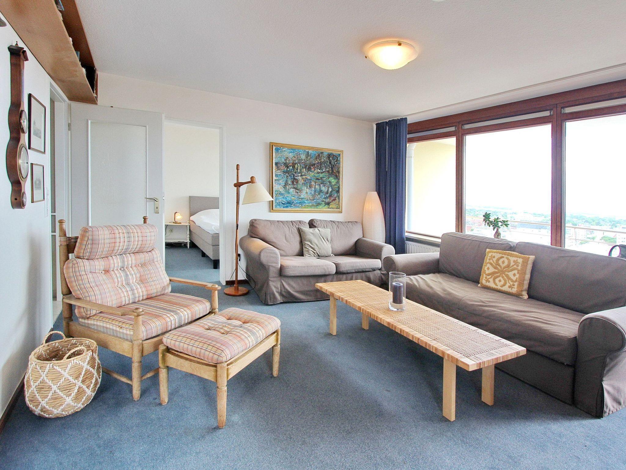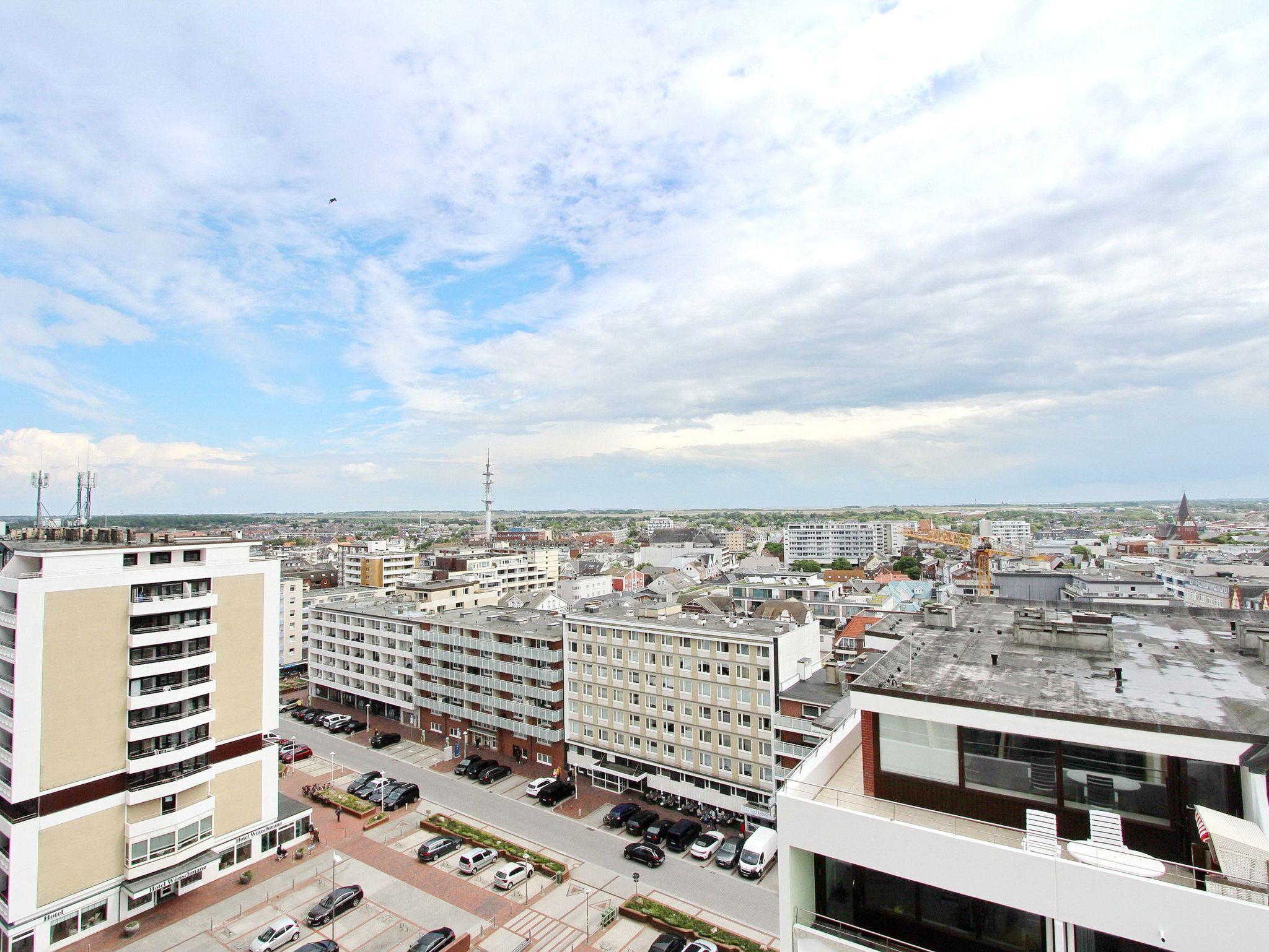 Großzügige Zweizimmerwohnung in der 10. Etage im Haus Metropol mit Blick über die Stadt und die Nordsee von einem vorgelagerten Süd- und Ostbalkon. Das Wohnzimmer hat 2 Couchen, wovon eine eine Schlafcouch für 2 Personen ist. Des weiteren gibt es einen Essplatz mit Sitzbank und 2 Stühlen. Das Schlafzimmer mit feststehendem Doppelbett hat einen eigenen Ostbalkon. Das moderne Badezimmer hat eine Dusche mit flachem Einstieg und viel Ablagefläche und Stauraum für Ihre persönlichen Dinge. In der separaten Küche gibt es einen Backofen und eine Durchreiche zum Essplatz. Zur technischen Ausstattung gehört: ein Flachbildfernseher, ein VHS Player und ein Radio. Ein freies WLAN Netzwerk (WEG Haus Metropol - Passwortfrei - ohne Gewähr) steht ihnen kostenfrei zur Verfügung. Haustiere nicht gestattet. Diese Nichtraucherwohnung hat eine Größe von ca. 74 m².