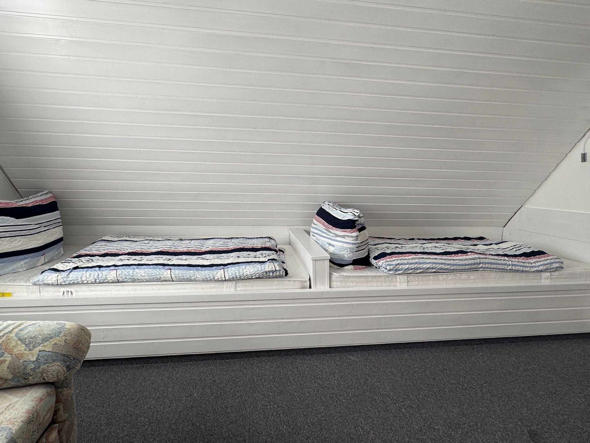 Ein kombinierter Wohn-Schlafraum mit Sitzgarnitur, Flachbild-TV hintereinanderstehenden Kojenbetten(80cm x 190cm).