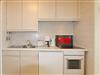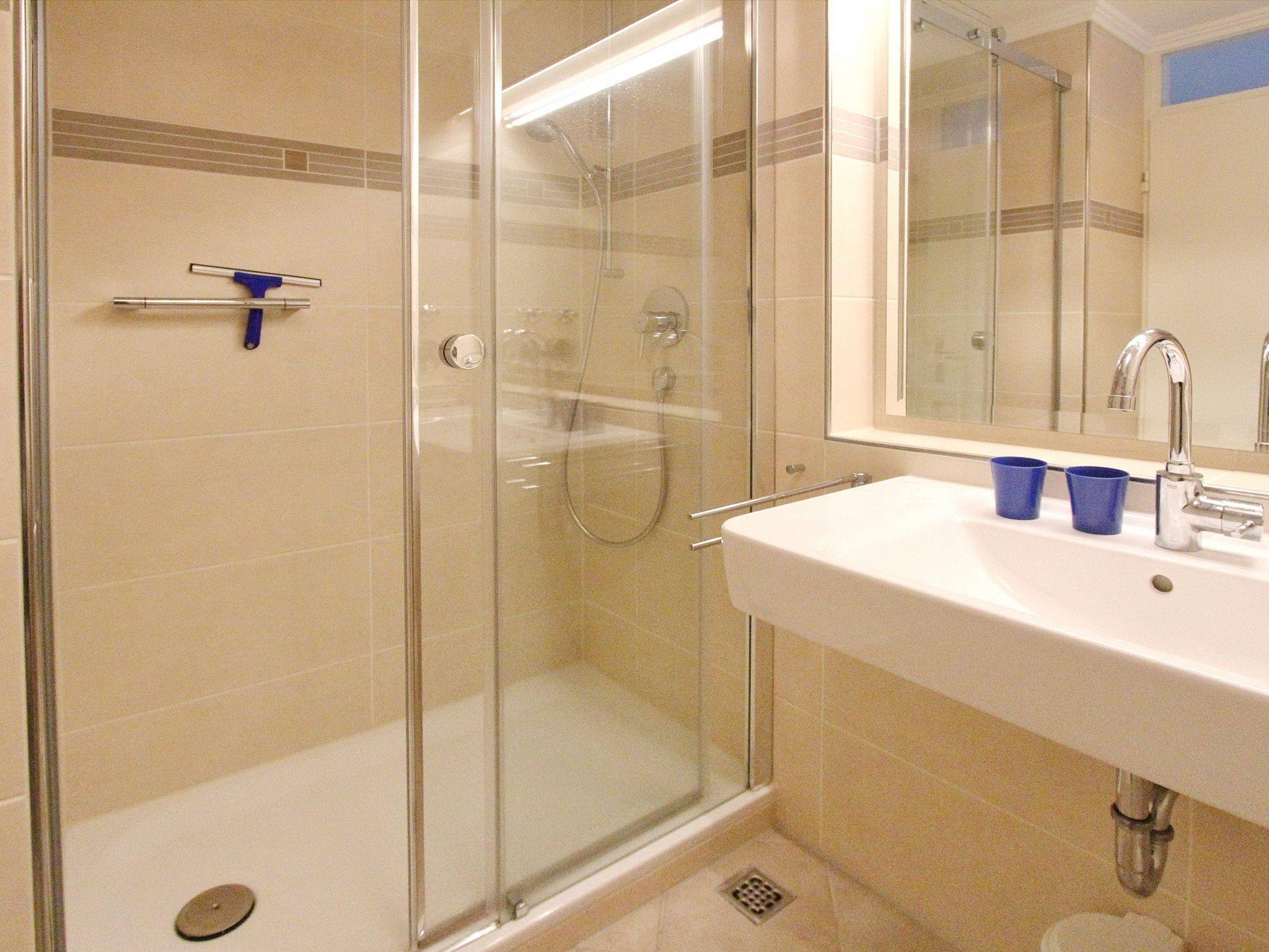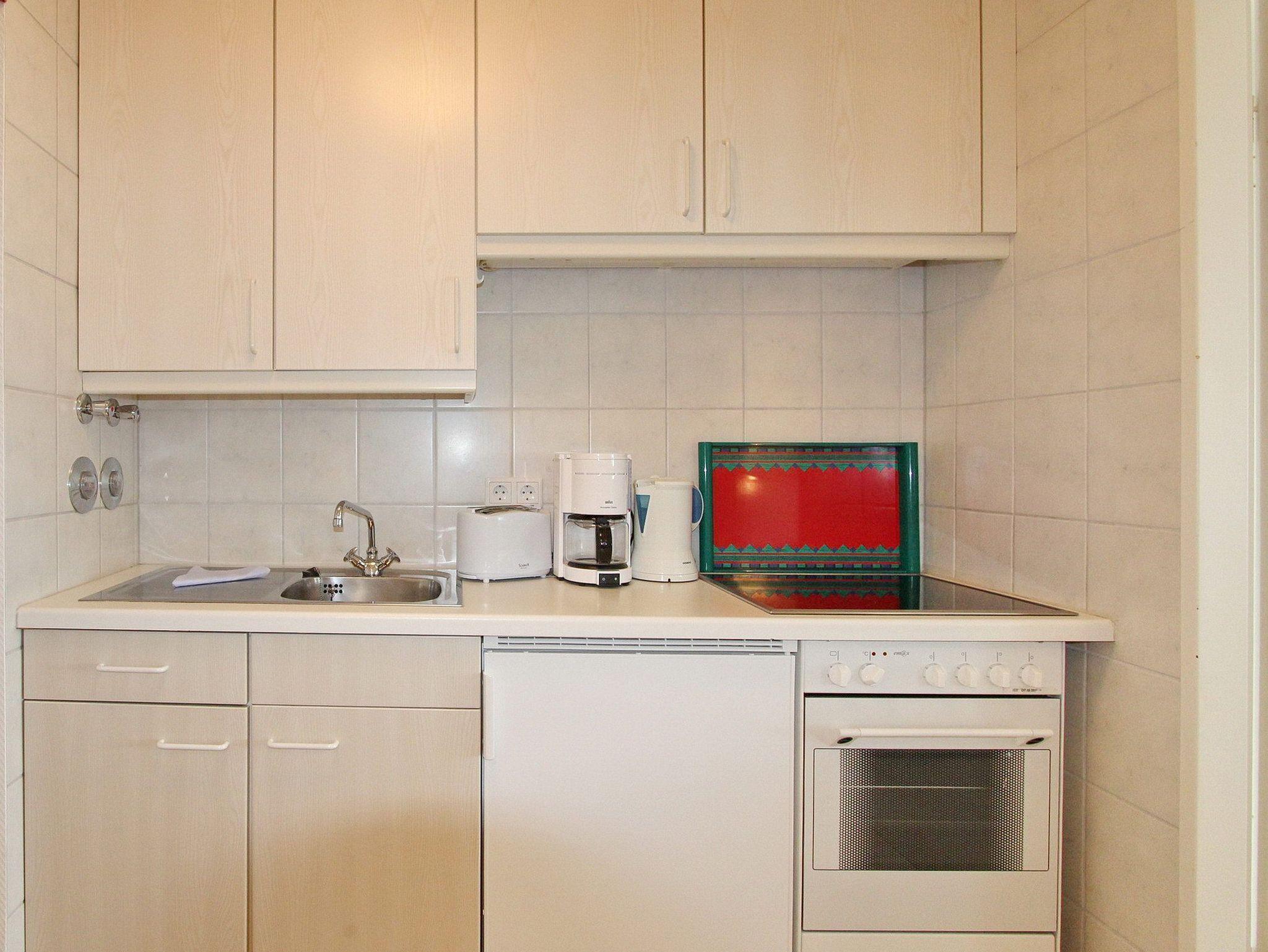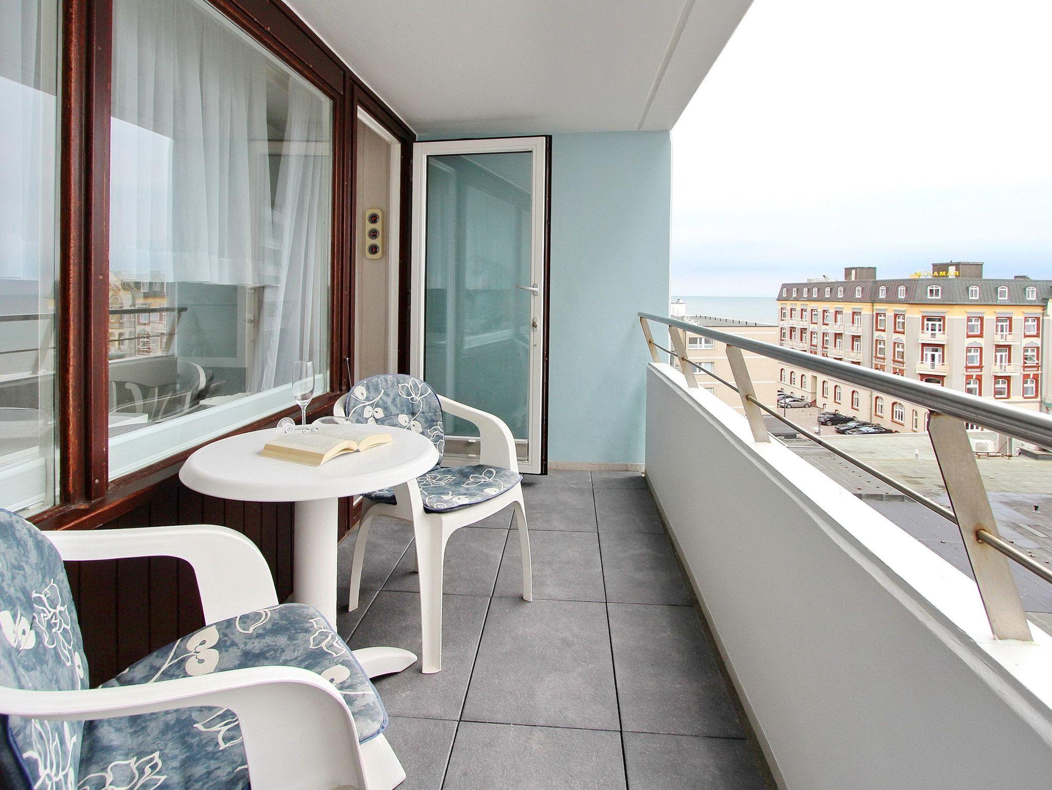Einzimmerwohnung der 4. Etage im Haus am Meer mit Blick auf die Nordsee. Der kombinierte Wohn-/Schlafraum mit vorgelagertem Westbalkon (Balkonmöbel und Auflagen sind vorhanden), verfügt über Einzelschrankbetten (mit Besucherritze), einen Essplatz am Fenster mit 2 Stühlen und einer Sitzgruppe mit Sofa und Relaxsessel. Das Badezimmer hat einen Handtuchtrockner, Fön und eine Dusche mit einem flachen Einstieg. In der Küchenzeile mit Backofen und Ceranfeld können sie kleine Mahlzeiten zubereiten. Zur technischen Ausstattung gehört: ein Flachbildfernseher und ein Nostalgieradio. Ein kostenfreier Zugang zum WLAN Hot Spot (WEG Haus am Meer - Passwortfrei - ohne Gewähr) kann genutzt werden. Wohnungsgröße: ca. 34 m².