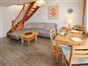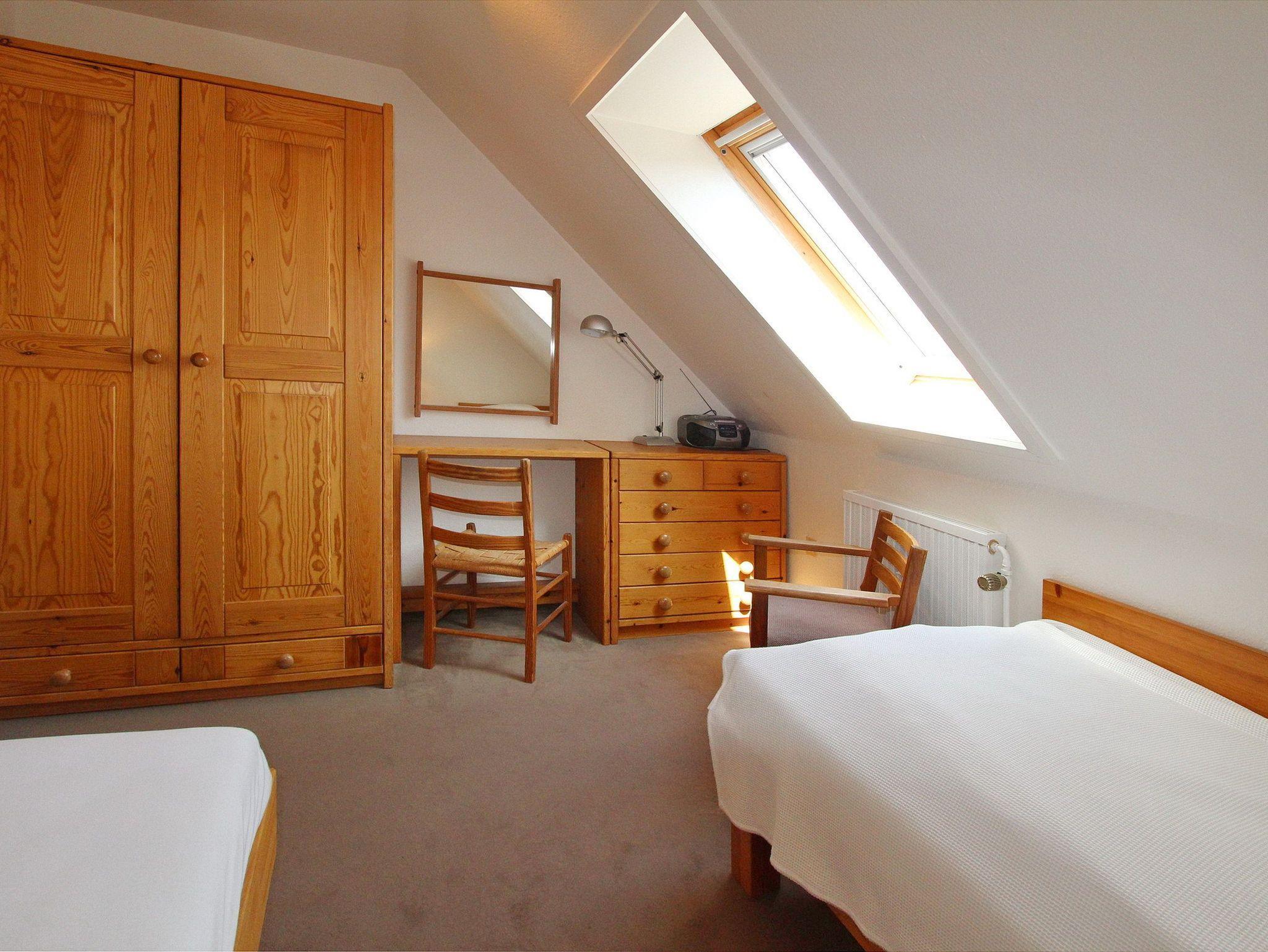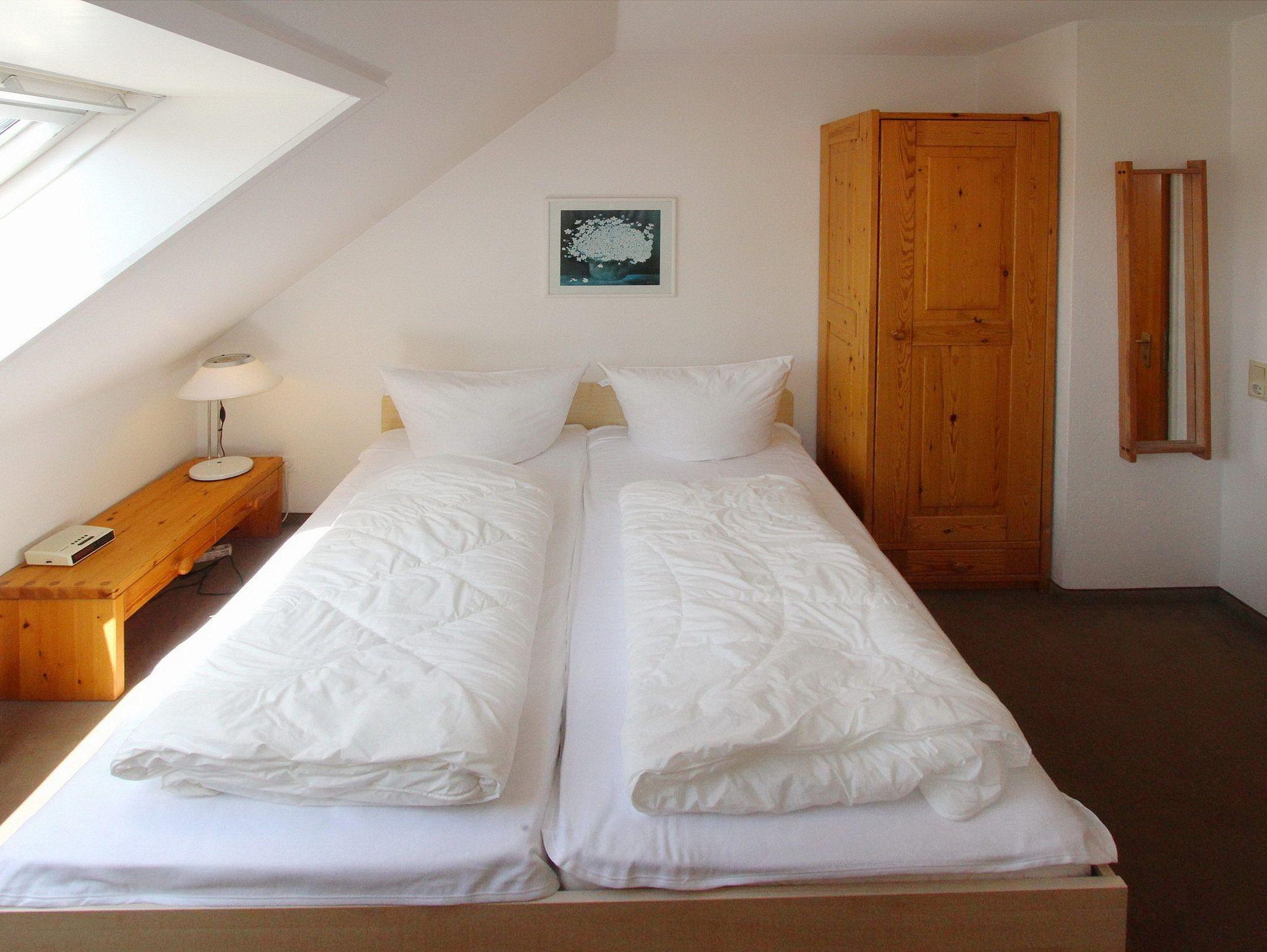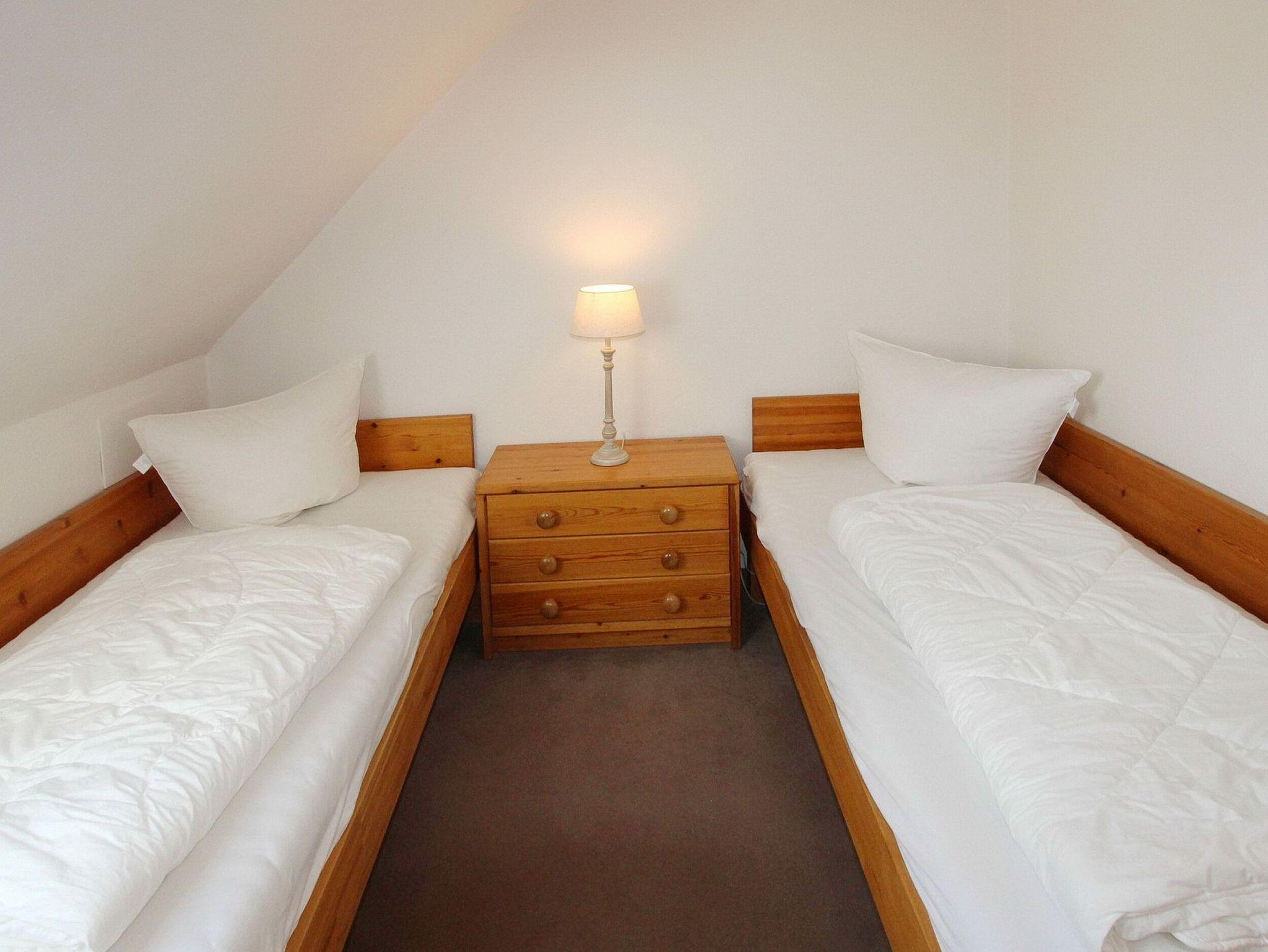 Im Haus Winora in der 3. Etage befindet sich diese 3 Zimmer Maisonettewohnung. Das Wohnzimmer mit vorgelagertem Westbalkon (Balkonmöbel mit Auflagen sind vorhanden) ist eingerichtet mit einer großen Couch, einem Essplatz am Fenster mit 4 Stühlen und einer Schrankwand. Laminatboden wurde in der Wohnung verlegt. Das Badezimmer hat eine Badewanne. Die Einbauküche mit Backofen und Herd mit 4 Platten befindet sich im Flur. Über eine Treppe kommen Sie ins Obergeschoss in dem sich die hintereinander liegenden Schlafzimmer befinden. Ein Schlafzimmer hat ein Doppelbett, ein Schlafzimmer hat Einzelbetten. Zur technischen Ausstattung gehört: ein Flachbild-TV, ein Telefon und ein Radio mit CD Spieler. Sauna gegen Gebühr im Haus. Garagenplatz Nr. 3 kostenlos inklusive (Einfahrt von der Bomhoffstr.). Diese Nichtraucherwohnung hat eine Größe: ca. 60 m².
