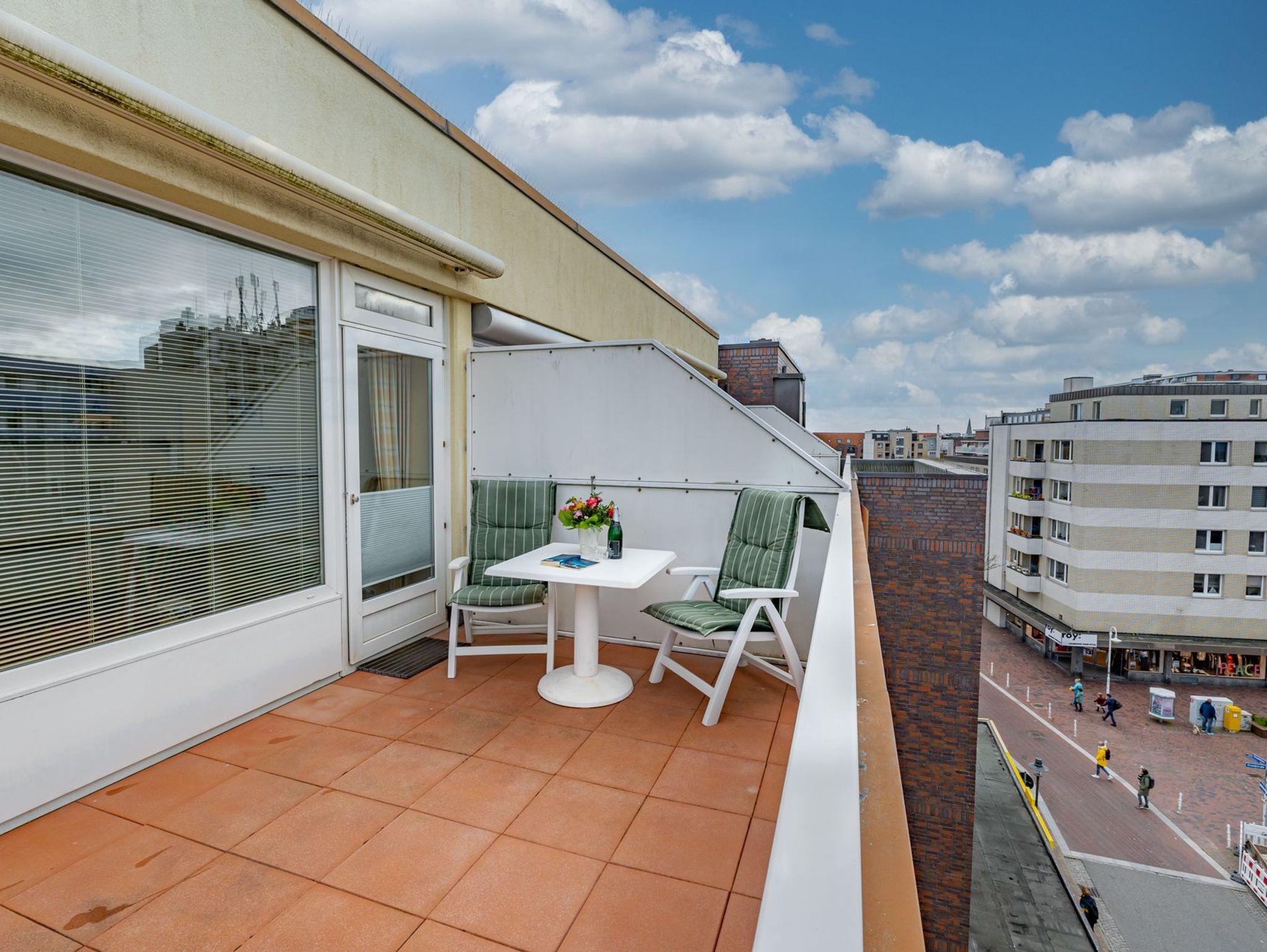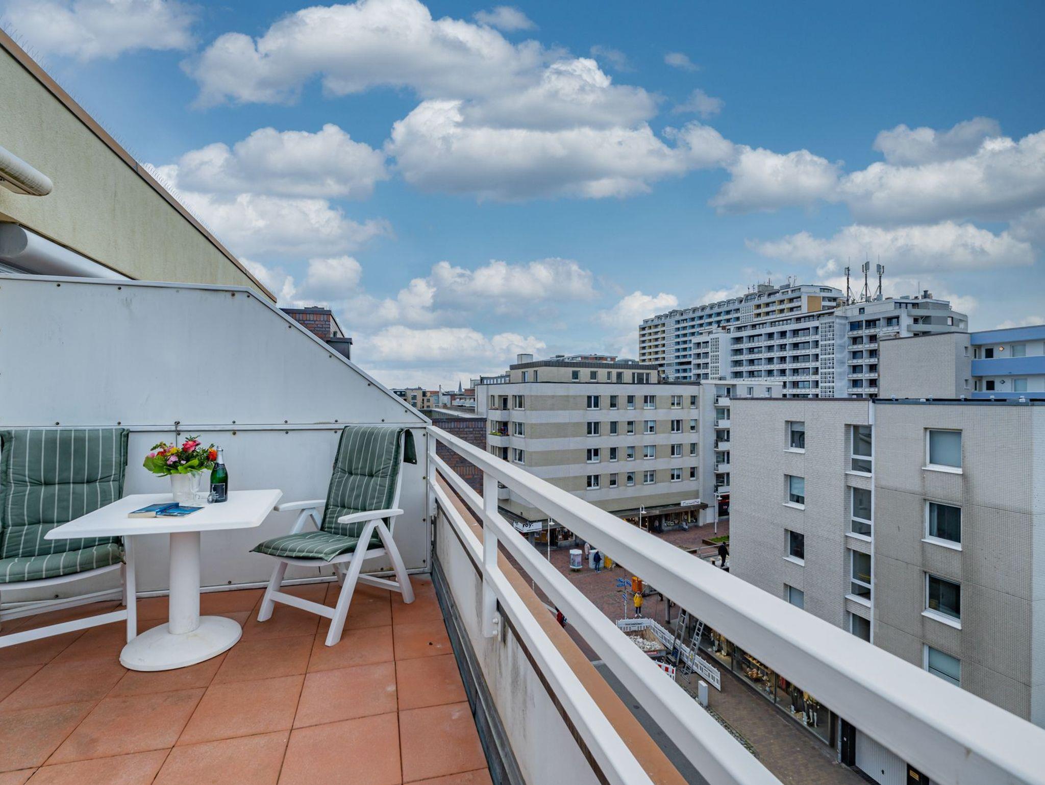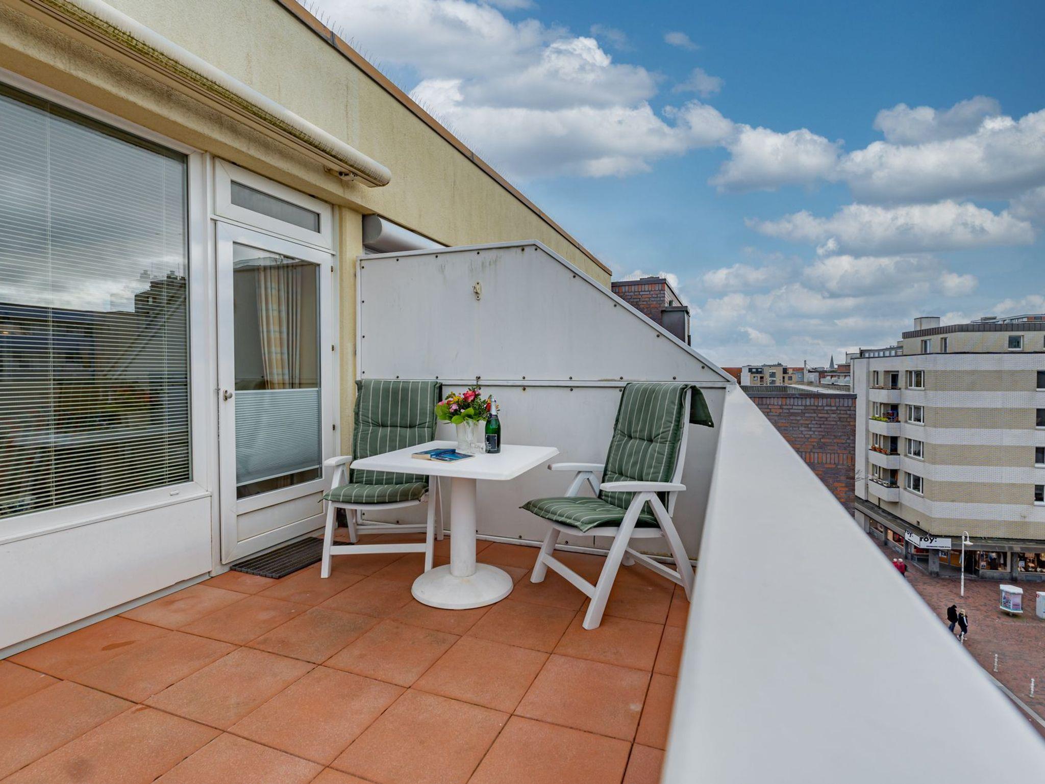 Gemütliche 1-Zimmer-Nichtraucher-Ferienwohnung (ca. 30 qm) in der 5. Etage, ganz oben, mit großzügigem Westbalkon (Nachmittagssonne mit Balkonmöbeln und ausfahrbarer Markise) ideal für 2 Personen.