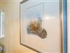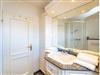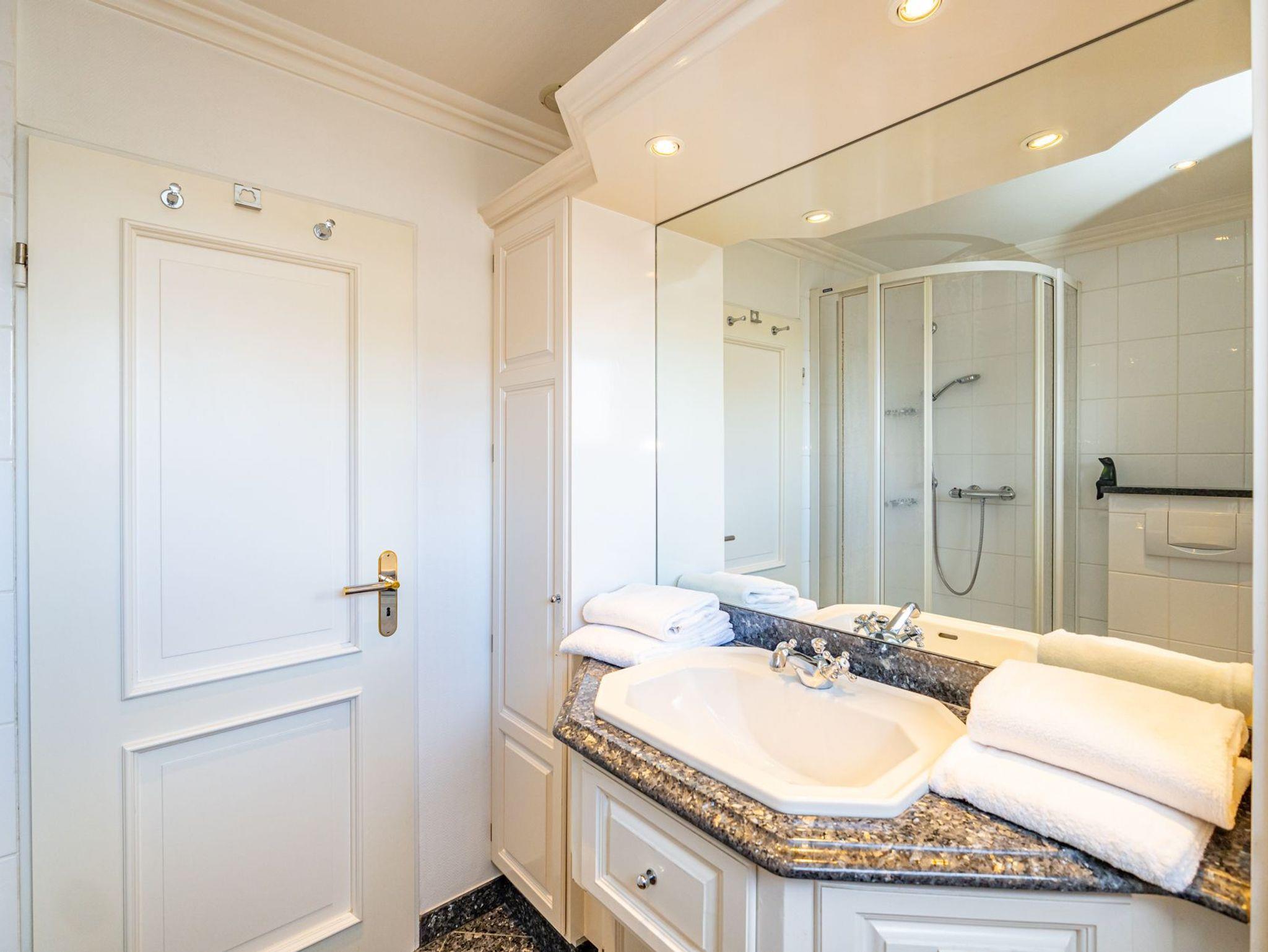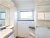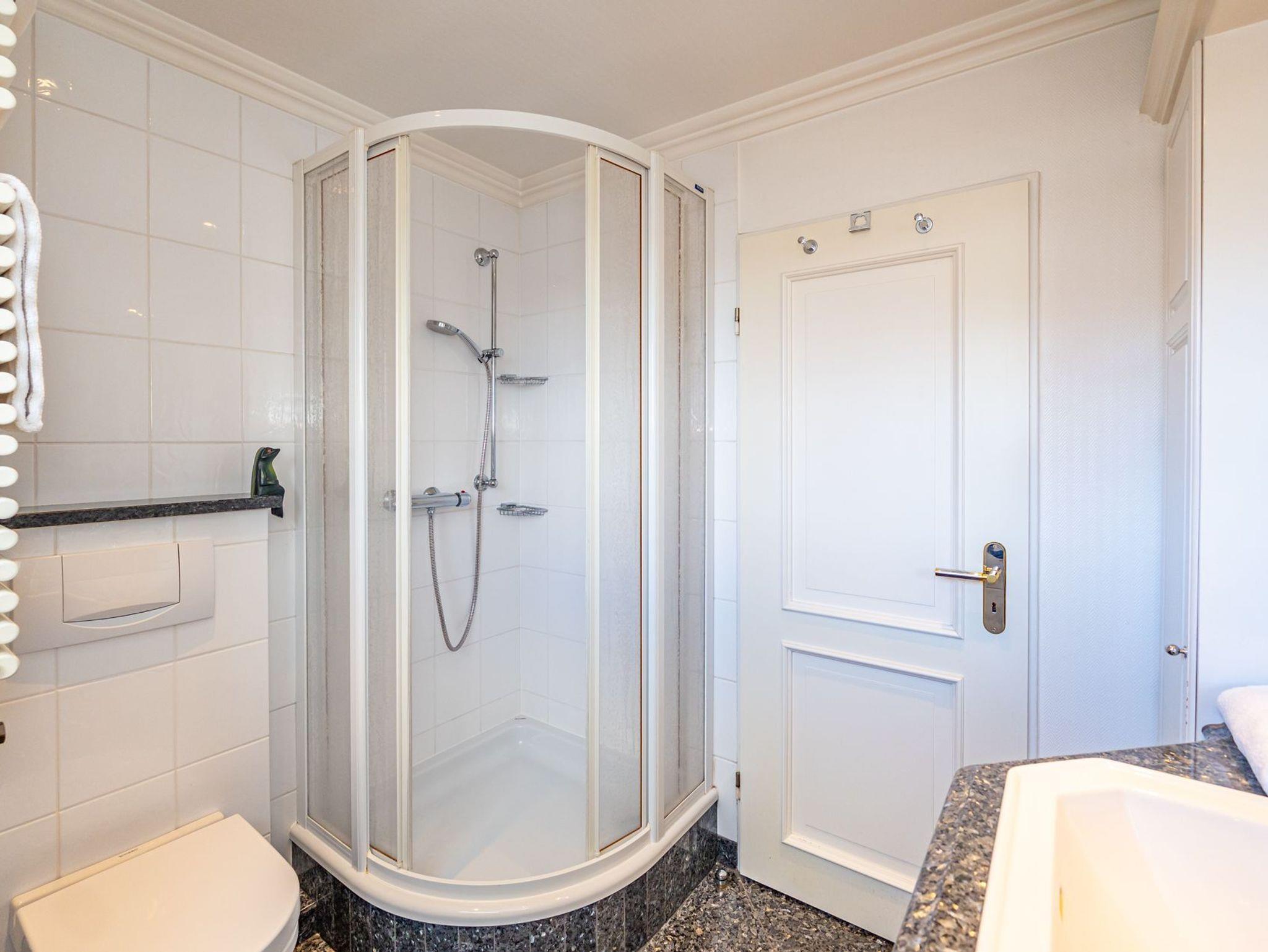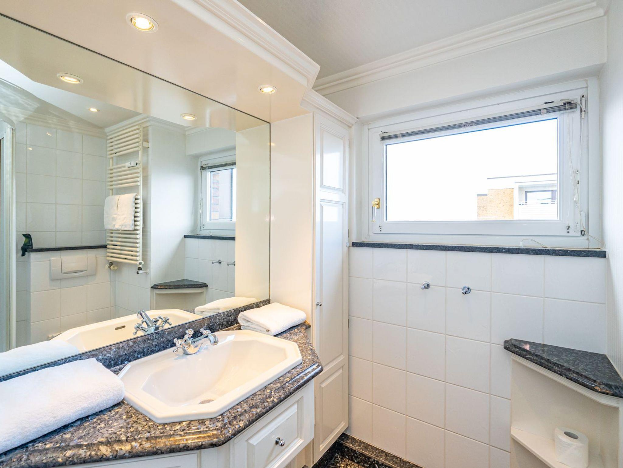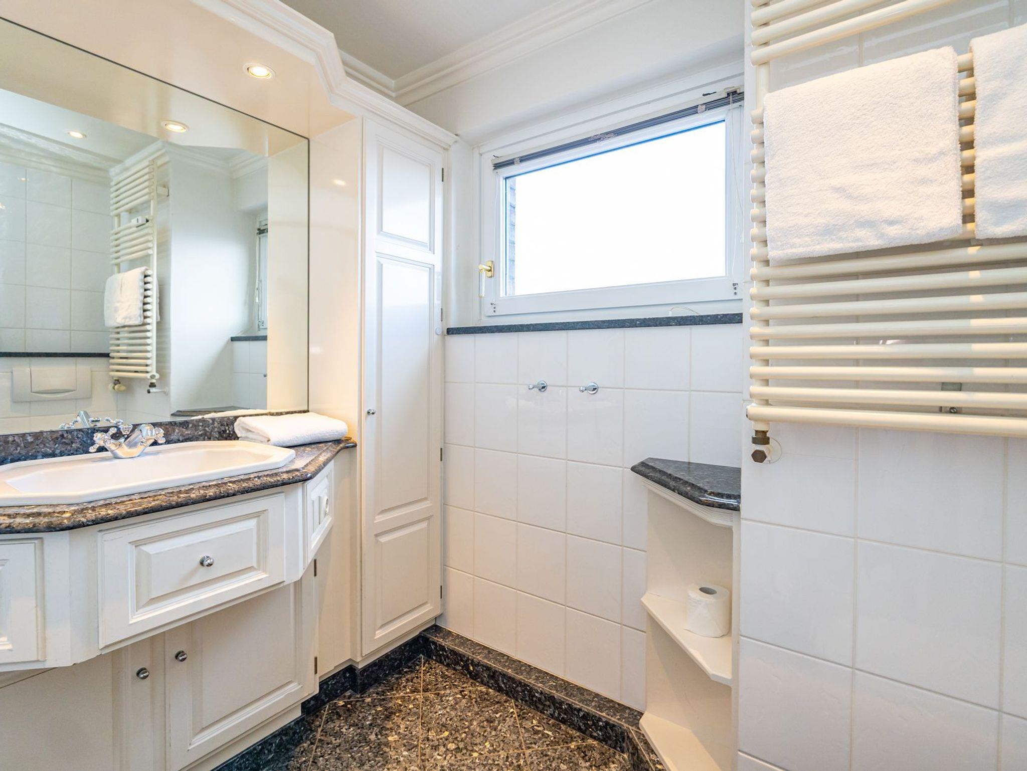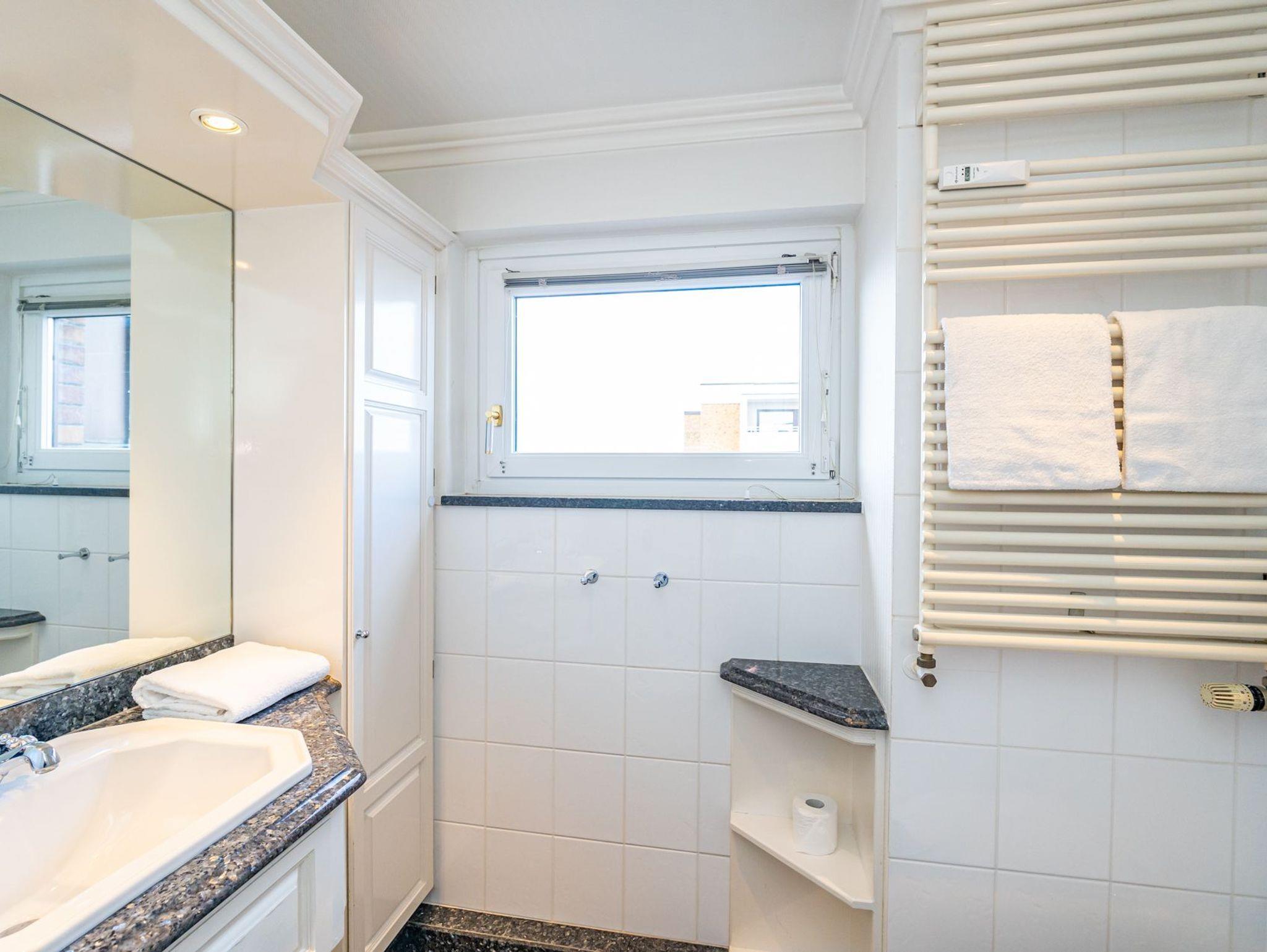 Im neuwertigen Badezimmer mit Fenster befinden sich Dusche, Waschtisch, Handtuchtrockner, Fön und WC.