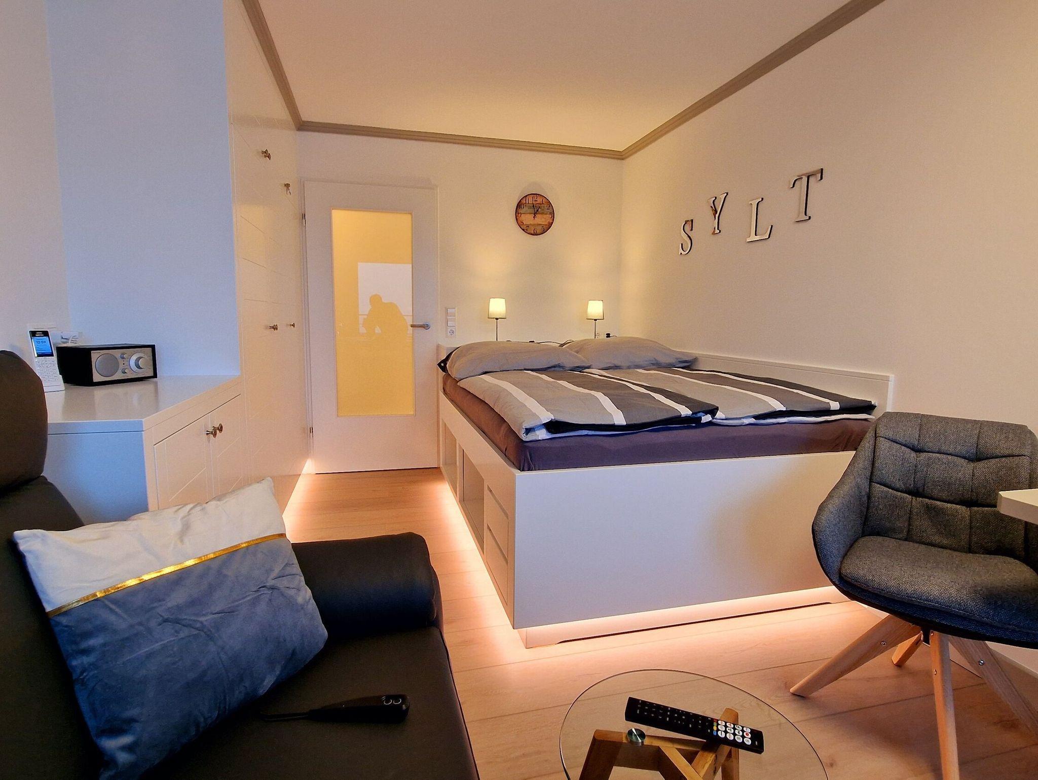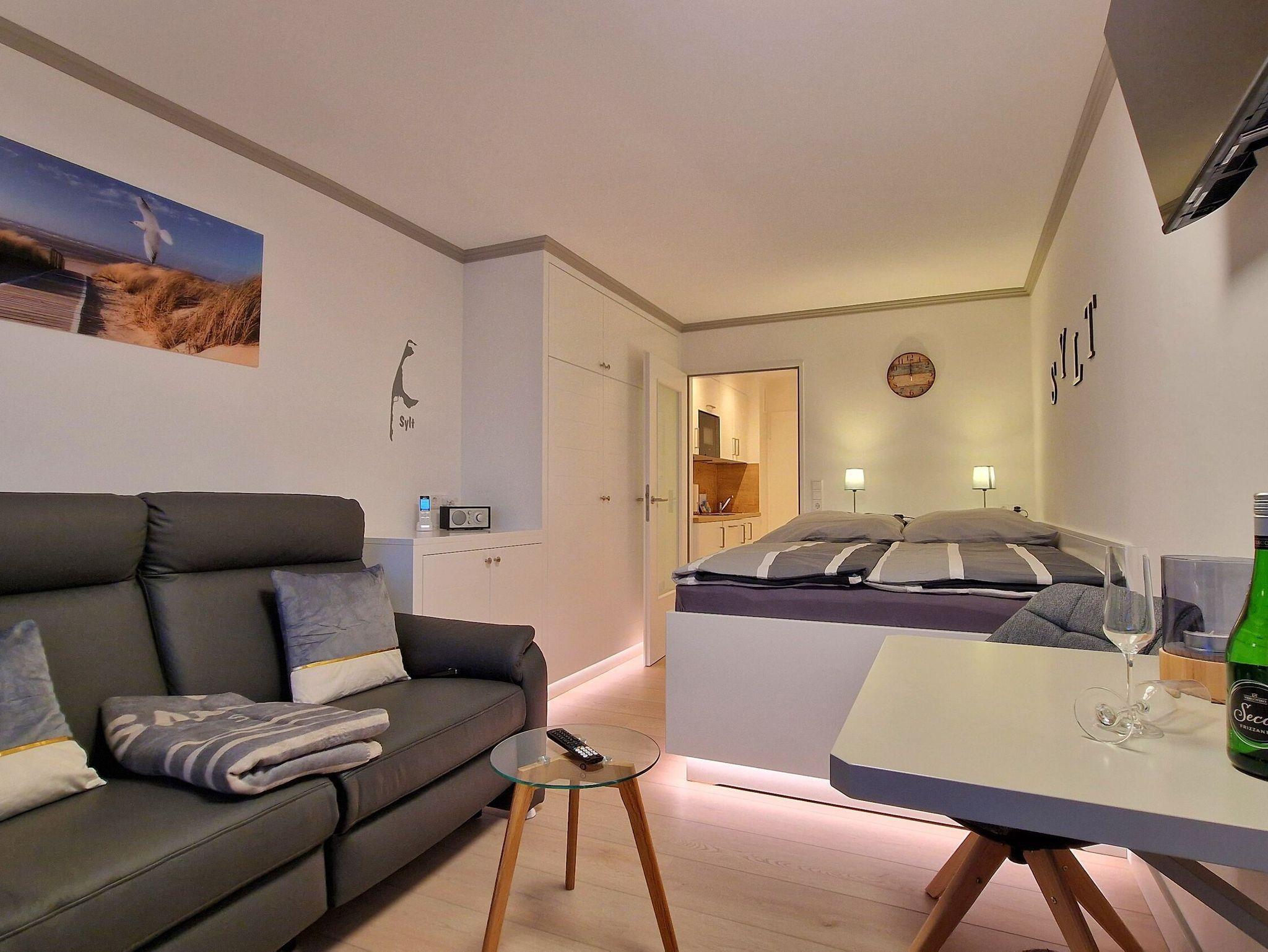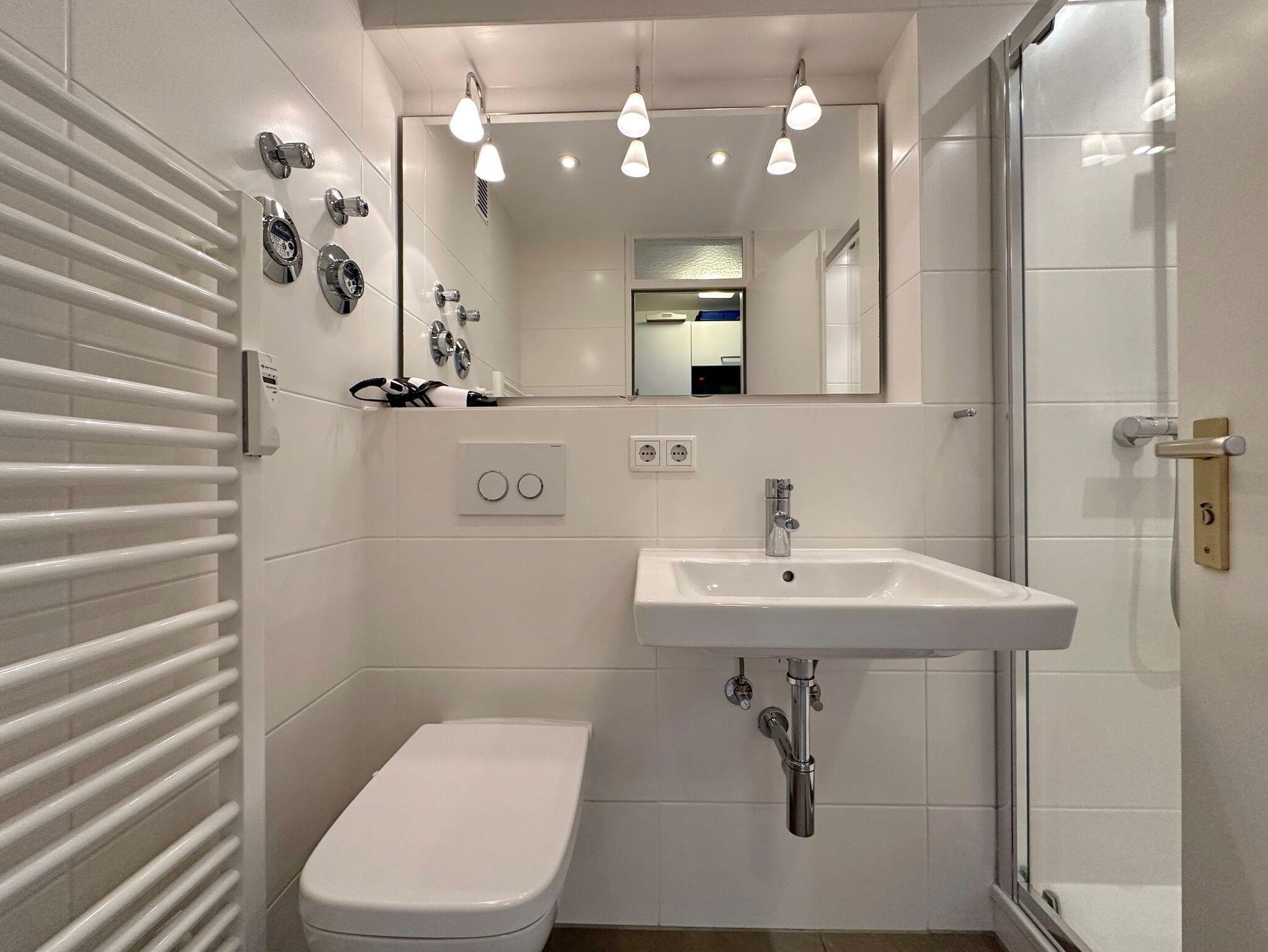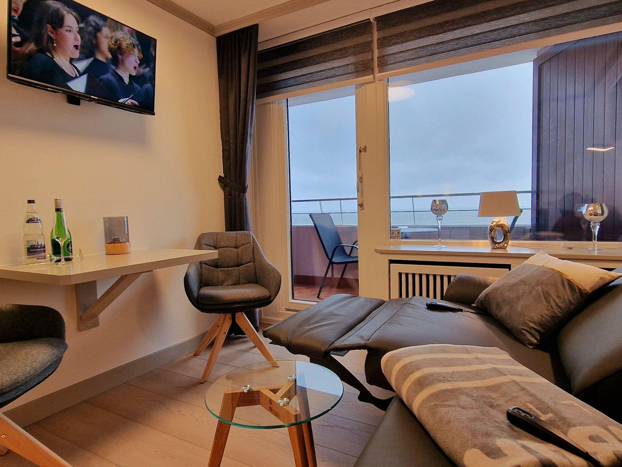 1-Zimmer-Apartment mit freiem Seeblick im 7. OG des Haus Metropol, ca. 25 m². Kombinierter Wohn- und Schlafraum mit festem Doppelbett (140x200. 75cm Höhe), 2er-Sofa mit elektronischer Liegefunktion, Esstisch mit gemütlichen Stühlen, Smart-TV, Festnetzanschluss, seperatem WLAN und möblierten Westbalkon. Hübsche Küchenzeile mit Geschirrspüler, Mikrowelle, 2er-Cerankochfeld und extra Senseo Kaffeemaschine . Schickes Duschbad mit WC. Tierhaltung und Rauchen ist in der Wohnung ist nicht gestattet. Bettwäsche und Handtücher sind zur Anreise aufgezogen. Ein PKW-Stellplatz kann kostenpflichtig zugebucht werden.