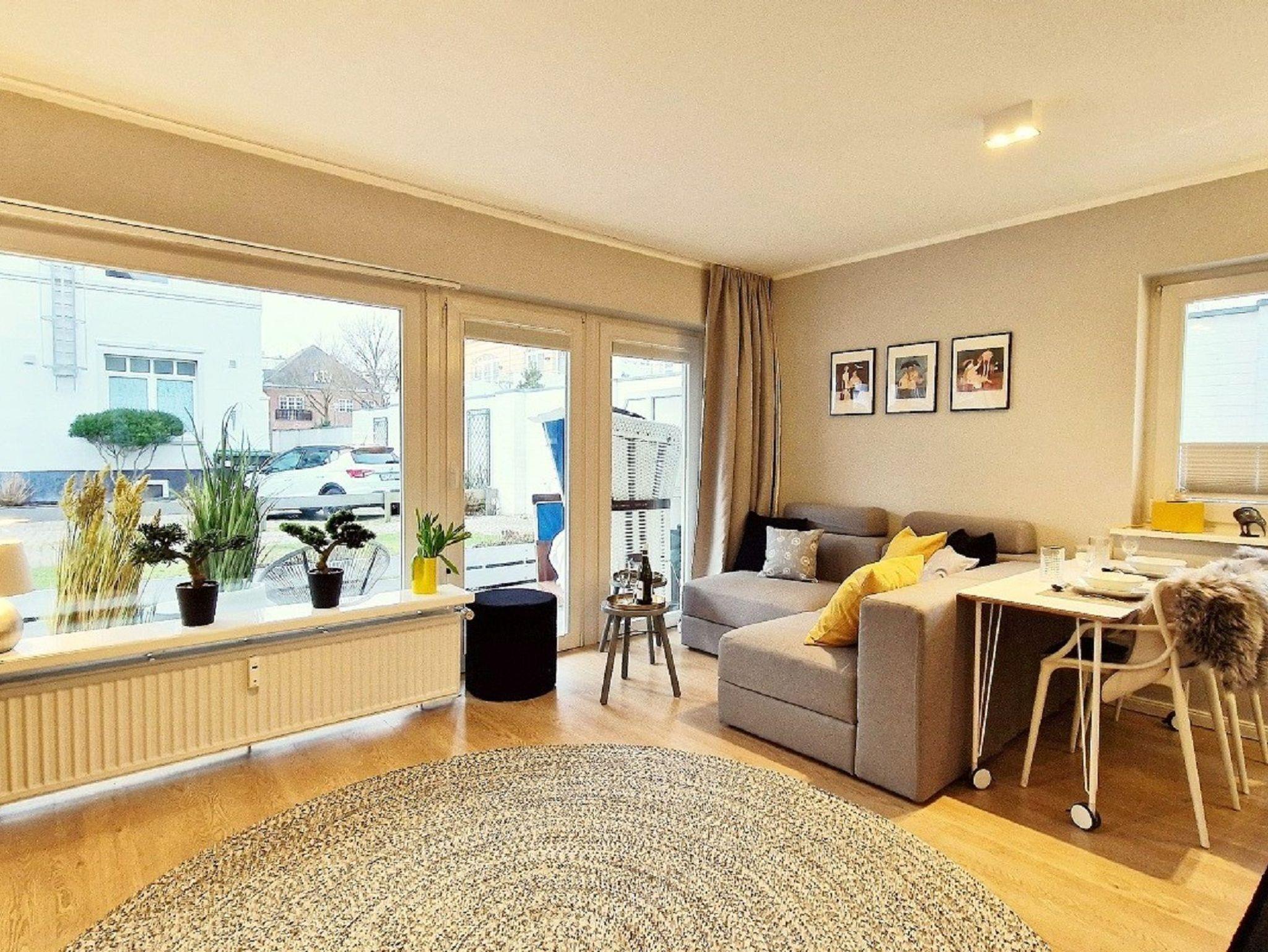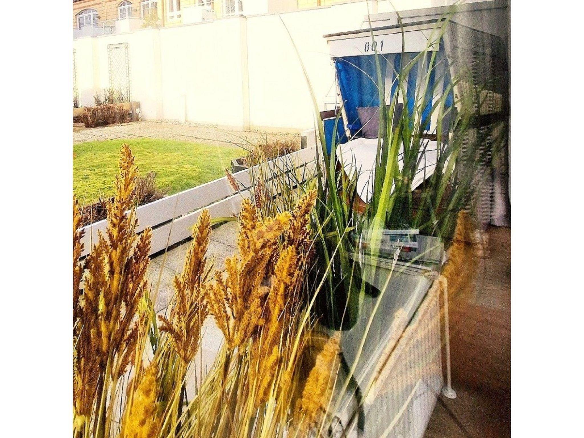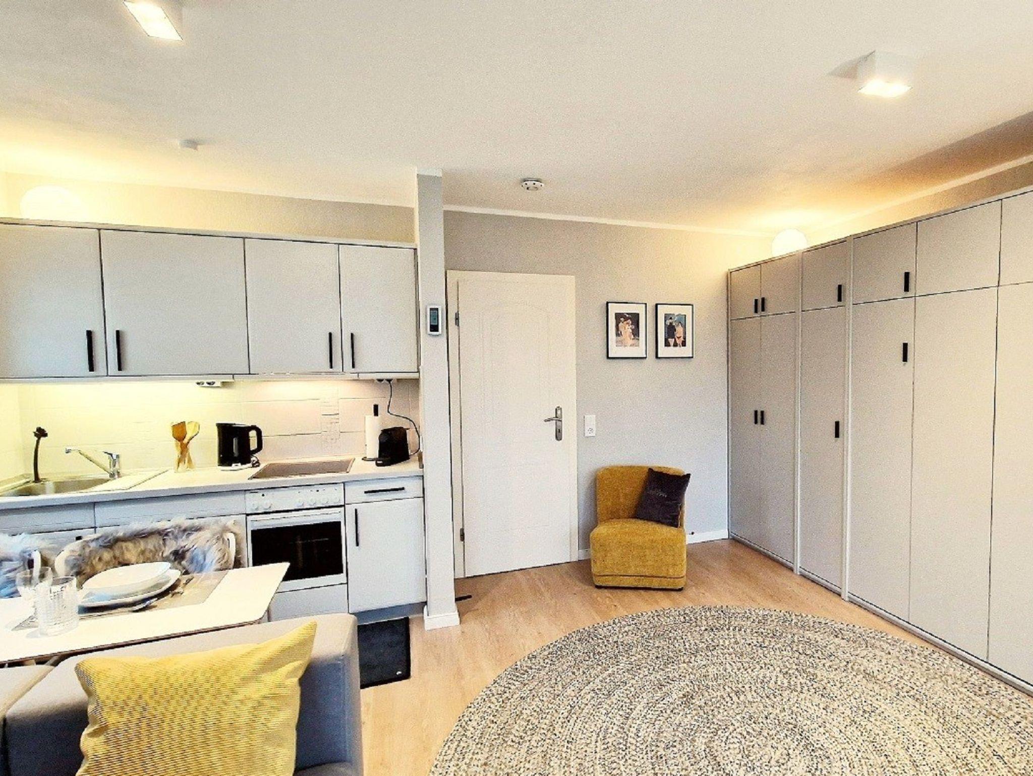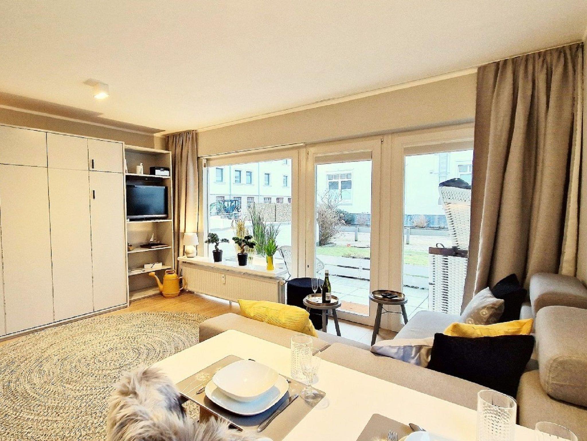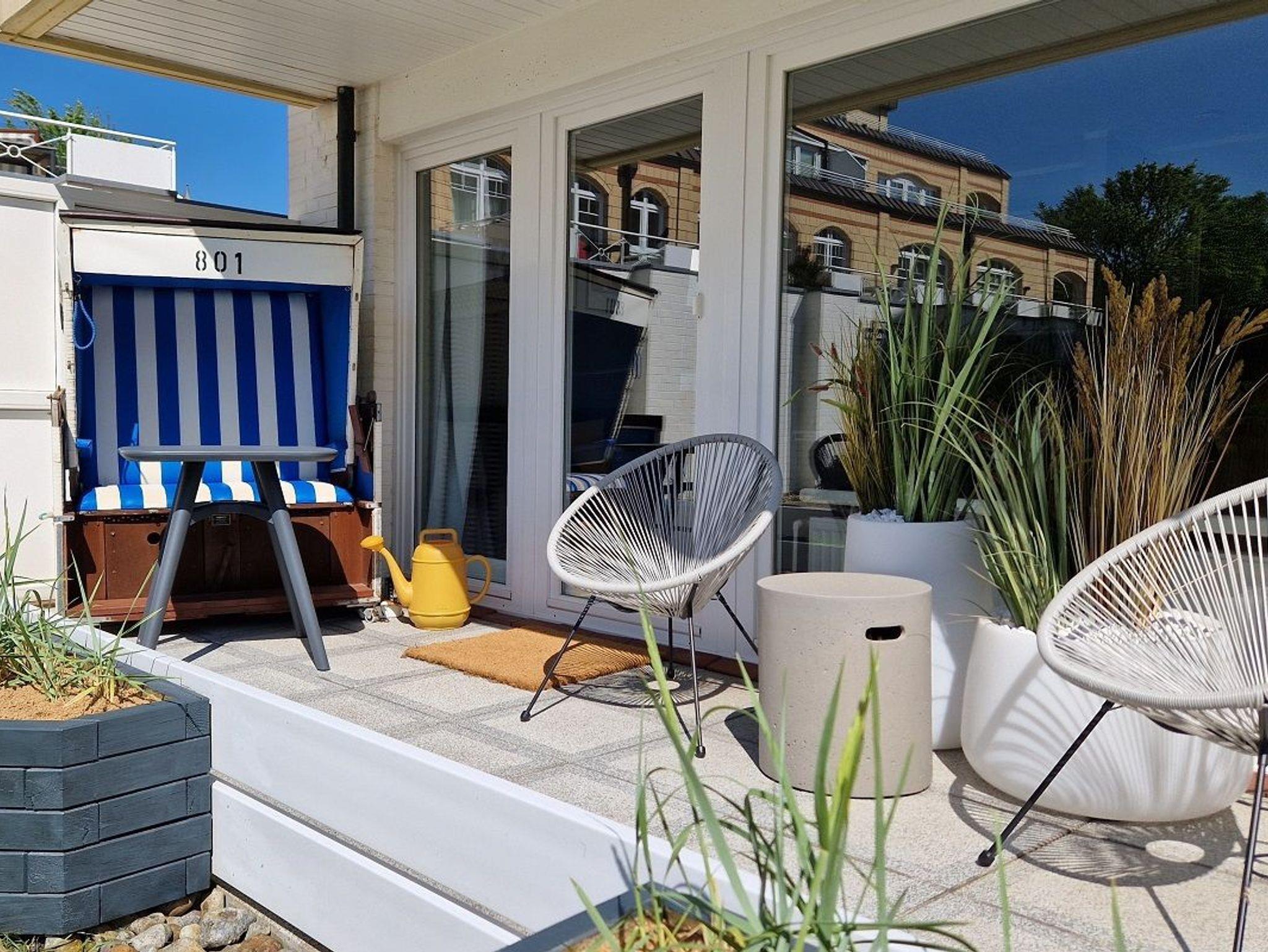 Großzügige 1-Zimmer-Ferienwohnung (ca. 32 qm) im EG für 2 Personen mit Westterrasse (Nachmittagssonne, mit Strandkorb und Terrassenstühlen) und eigenem PKW-Stellplatz in der Tiefgarage.