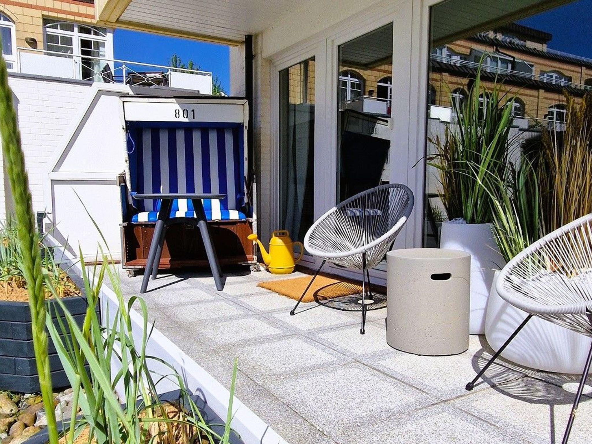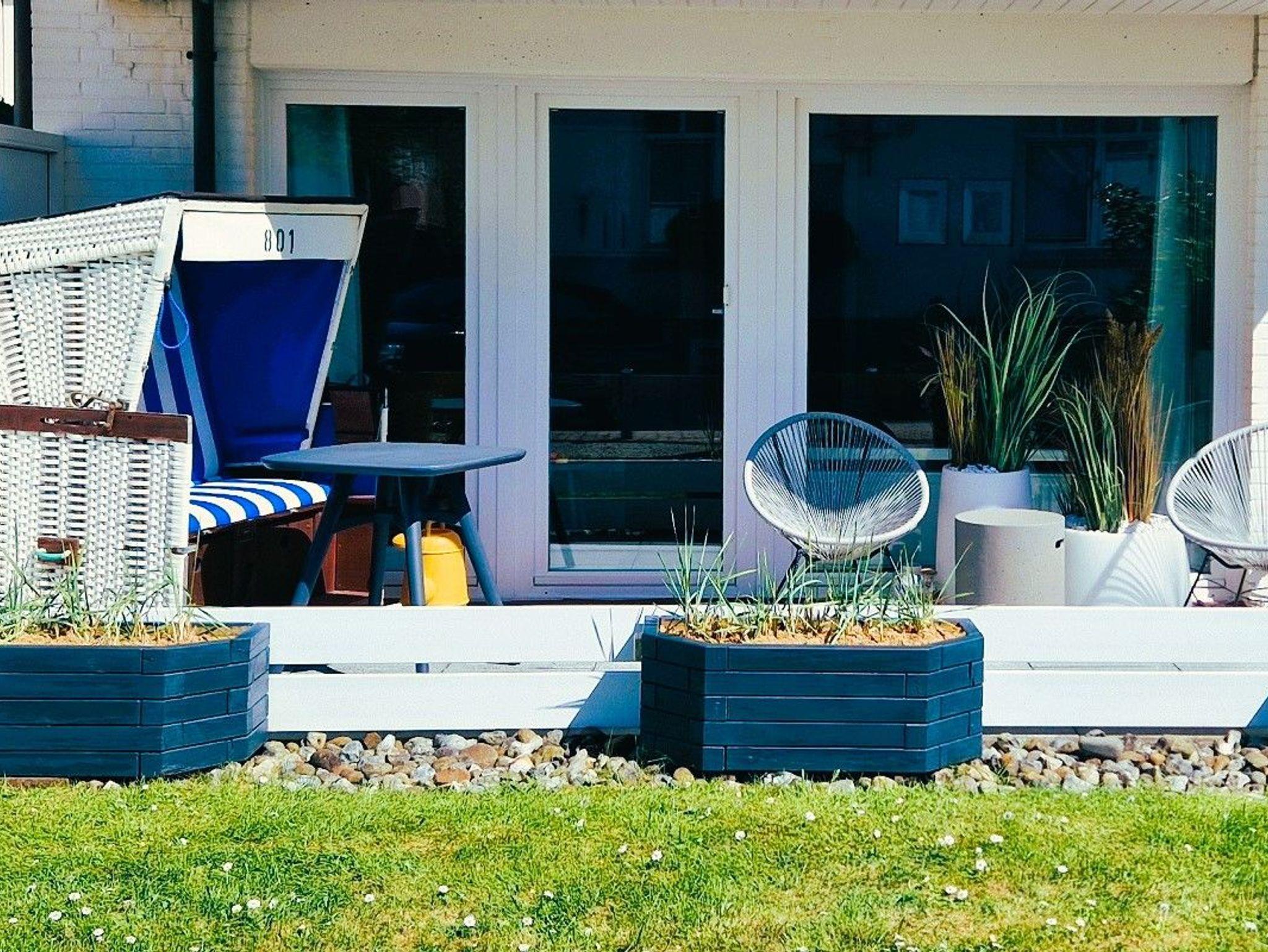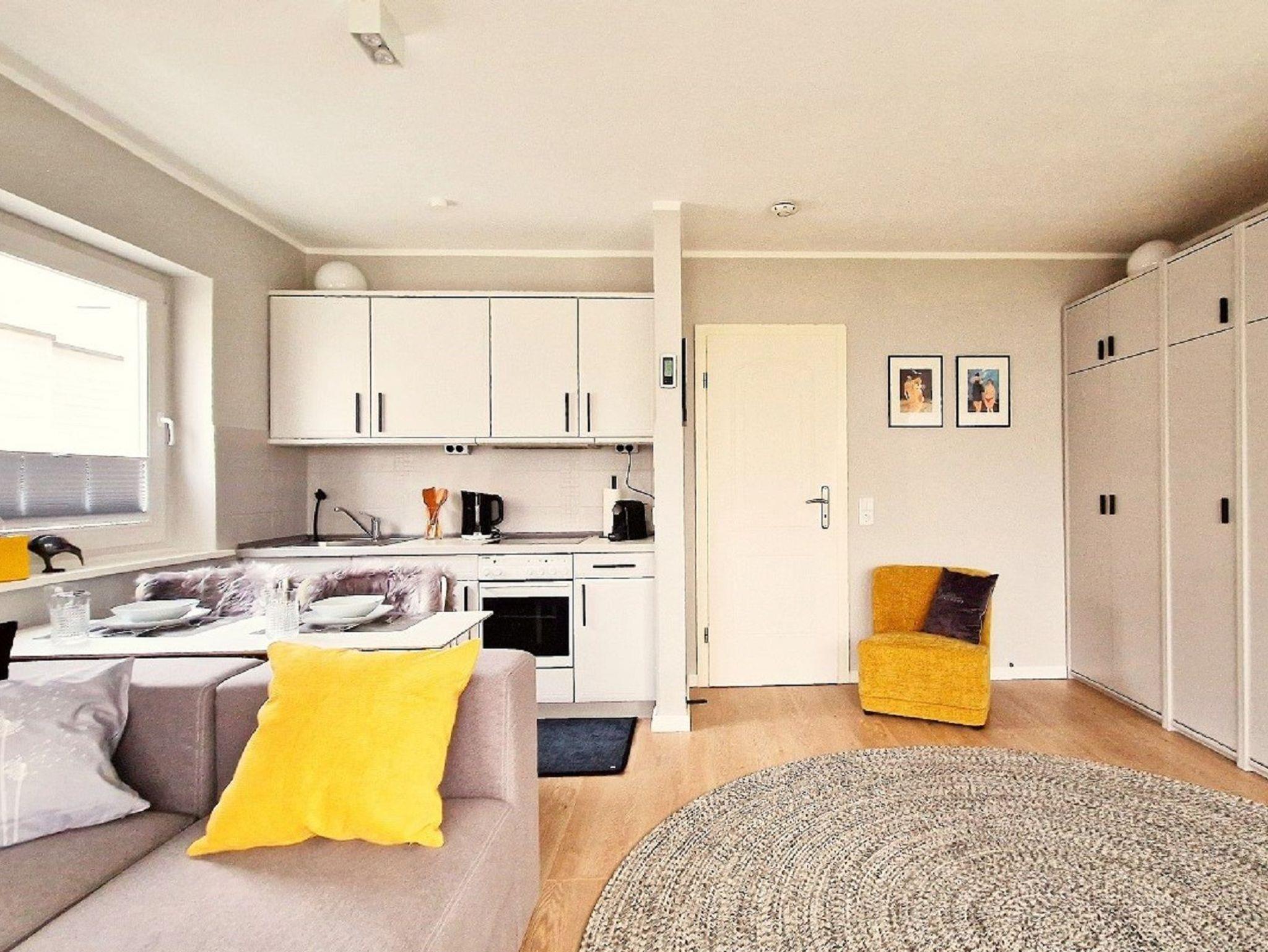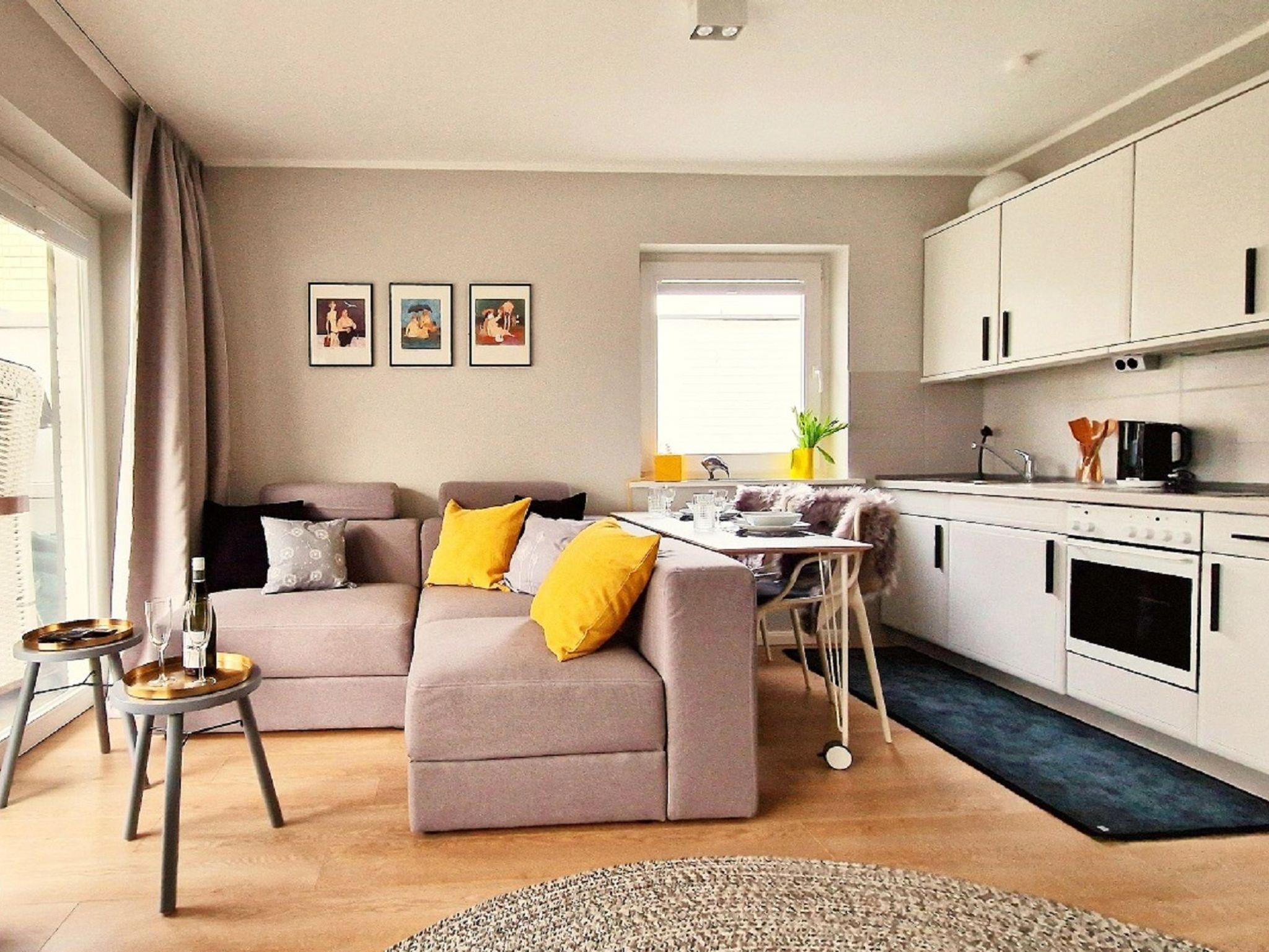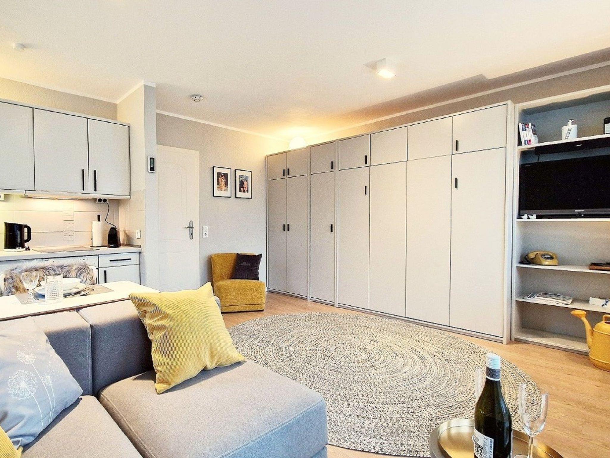 Großzügige 1-Zimmer-Ferienwohnung (ca. 32 qm) im EG für 2 Personen mit Westterrasse (Nachmittagssonne, mit Strandkorb und Terrassenstühlen) und eigenem PKW-Stellplatz in der Tiefgarage.