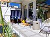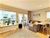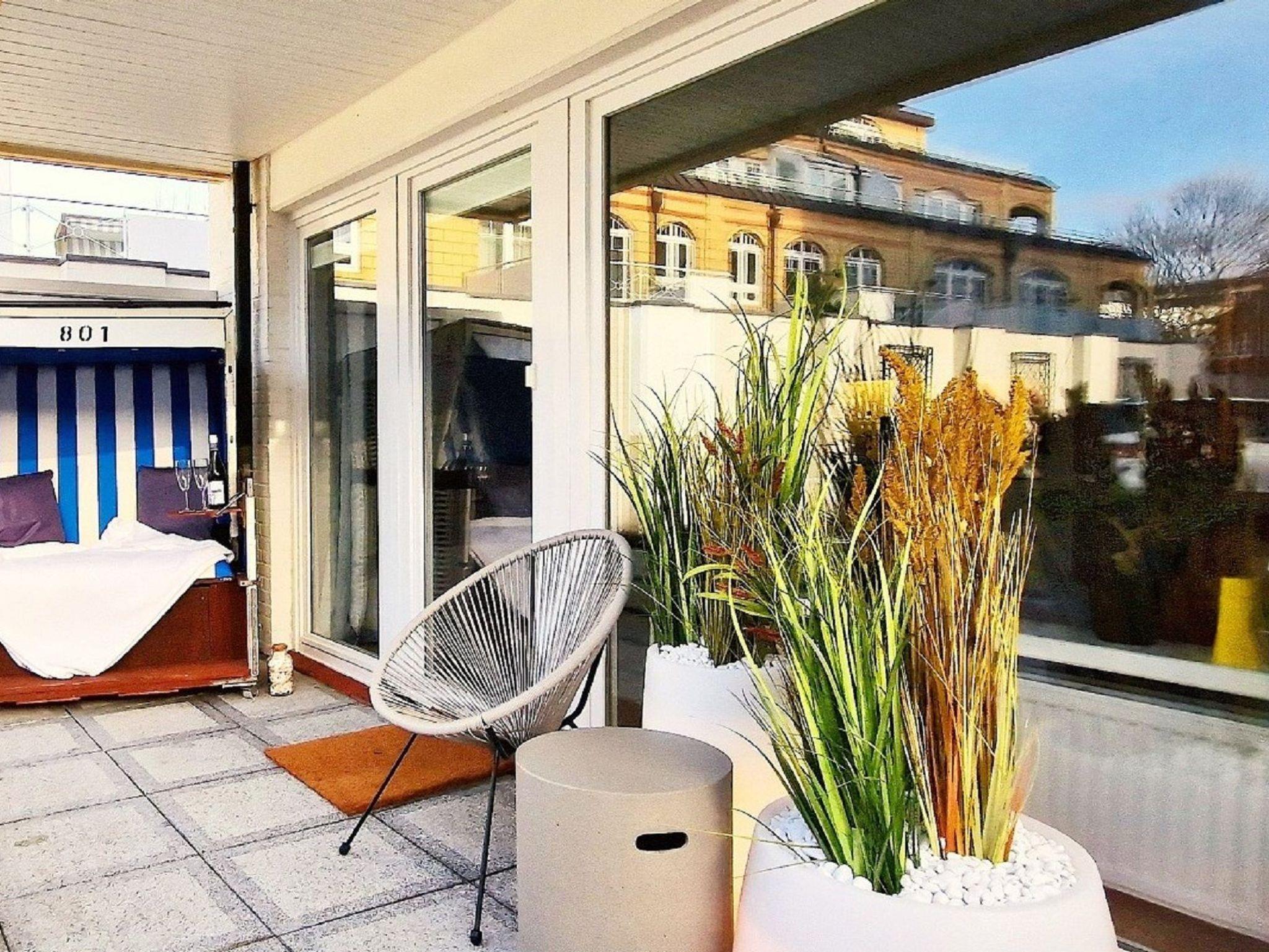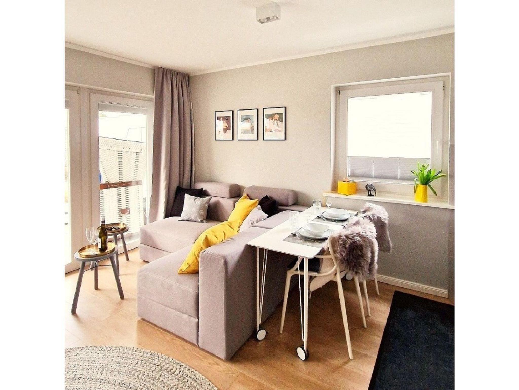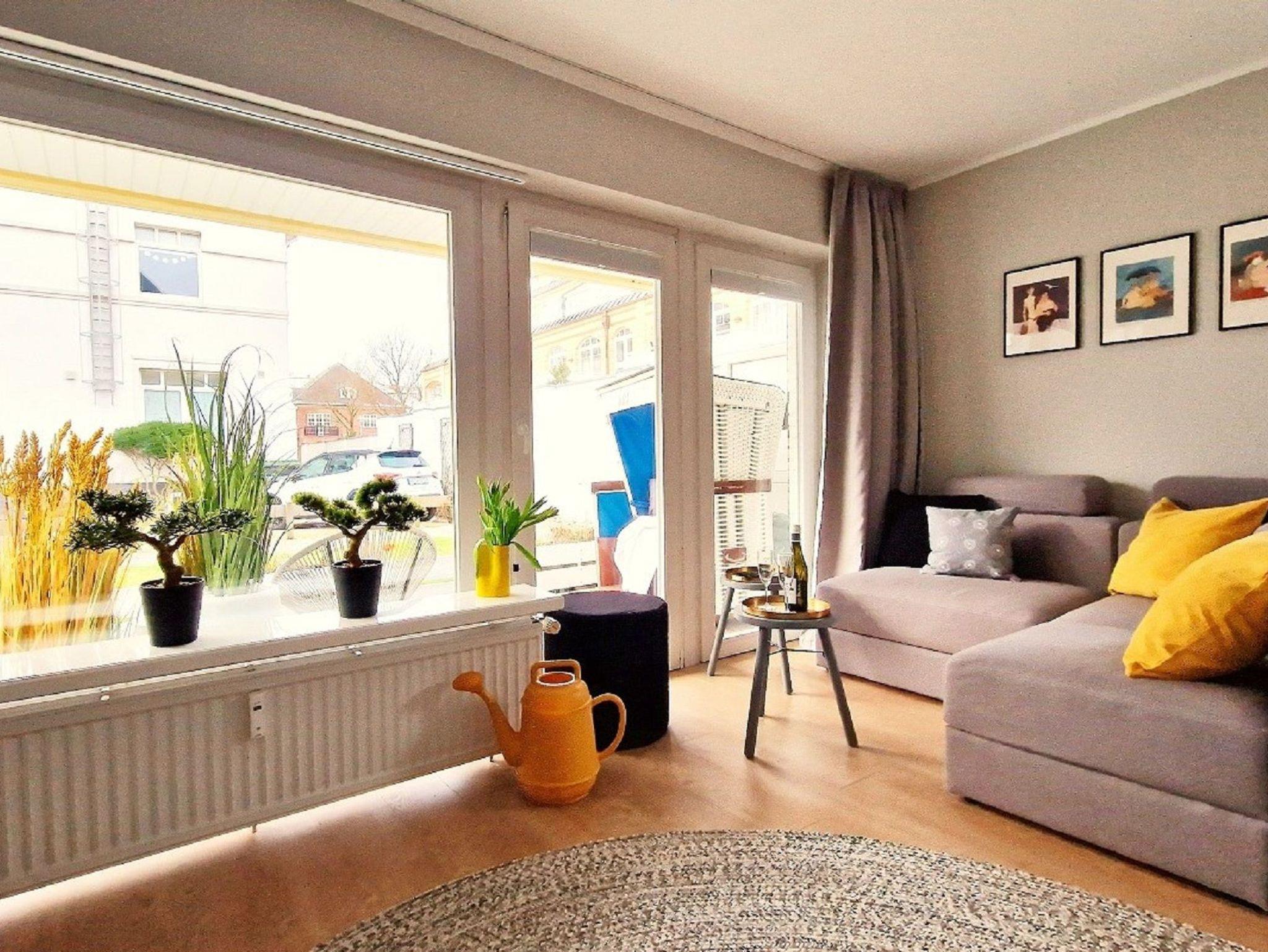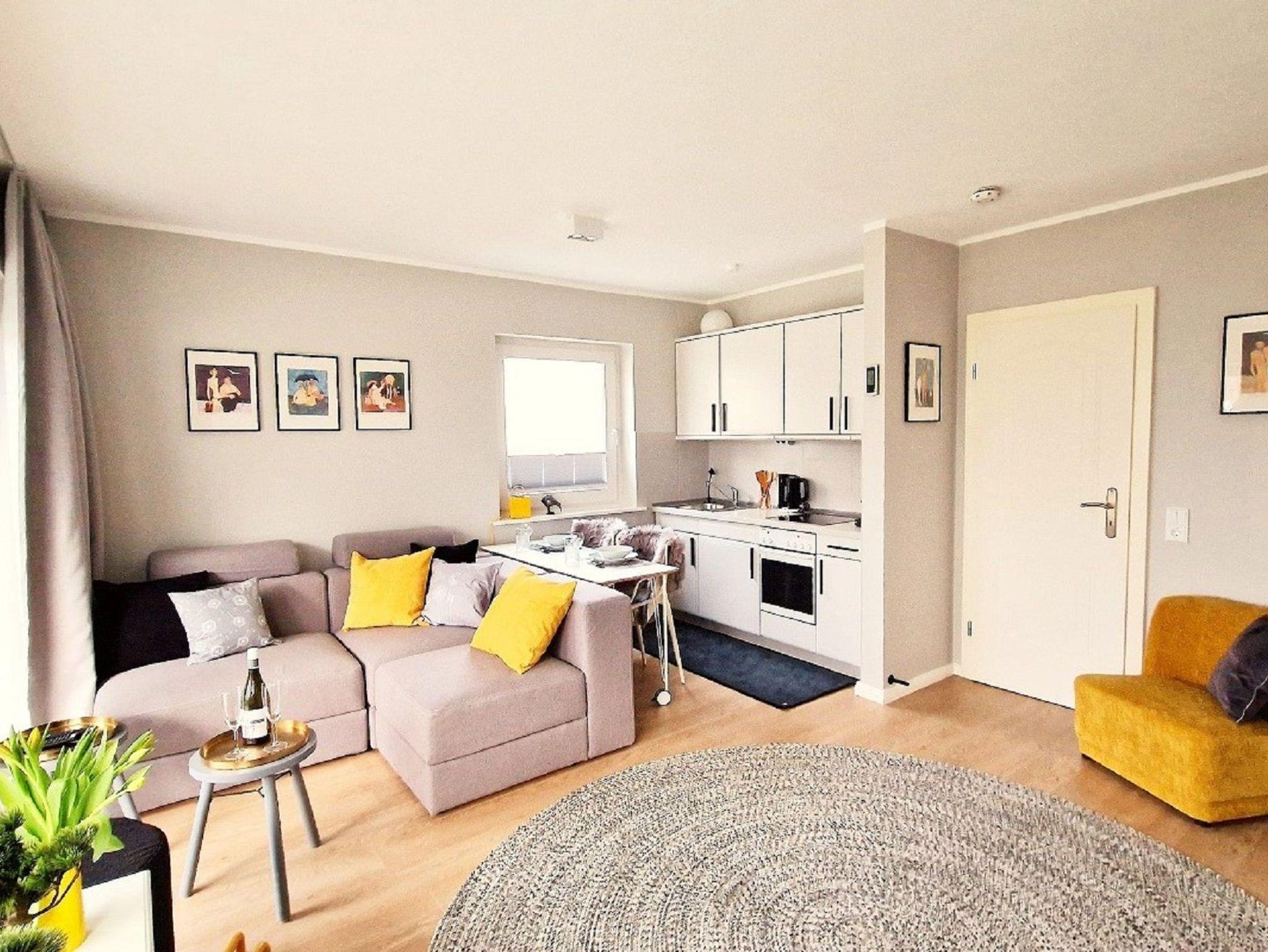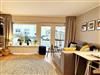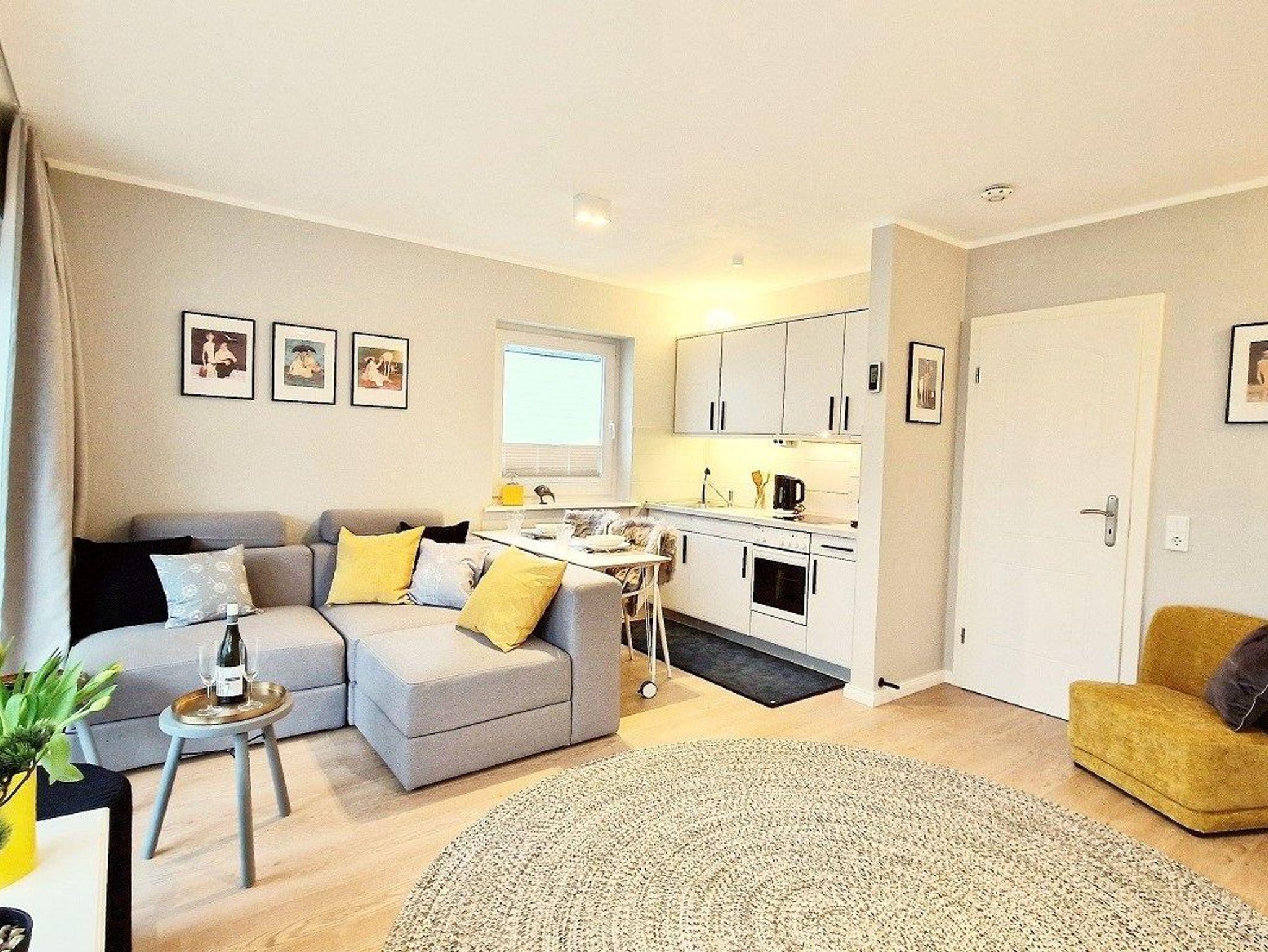 Großzügige 1-Zimmer-Ferienwohnung (ca. 32 qm) im EG für 2 Personen mit Westterrasse (Nachmittagssonne, mit Strandkorb und Terrassenstühlen) und eigenem PKW-Stellplatz in der Tiefgarage.