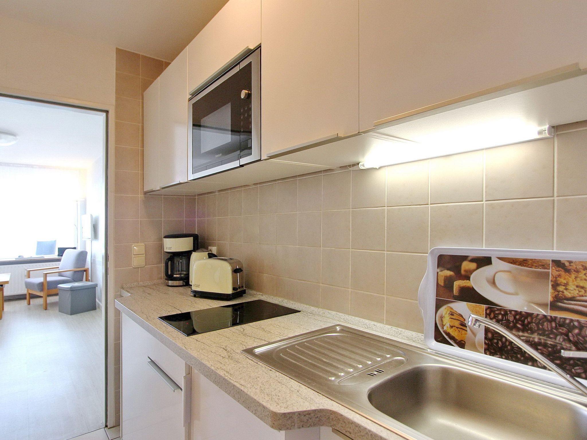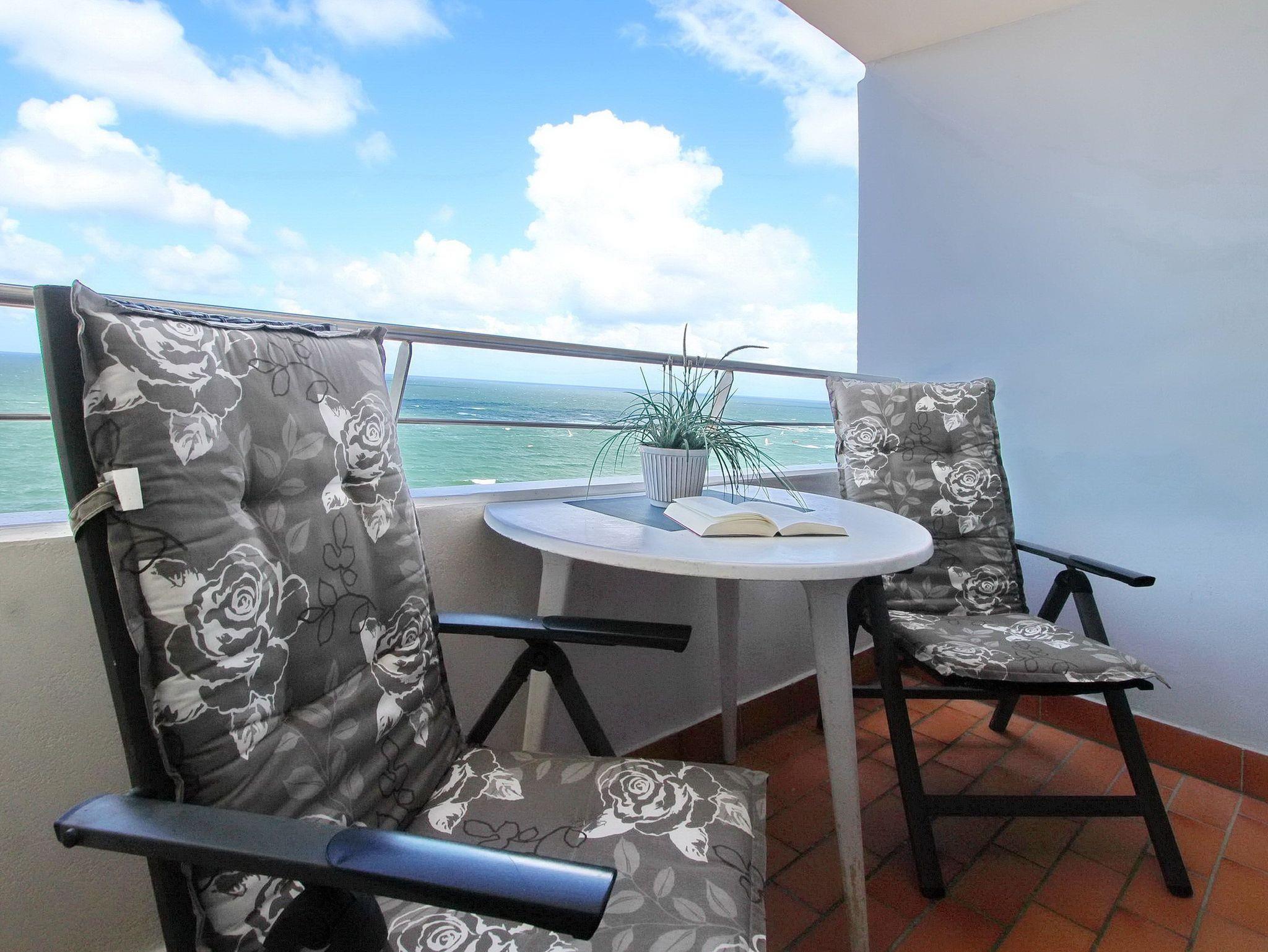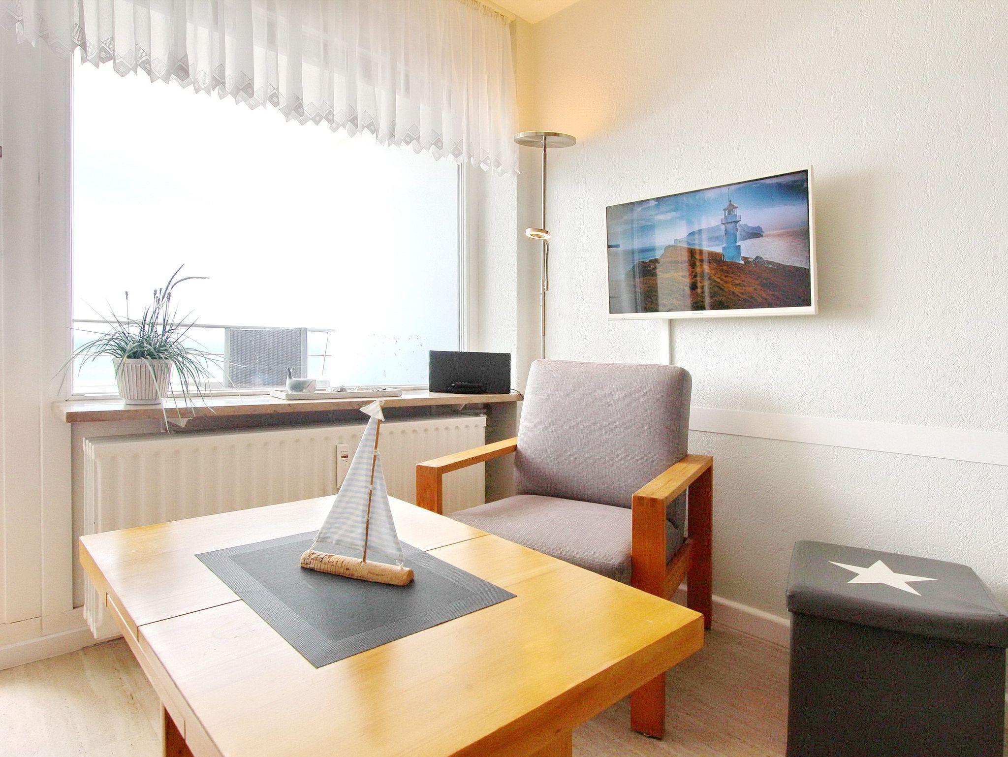 Kleine, aber mit viel Liebe zum Detail eingerichtete Einzimmerwohnung in der 9. Etage im Haus Metropol mit wunderschönem Strand- und Nordseeblick. Der kombinierte Wohn-/Schlafraum mit vorgelagertem Westbalkon ist eingerichtet mit Einzelschrankbetten, Designfussboden, 2 Sitzercouch mit Wohn-Esstisch und Fernsehsessel. Auf dem Balkon gibt es zwei Hochlehnerstühle mit Auflagen und einen Tisch. Das Badezimmer hat eine Dusche mit festem Haltegriff und Hocker. In der Einbauküche mit Mikrowelle, Ceranfeld (2 Platten) und Geschirrspüler können sie sich selbst verpflegen. Zur technischen Ausstattung gehört: ein Smart- TV mit integriertem Radio und eine Bluetoothanlage mit CD Player. Ein freies WLAN Netzwerk (WEG Haus Metropol - Passwortfrei - ohne Gewähr) steht ihnen kostenfrei zur Verfügung. Diese Nichtraucherwohnung hat eine Größe von ca. 25 m².