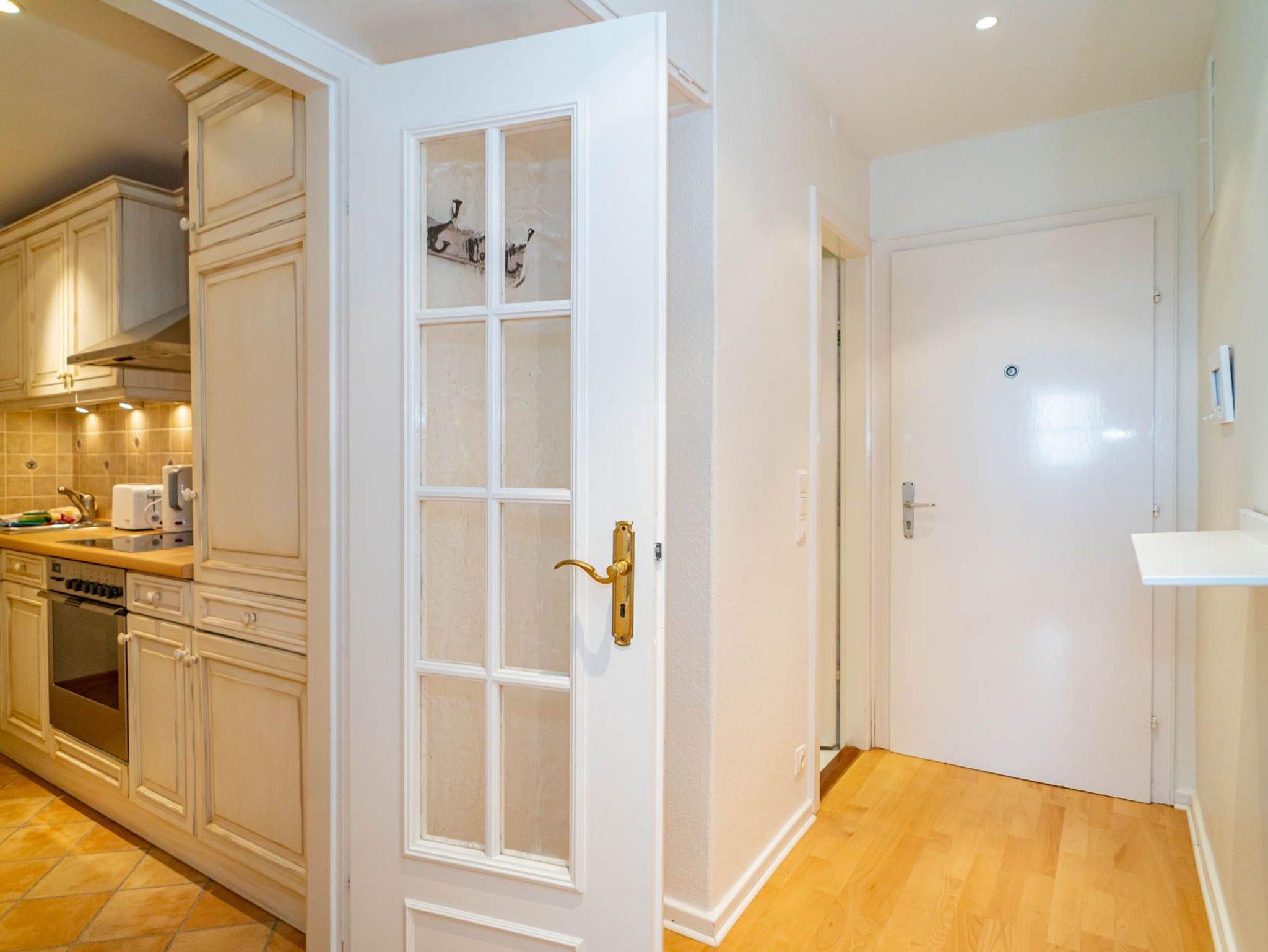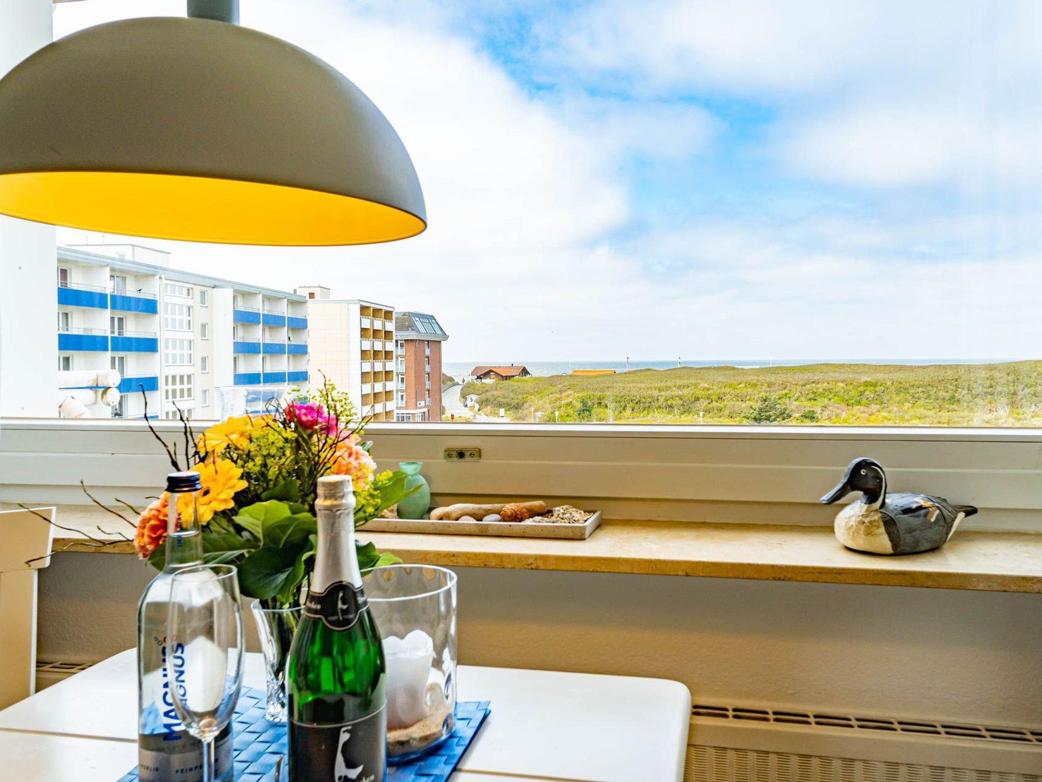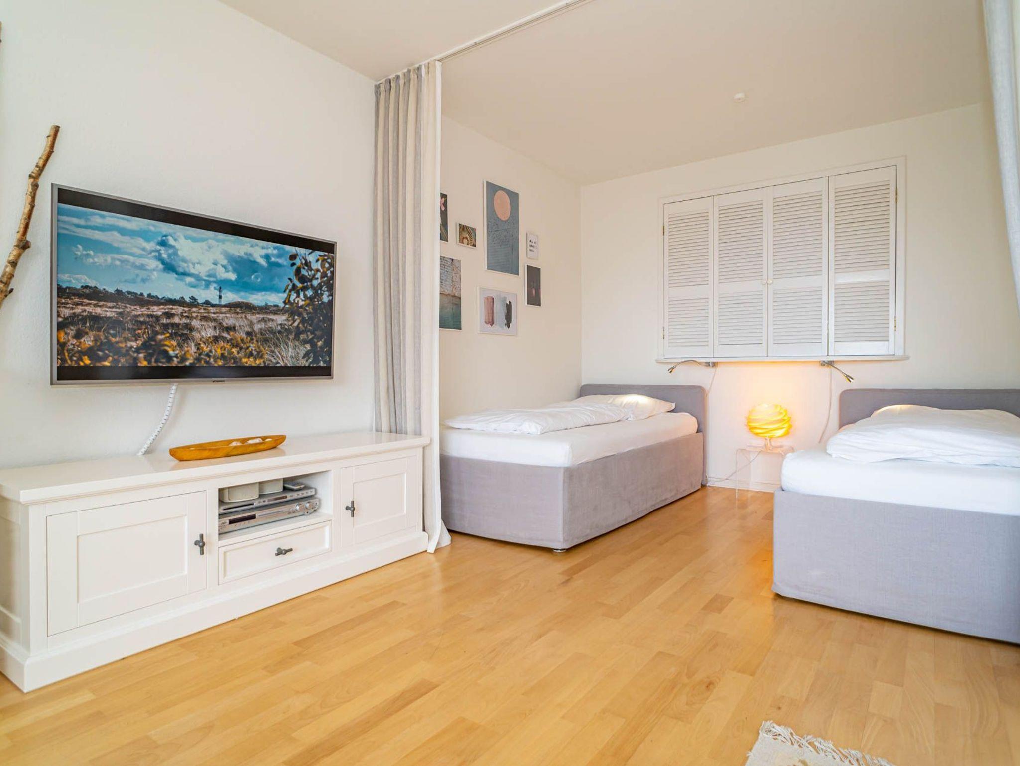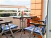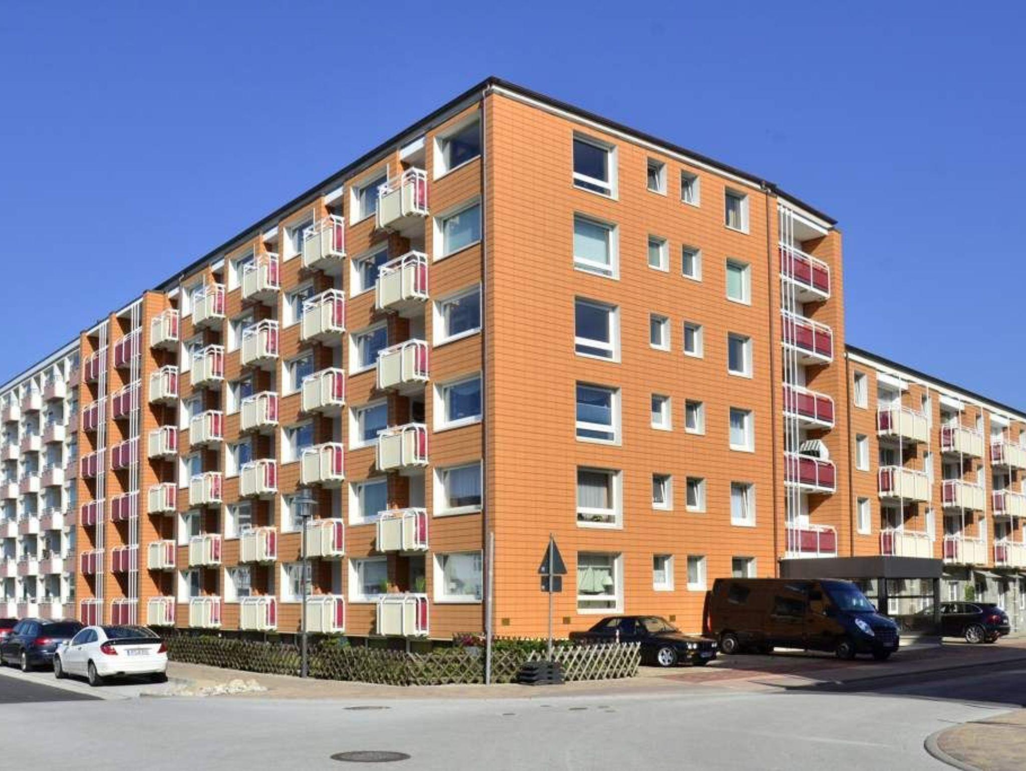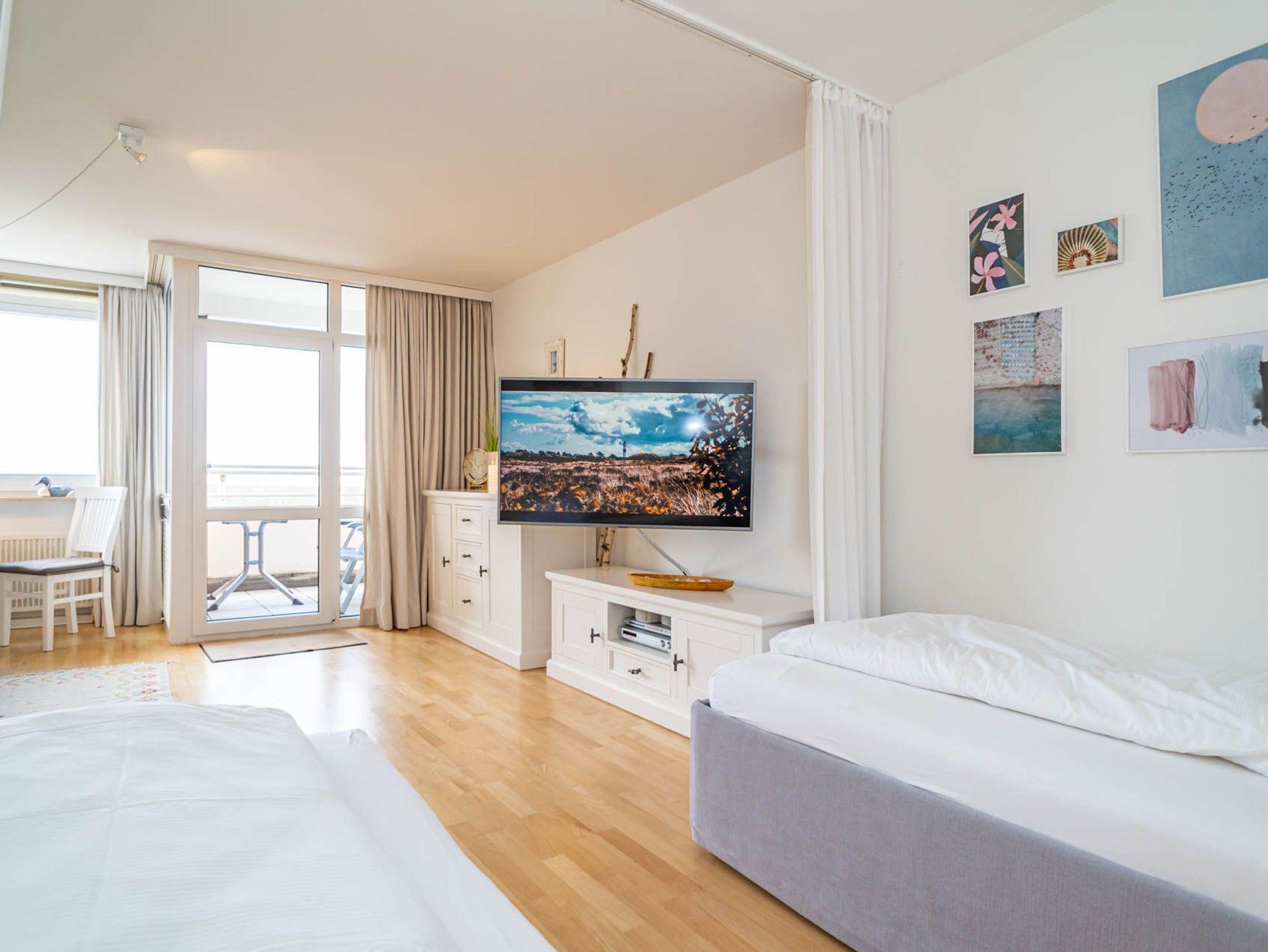 Großzügige 1-Zimmer-Ferienwohnung (ca. 48,5 qm) für 2 Personen, in der Nähe des Übergangs zu Promenade und Strand, in der 4. Etage mit direktem Meerblick, Balkon zur Seeseite mit Balkonmöbeln.