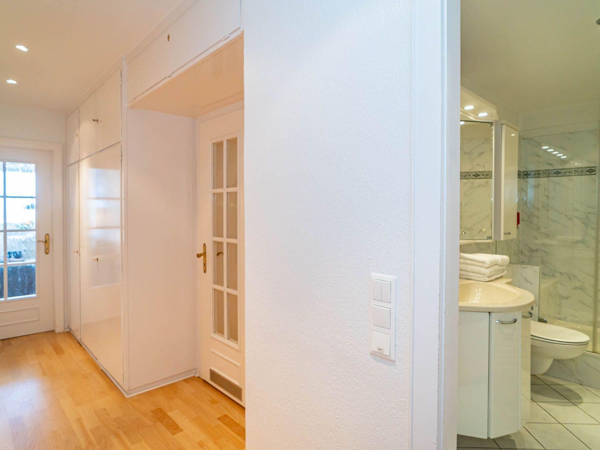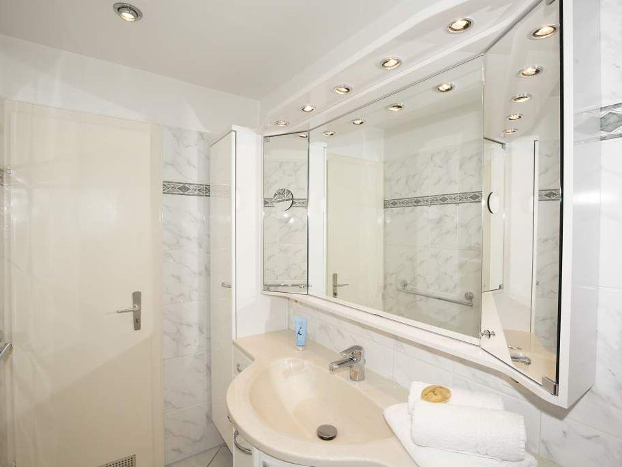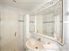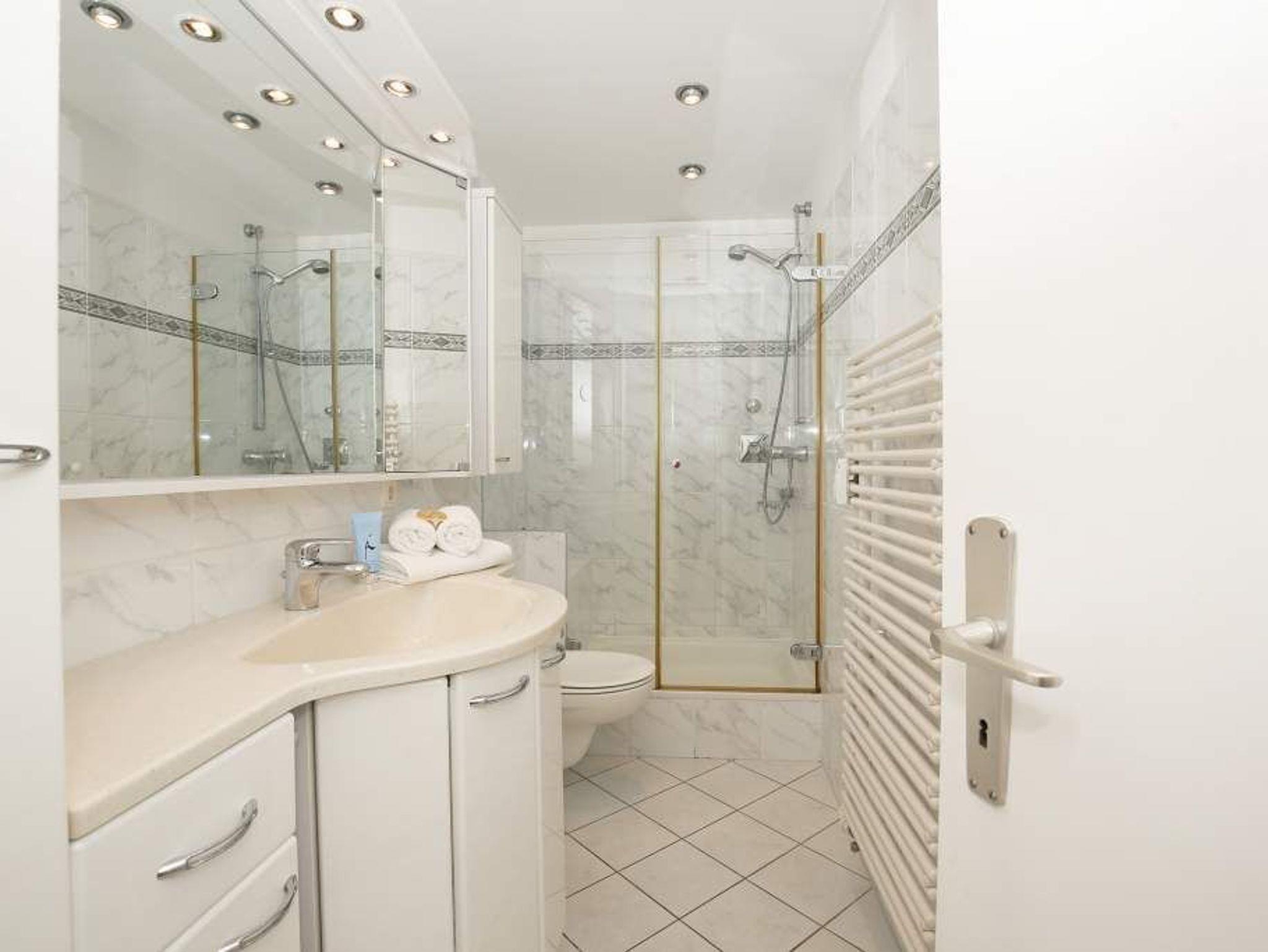 Das geräumige Bad ist mit Dusche, Waschtisch, Handtuchtrockner und WC ausgestattet.
