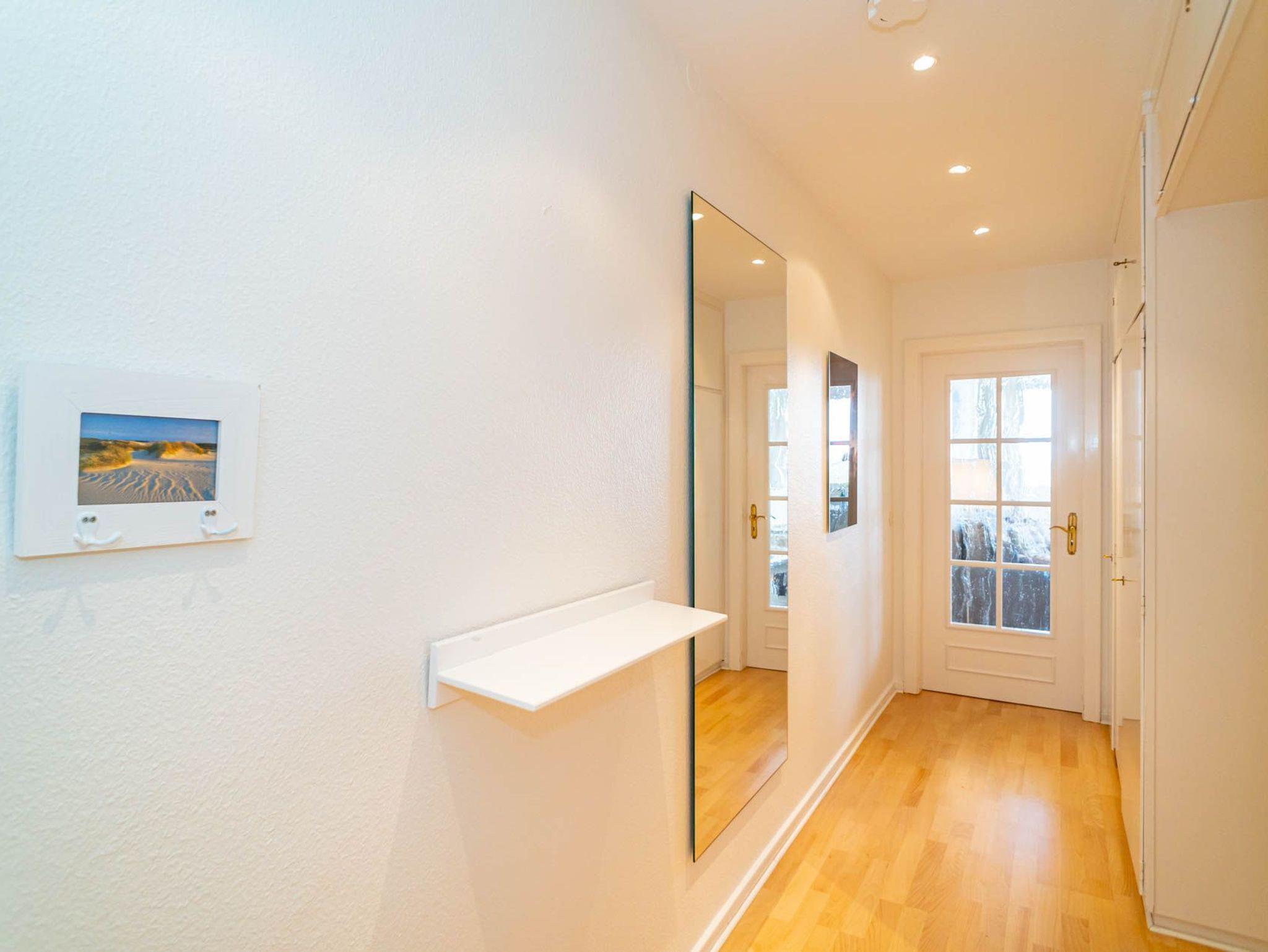 Vom Windfang gelangt man in die Diele mit Garderobe und großem Kleiderschrank und von dort in den Wohn- und Schlafraum sowie in das Duschbad /WC.