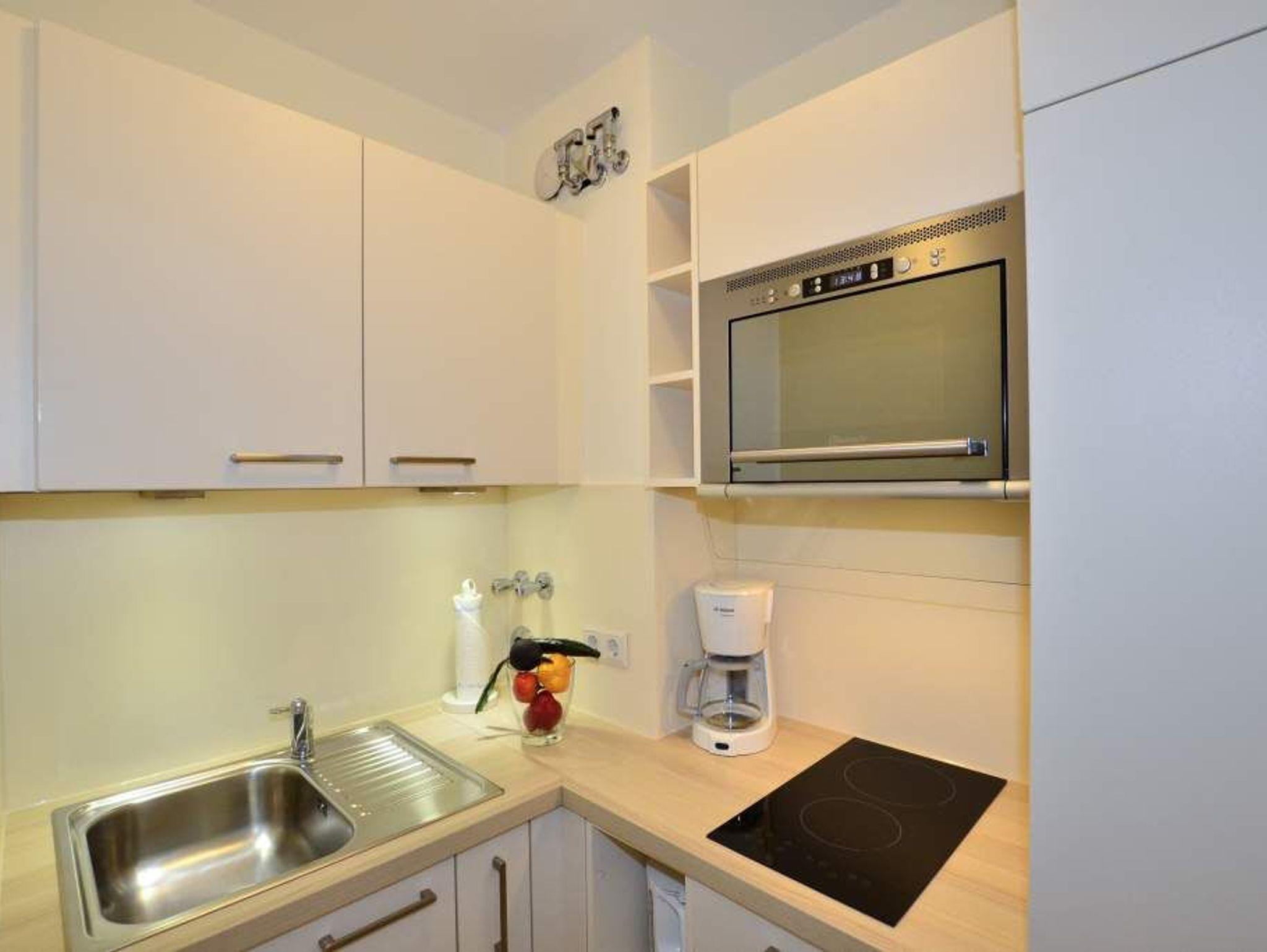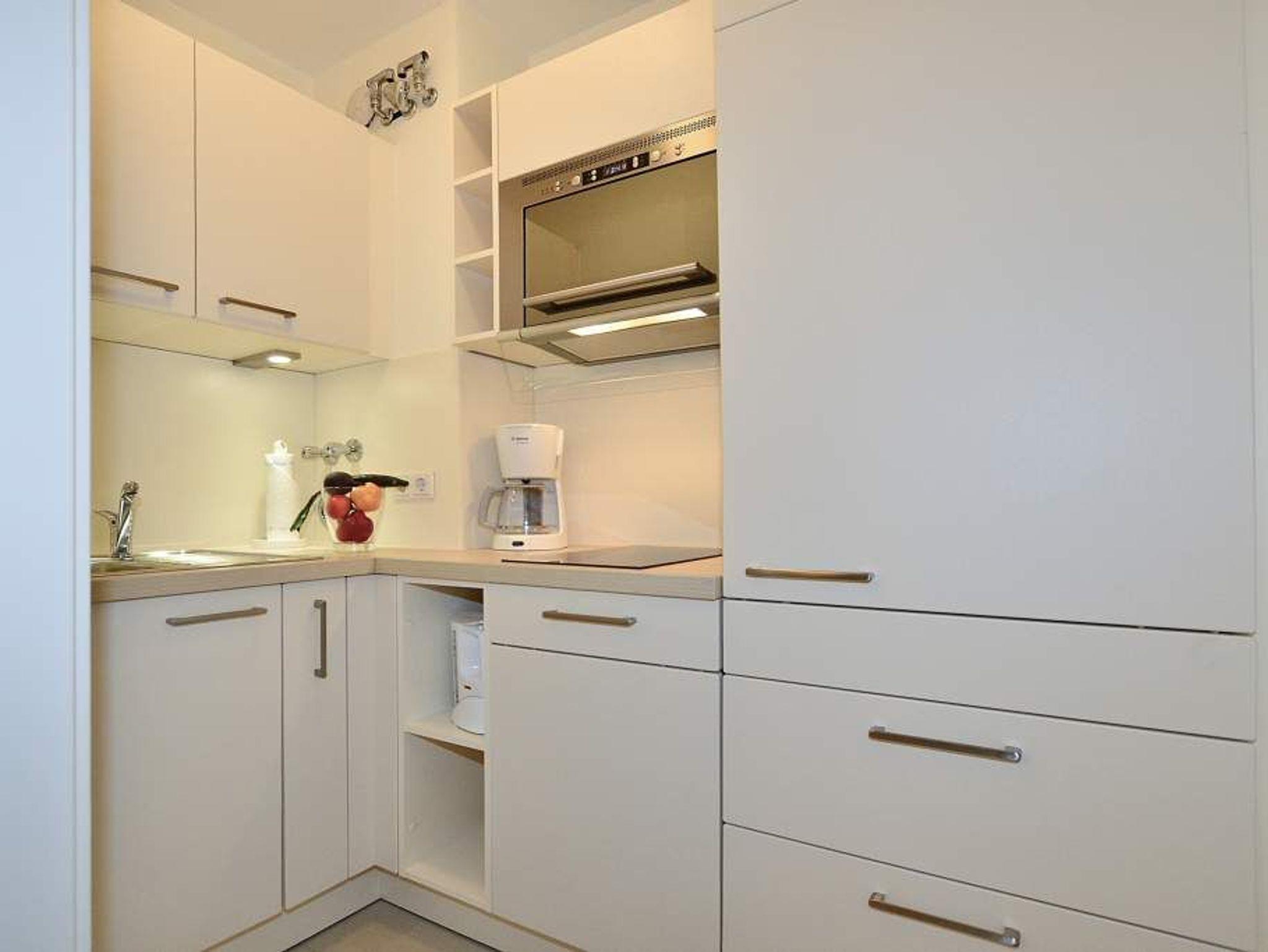 Die hochwertige zum Wohnraum hin offene Einbauküche ist mit Geschirrspüler, 2-Platten-Ceranfeld, Mikrowelle und Kühlschrank mit 3-Sterne-Gefrierfach vollumfänglich ausgestattet. Kaffeemaschine, Wasserkocher und Toaster gehören dabei zur Grundausstattung.