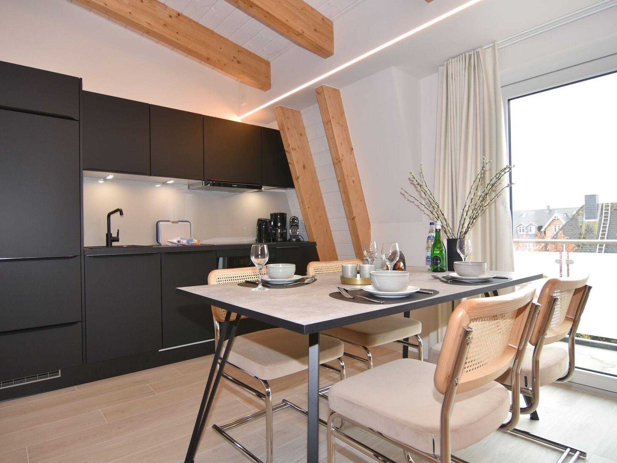 Die hochwertige 2-Zimmer-Wohnung im 2. OG mit ca. 54 qm ist für maximal 3 Personen ausgestattet. Vom Flur mit Garderobe gelangen Sie in das Wohnzimmer mit offener Küche und möbliertem Südbalkon. Die hochwertige Küche bietet neben Induktionsherd auch Geschirrspüler, Kühlschrank mit Gefrierfach und Backofen mit integrierter Mikrowelle. Die Wohnung bietet Ihnen ein Schlafzimmer und ein Duschbad /WC mit Haar- und Handtuchtrockner. Das Schlafzimmer ist mit einem Boxspringbett (200x200) der Marke FBF, Flat-TV und Einbauschrank ausgestattet (1 Kinderbett zubuchbar). Bis auf das Schlafzimmer sind die Räume mit großformatigen Fliesen versehen.