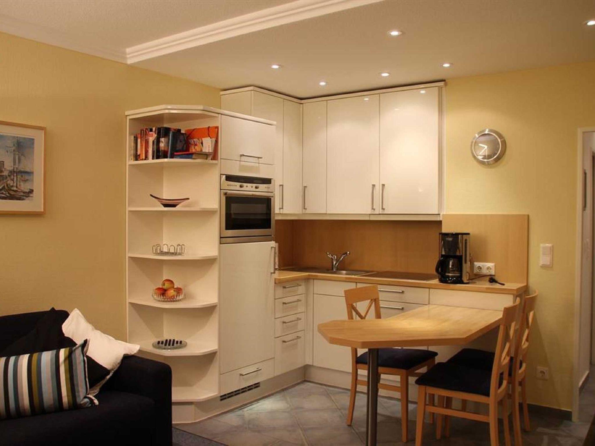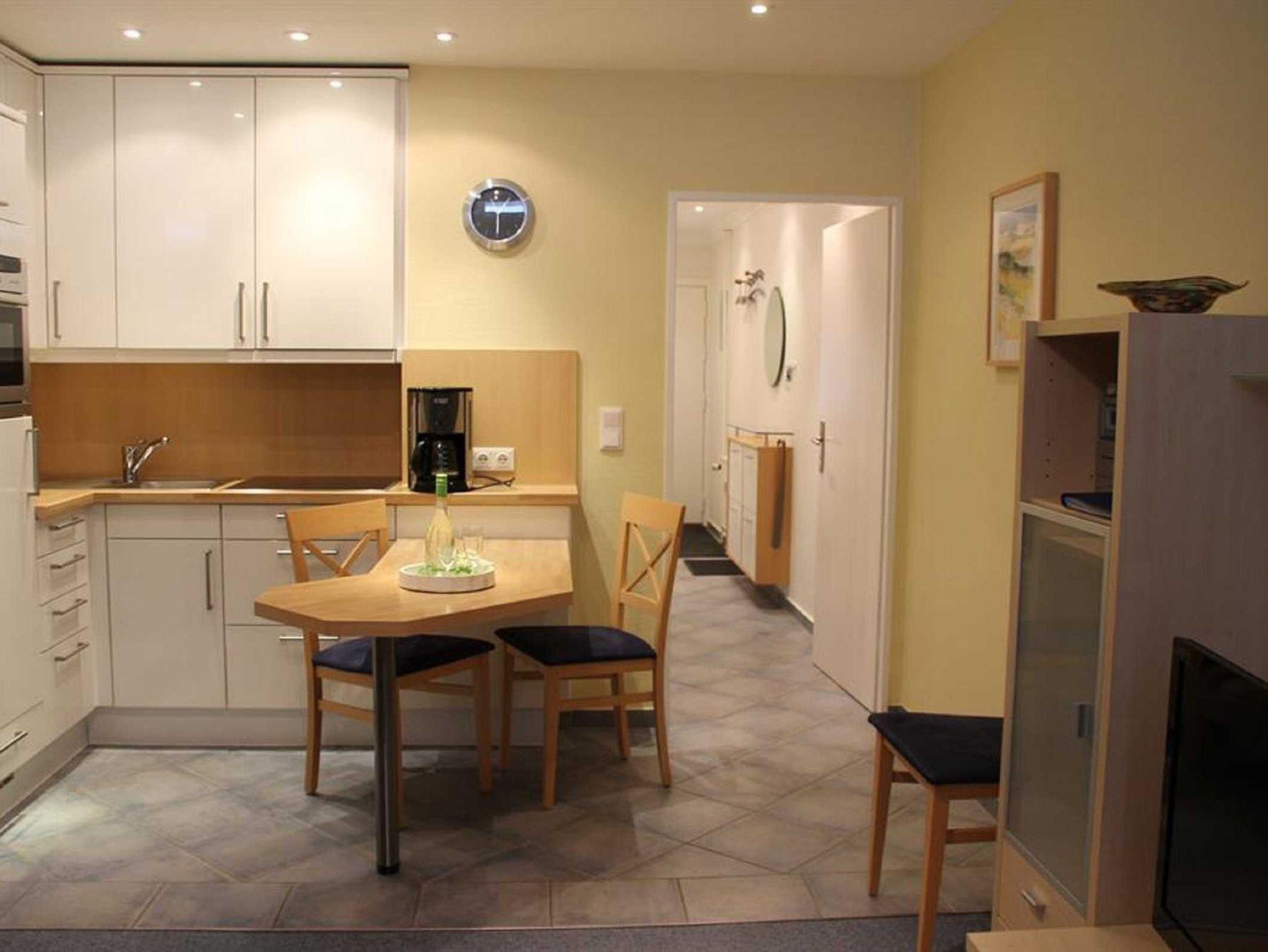 Eine Küchenzeile mit Cerankochfeld, Kühlschrank, Mikrowelle, Spülbecken, Kaffeemaschine, Toaster, Wasserkocher und Geschirr für den täglichen Bedarf sind selbstverständlich.