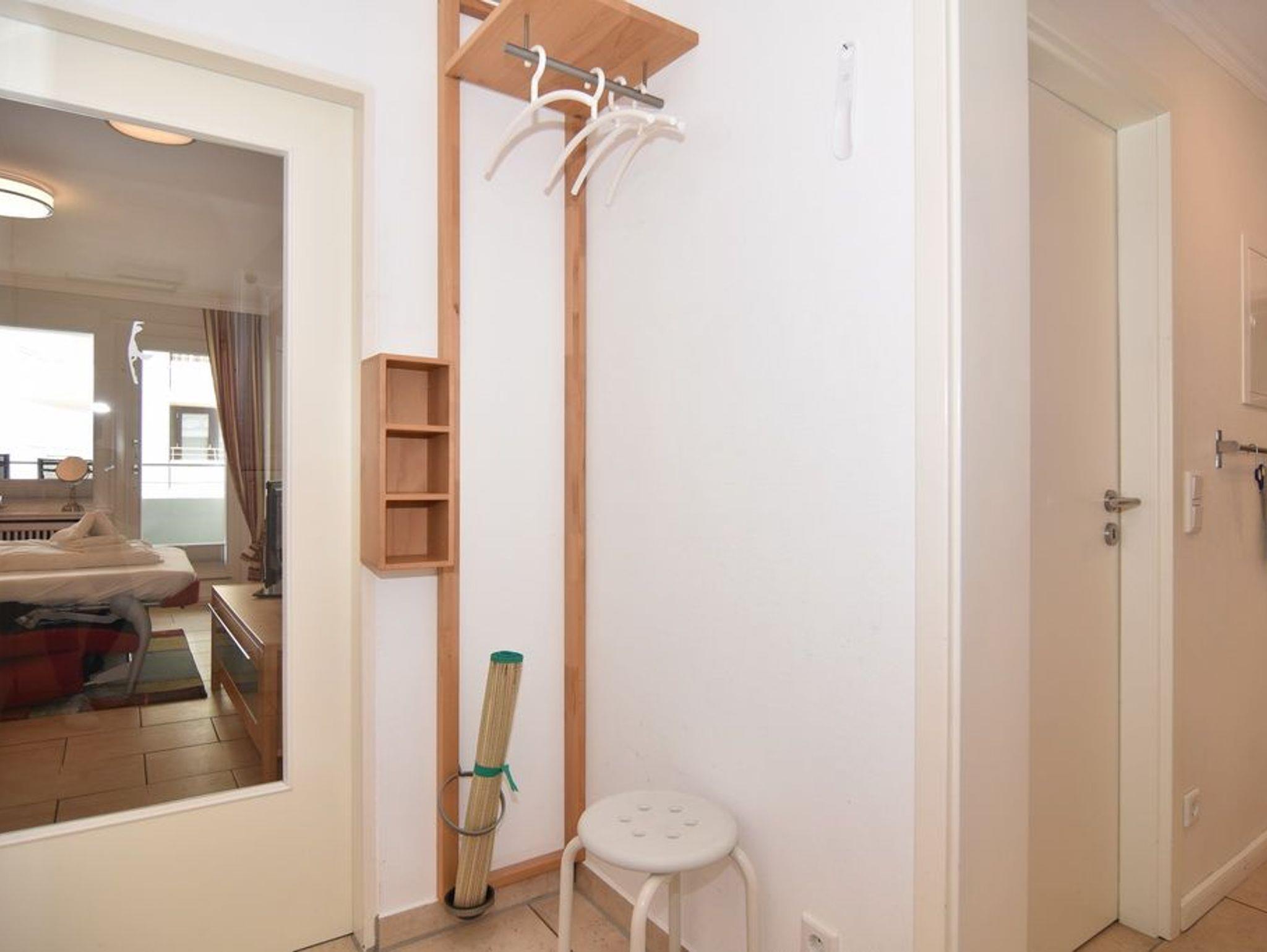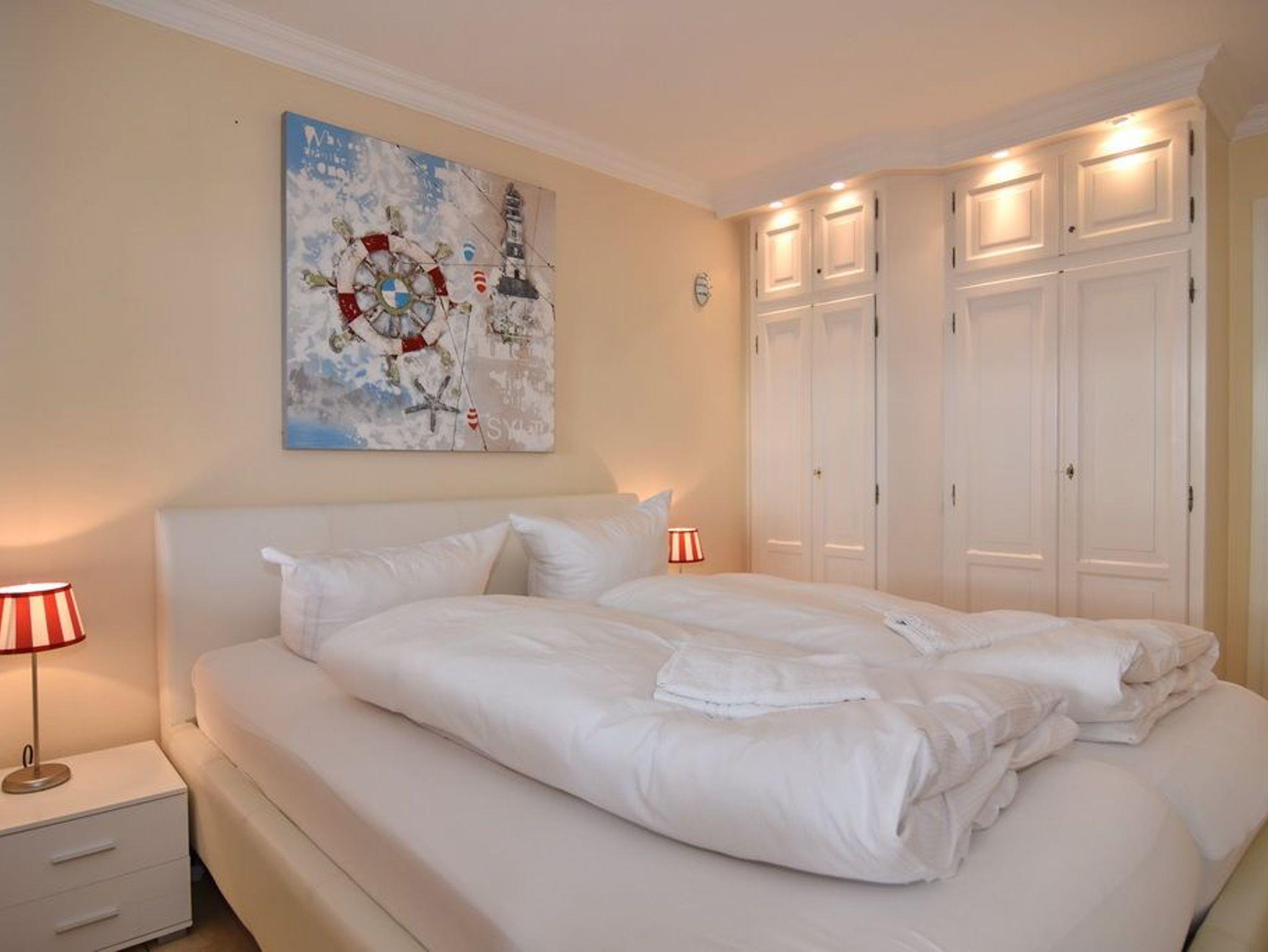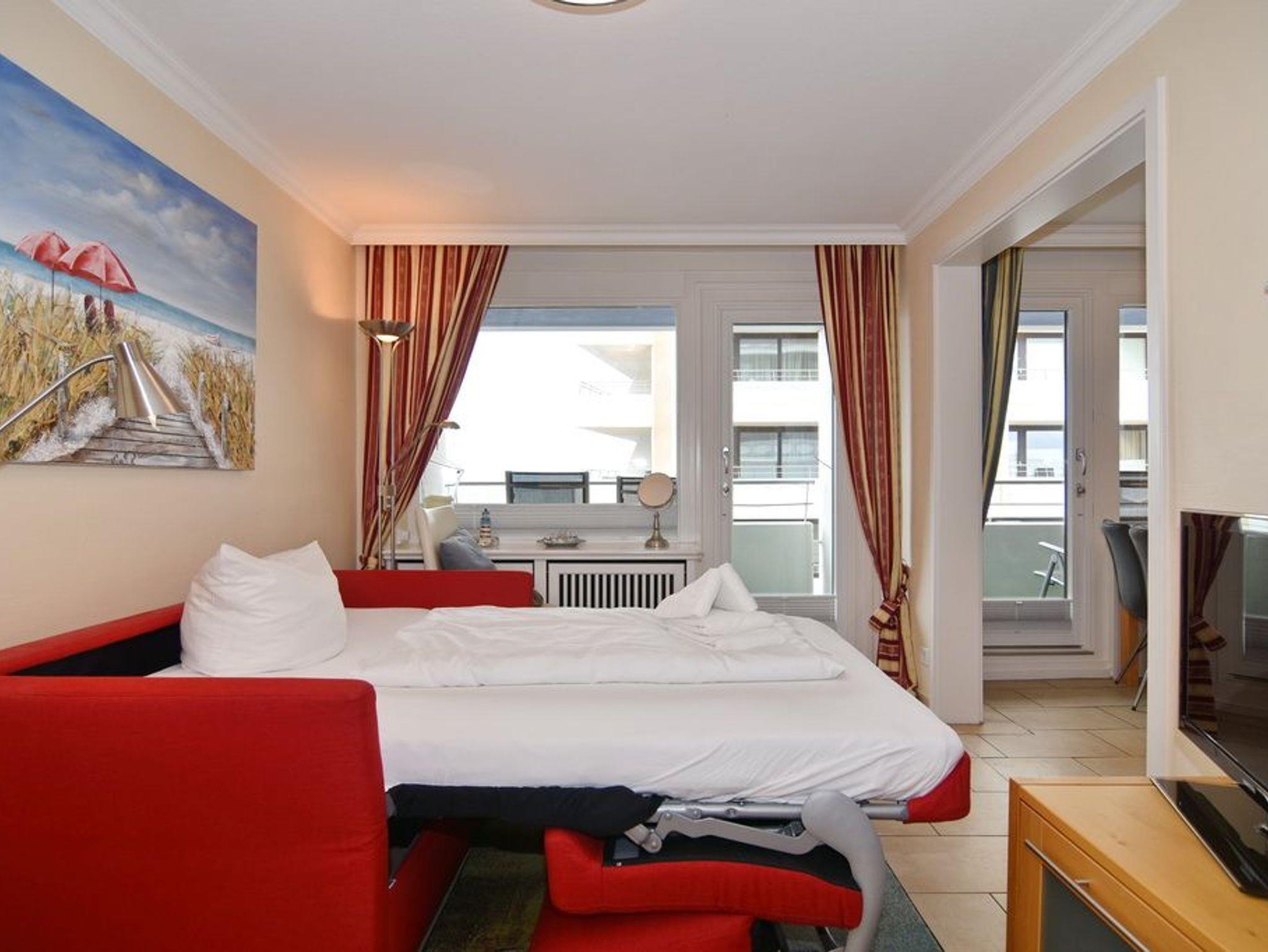 2-Zimmer-Wohnung im Haus am Meer mit Westbalkon und Meeresblick, ca. 50qm, 4. OG zur Seeseite - Nichtraucher-Whg.! Wohnzimmer mit Schlafcouch, Kleiderschrank, Flat-TV und Westbalkon. Von hier aus gelangt man zum Essplatz für 4 Personen - dieser ist dem separaten Schlafzimmer mit Doppelbett, Einbauschrank und Flat-TV vorgelagert. Der Essplatz besteht aus einer großzügigen Eckbank und 2 Stühlen, die wahlweise auch zum Sofa gestellt werden können. Im Flurbereich befindet sich die offene Küche mit Geschirrspüler, Ceranherd mit 4 Kochfeldern und Mikrowelle. Der Kühlschrank verfügt über ein Gefrierfach. Duschbad / WC. PKW-Stellplatz/Garage kann kostenpflichtig gebucht werden. Bettwäsche und Handtücher sind zur Anreise aufgezogen. Tierhaltung ist in der Wohnung nicht gestattet. Beginnend vom 15.10.2025 bis 5.4.2026 (Ostern) findet die Fassandensanierung der Landseite (Osten) sowie des Südgiebels statt. Mit Baulärm ist in dieser Zeit zu rechnen.