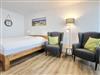 Der Wohn- und Schlafbereich, Ende 2025 aufwendig renoviert, präsentiert sich modern, freundlich und harmonisch abgestimmt: Ein hochwertiges Holzbett, zwei gemütliche Ohrensessel mit farbigen Akzenten ein gemütlicher Essplatz mit zwei komfortablen Polsterstühlen schaffen eine einladende Atmosphäre. Warme Holzelemente, stilvoll ausgewählte Dekoration und ein Designboden in Holzoptik setzen zusätzliche Wohlfühlakzente.