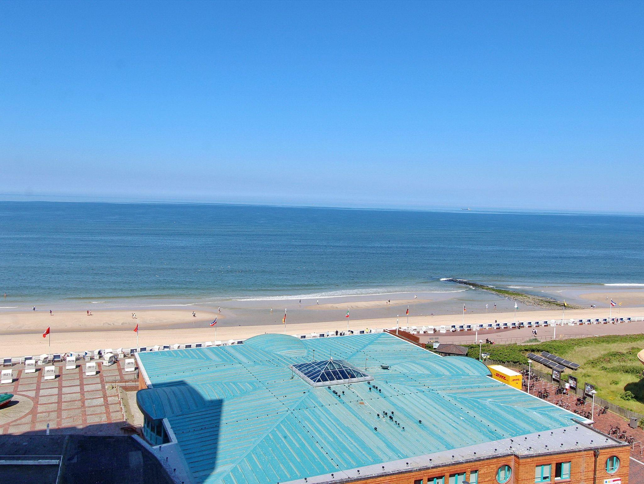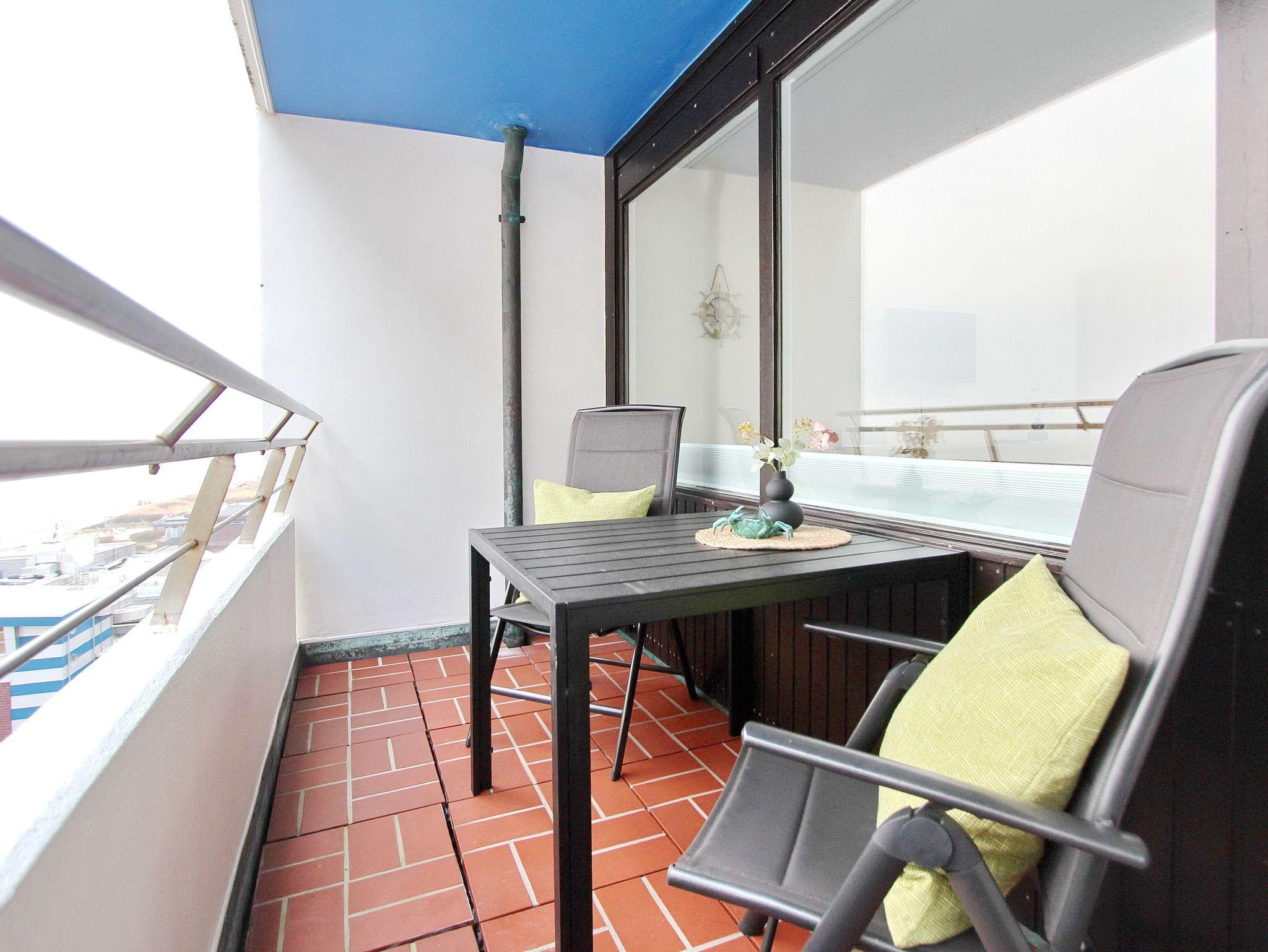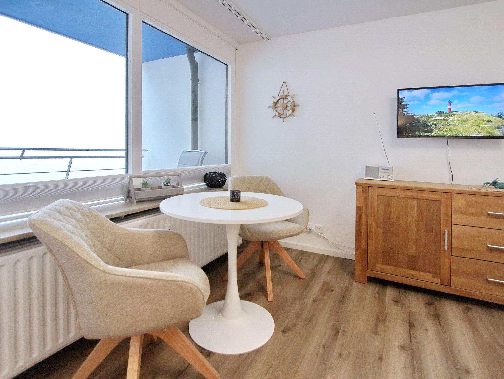 Diese stilvoll eingerichtete Einzimmerwohnung in der 9. Etage des Hauses Sylter Welle bietet einen atemberaubenden Panoramablick auf den Strand und die endlose Weite der Nordsee. Vom Westbalkon aus genießen Sie traumhafte Sonnenuntergänge und direkten Blick auf die Strandpromenade ? ideal für entspannte Abende mit Meeresrauschen.