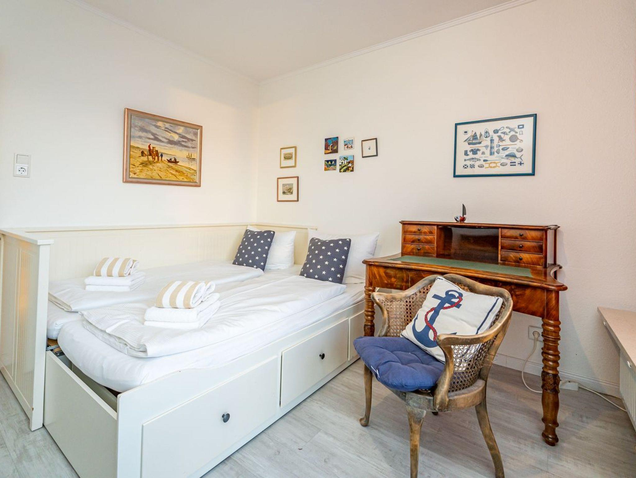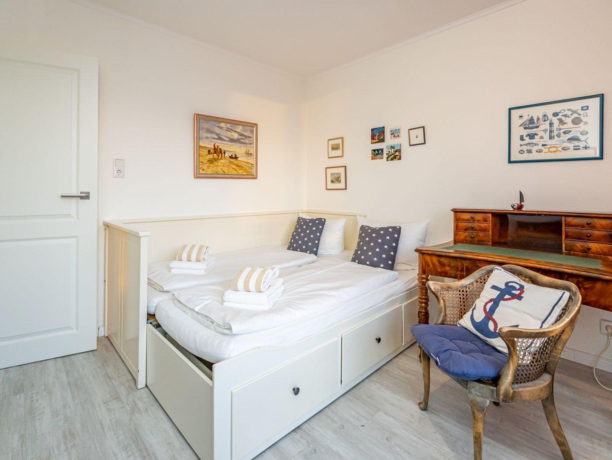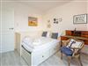 Lese- bzw. Spielzimmer hat neben einem Sekretär und Kommode ein Einzelbett[nbsp][nbsp](Liegefläche 0,80 x 2,00 m), dass sich (durch Auszug einer Schublade) zu einem Doppelbett umbauen lässt (neue Liegefläche dann 1,60 x 2 m). Auch von diesem Zimmer hat man Zugang zur Dachterrasse.