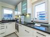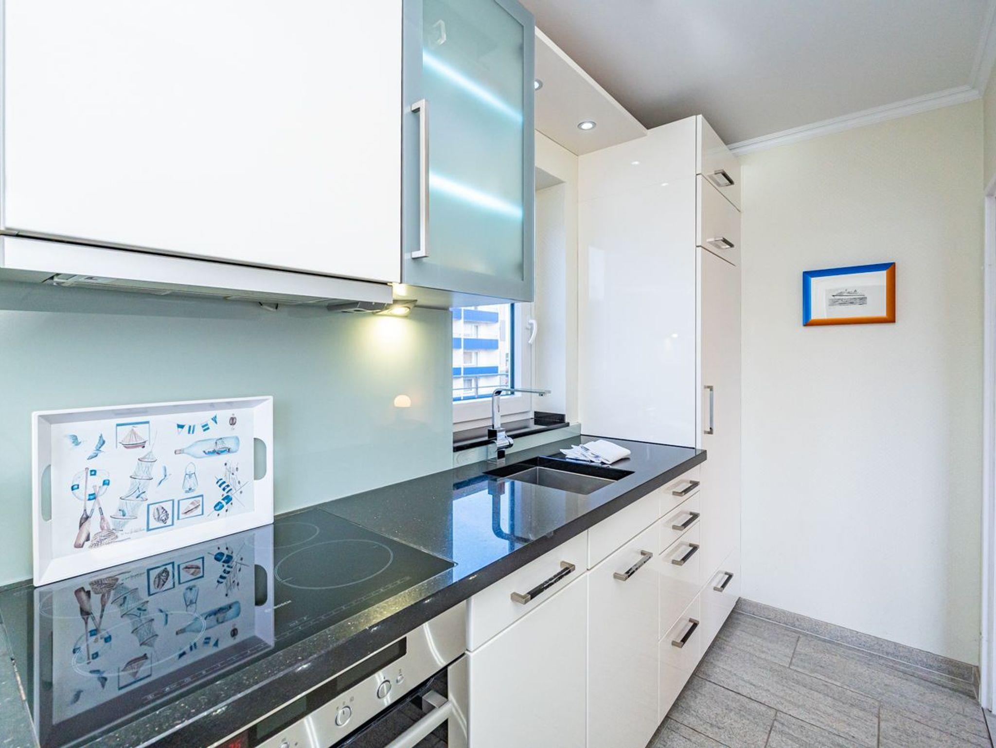 Die vom Wohnraum begehbare exklusive, neue Küche mit zwei Fenstern und Granitarbeitsplatte besteht aus Geschirrspüler, Induktionskochfeld (4 Kochfelder), Backofen mit Mikrowellenfunktion und einem Kühlschrank mit 4-Sterne-Gefrierfach.