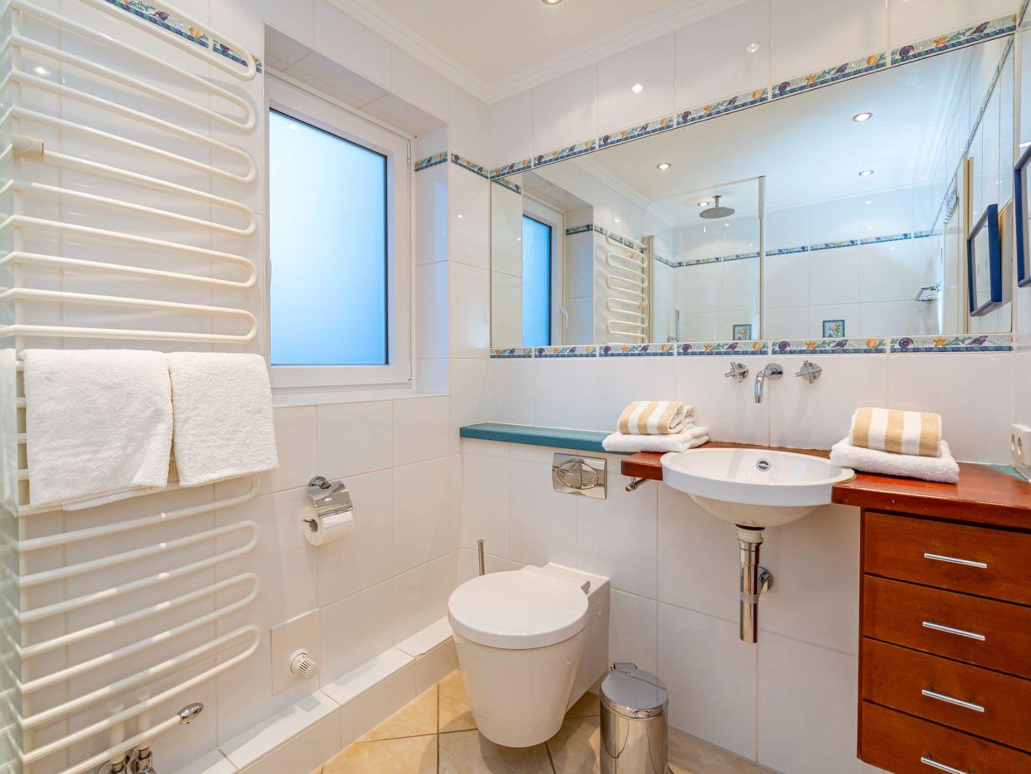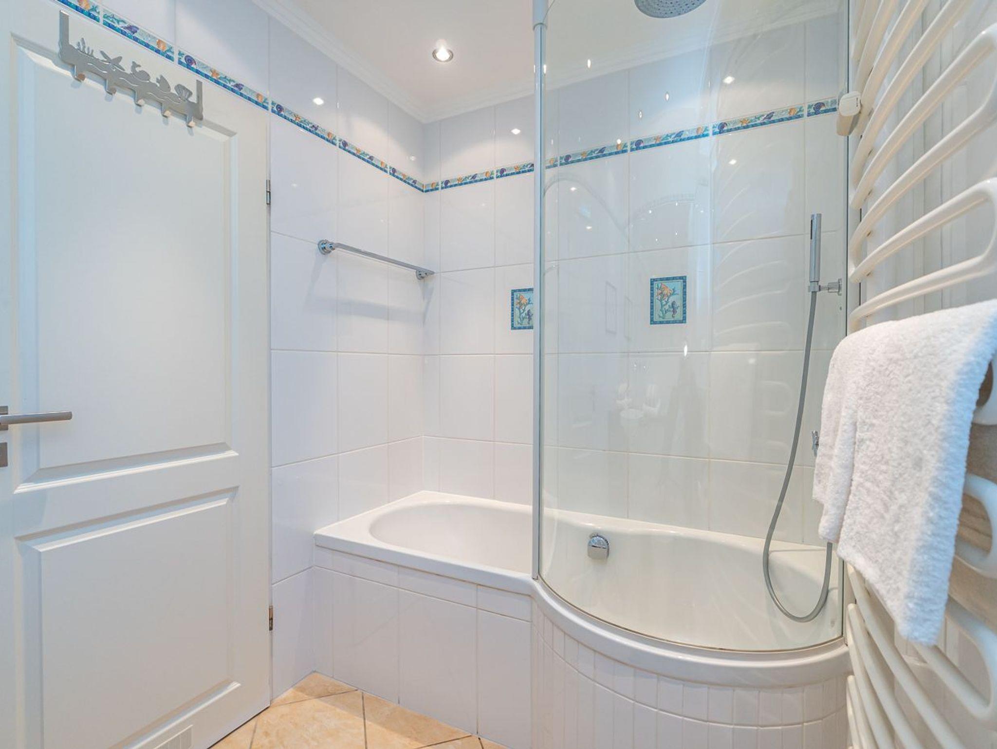 Im neuwertigen Badezimmer mit Fenster steht eine Badewanne mit Duschmöglichkeit[nbsp][nbsp](Glasabtrennung) , Waschtisch, WC und Fön zur Verfügung.