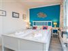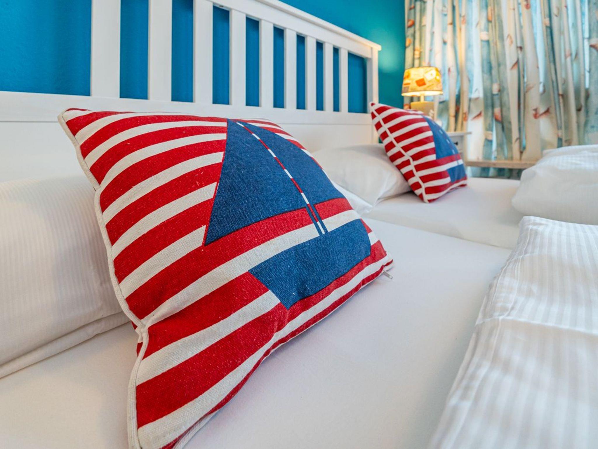 Das große Schlafzimmer ist mit einem Doppelbett (1,60 x 2,00 m) mit guten Einzelmatratzen und Zugang zur Dachterrasse ausgestattet. Das