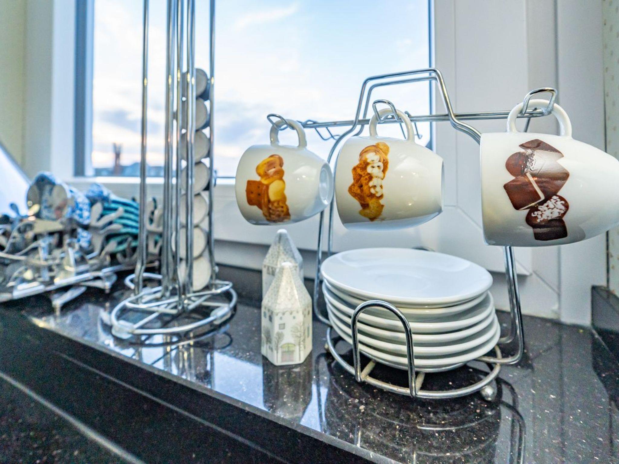 Kaffeemaschine, Nespresso-Maschine, Wasserkocher und Toaster sind ebenfalls vorhanden.