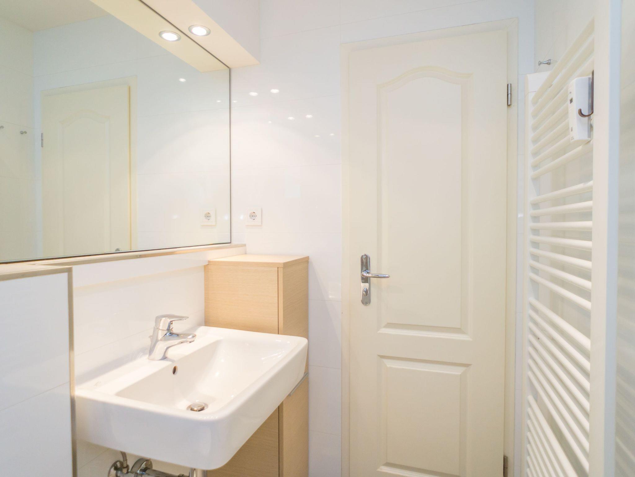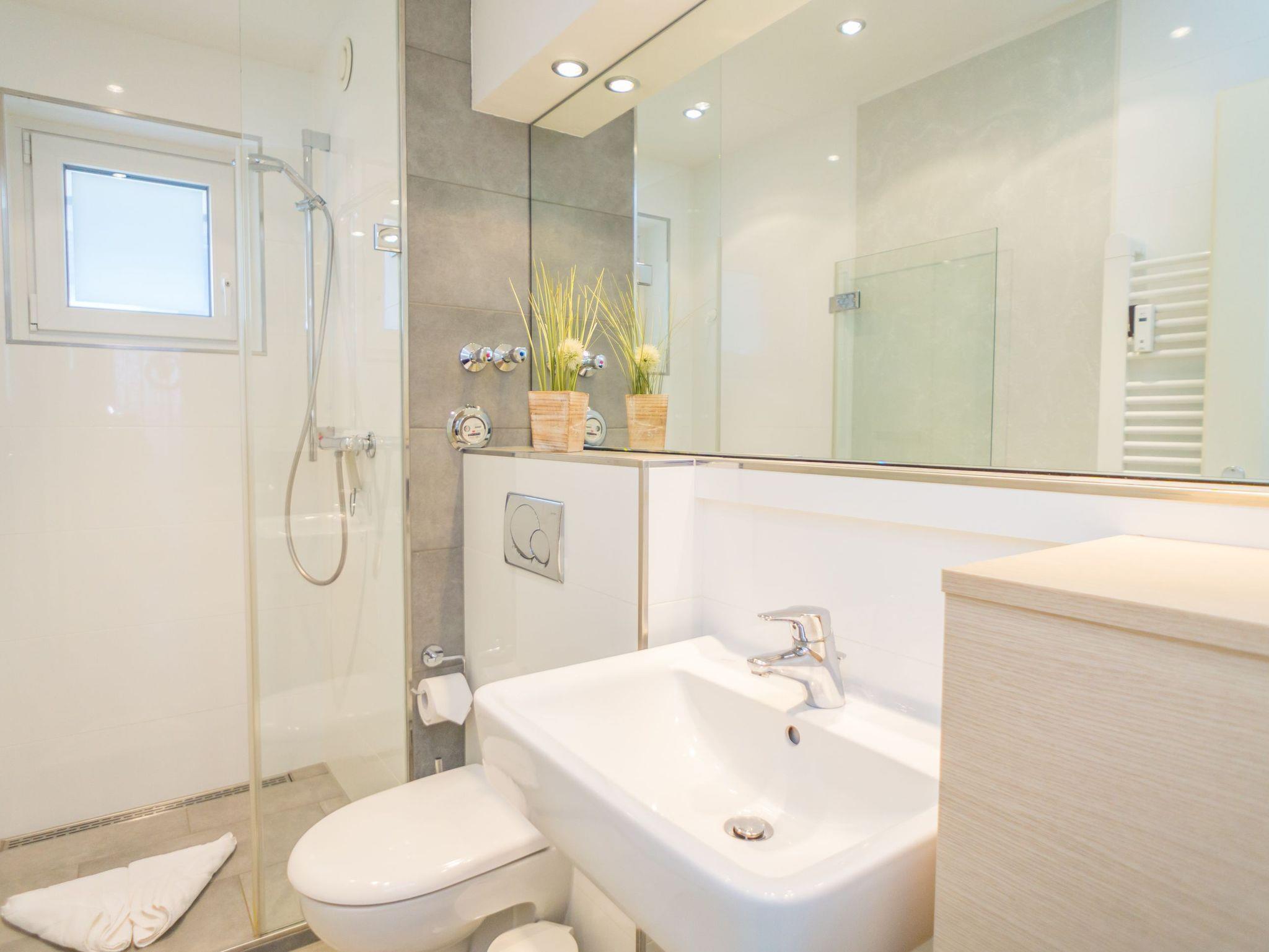 Im neuen Badezimmer befindet sich eine Dusche mit extrem niedrigen Einstieg, ein Waschtisch, ein Handtuchtrockner, WG und ein Fenster.