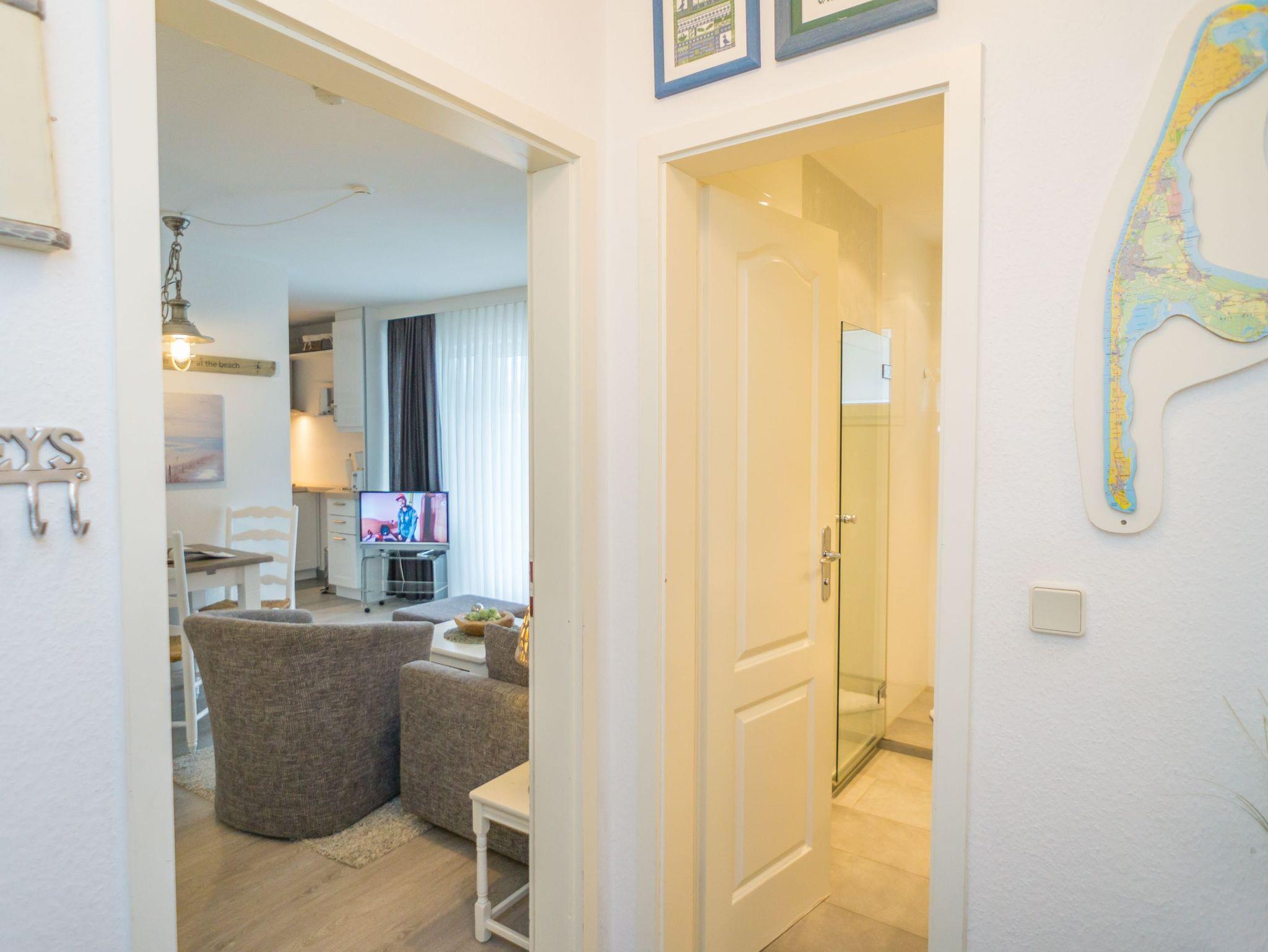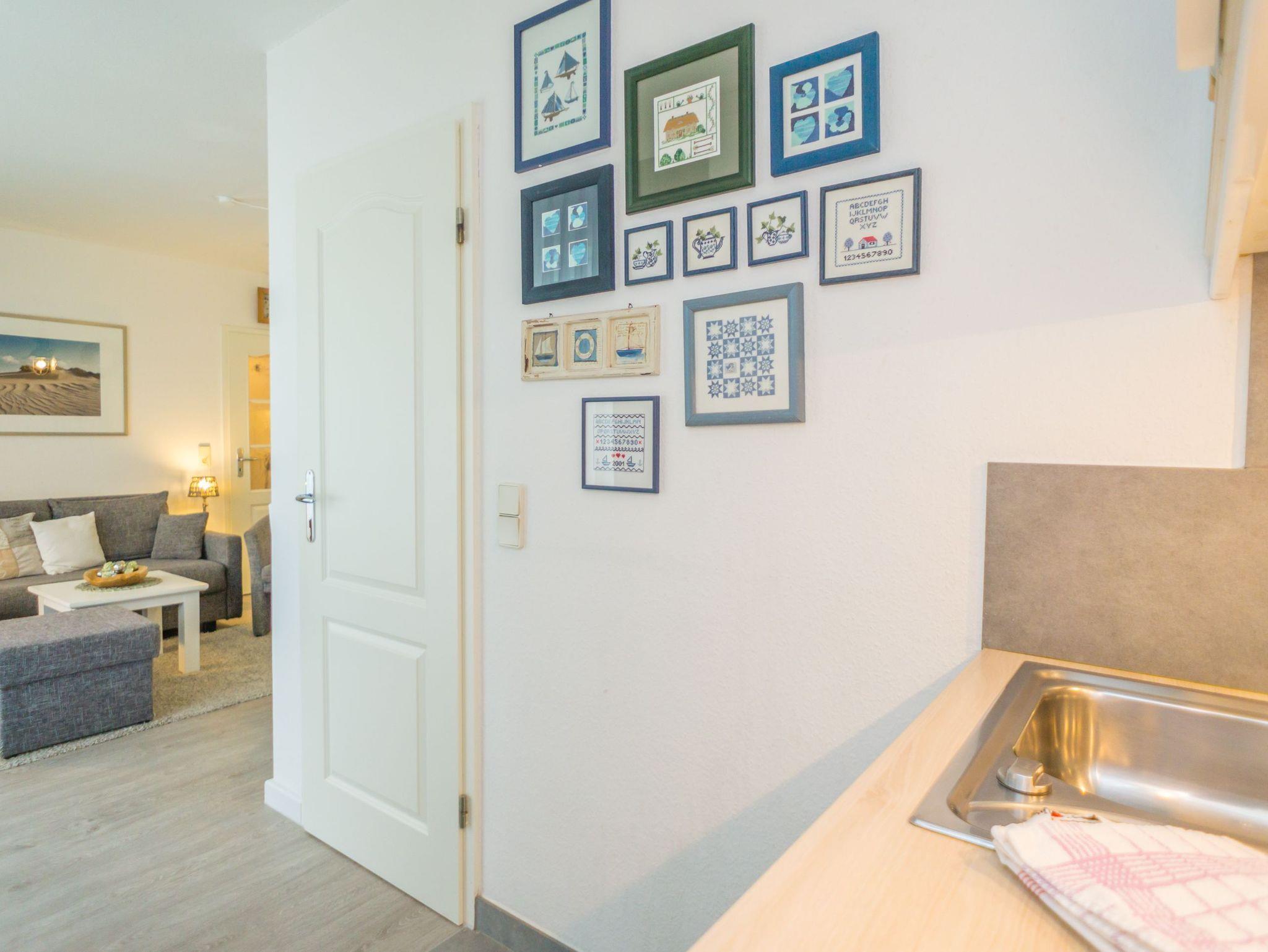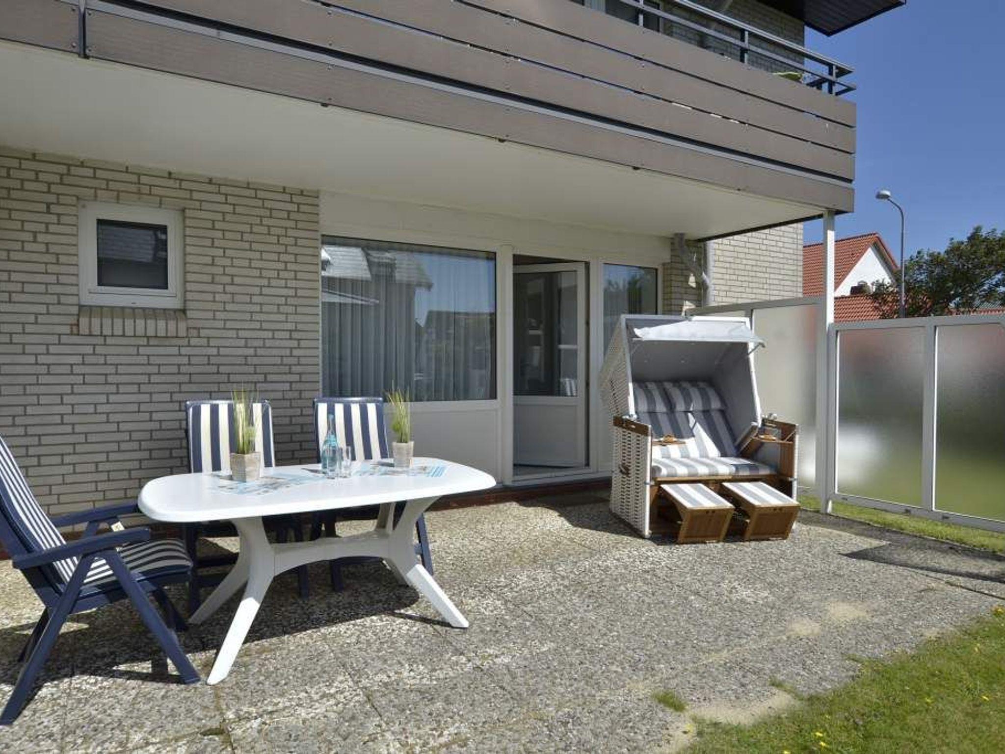 Hochwertig ausgestattete 2-Zimmer-Nichtraucher-Ferienwohnung, ca. 41 qm, für max. 3 Personen im Erdgeschoss mit Südterrasse (mit Strandkorb, Balkonmöbeln und Auflagen) und eigenem PKW-Stellplatz in der Tiefgarage.