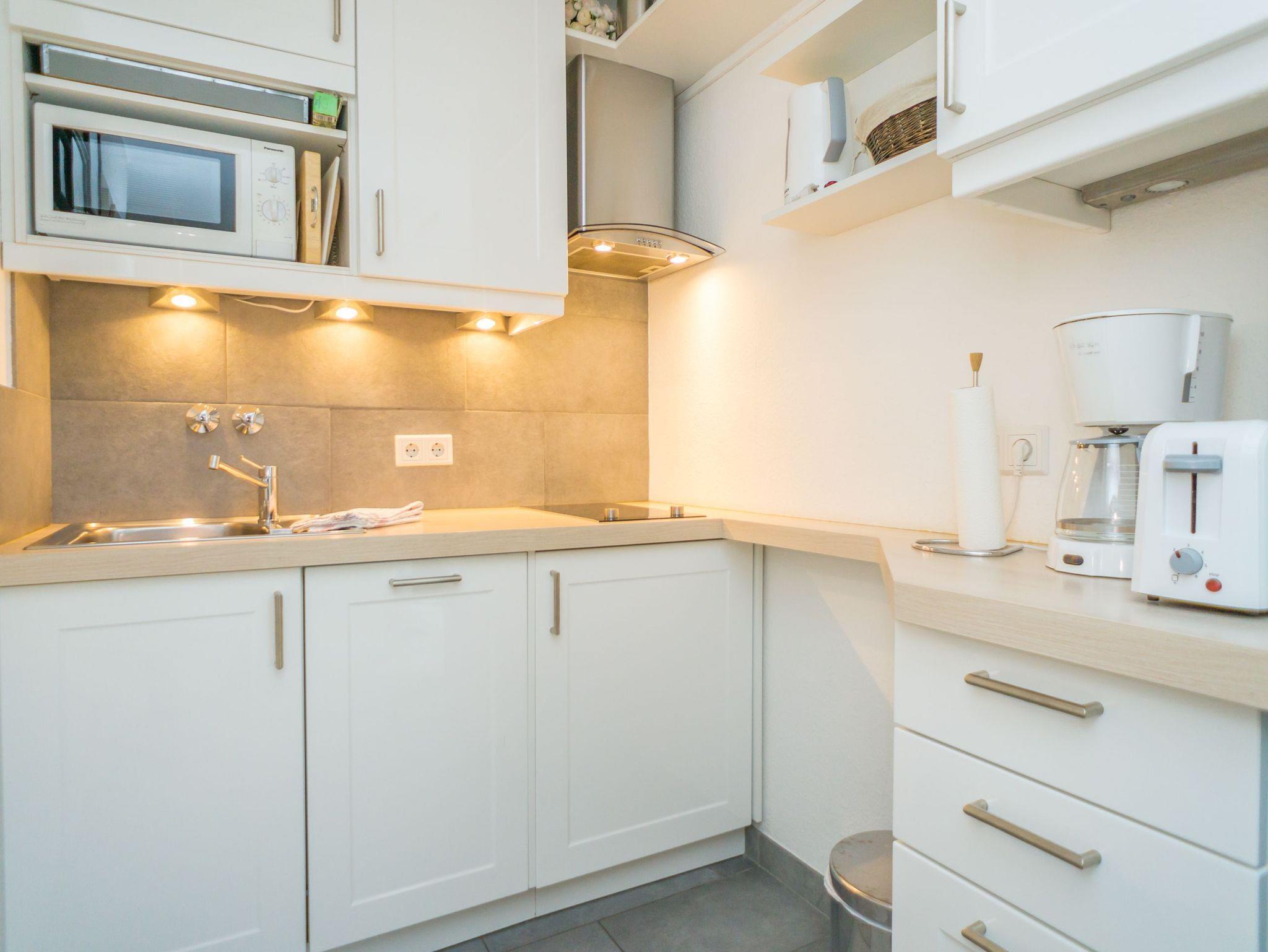 Die moderne Küchenzeile ist mit Geschirrspüler, Ceranfeld (2 Kochfelder), Mikrowelle und Kühlschrank ausgestattet. Kaffeemaschine, Wasserkocher und Toaster gehören zur Grundausstattung.