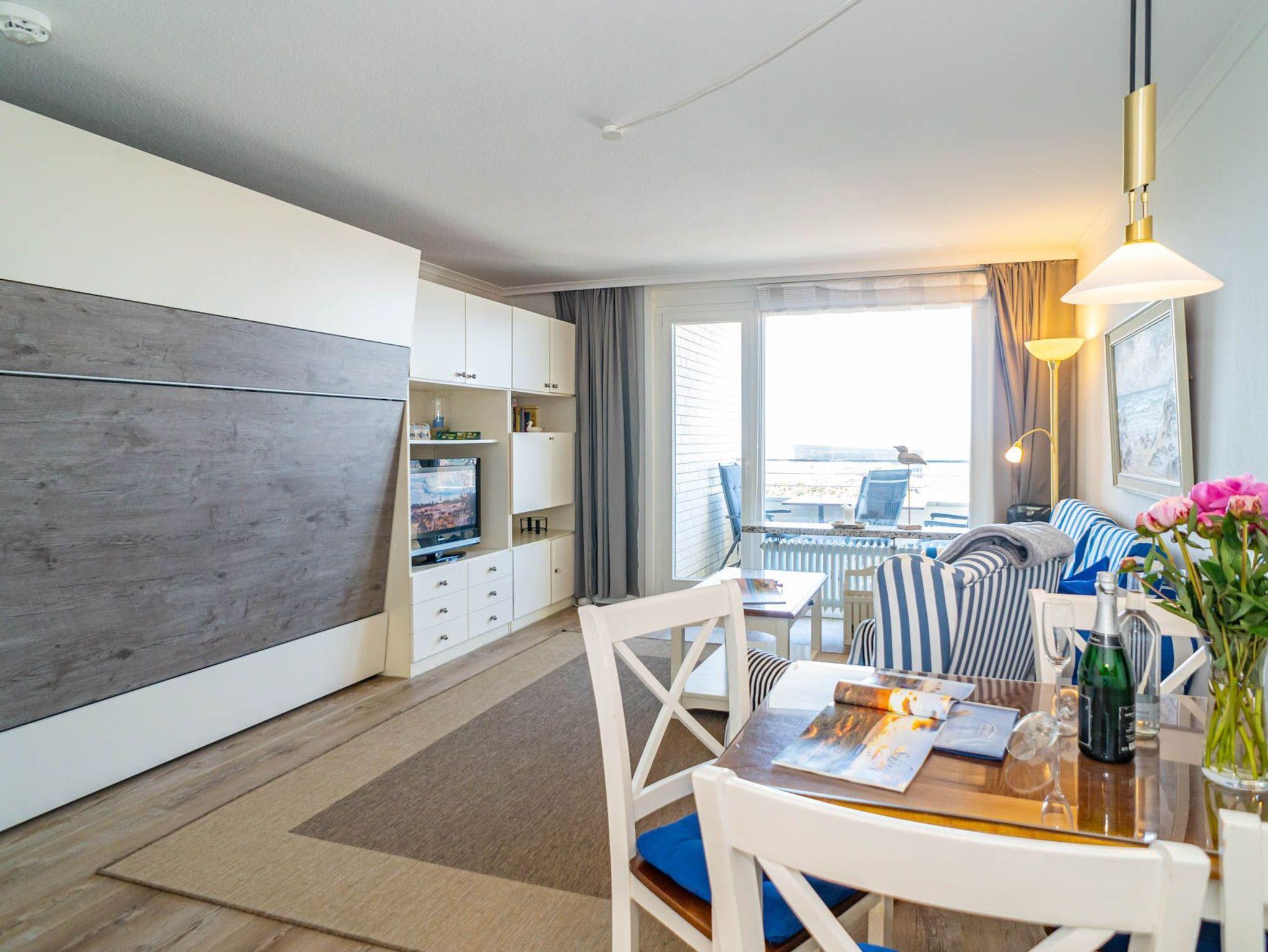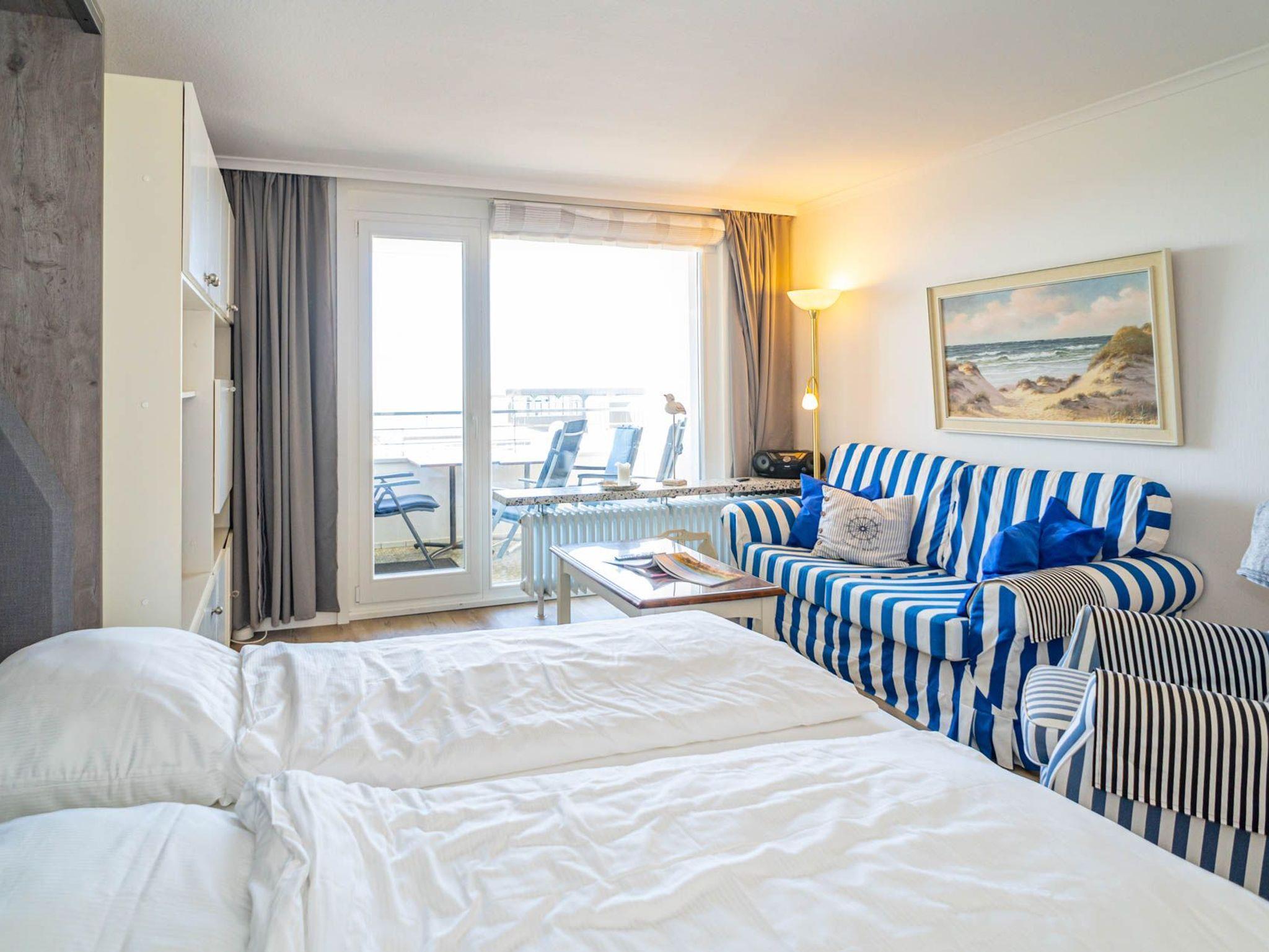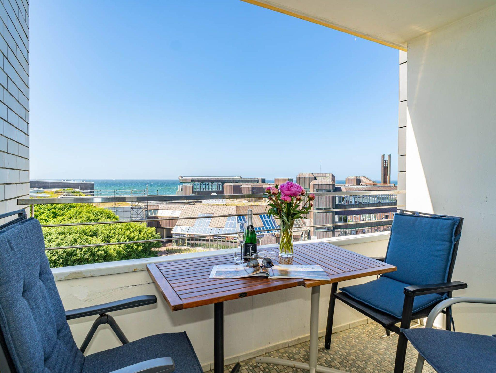 Genießen Sie Ihren Aufenthalt in dieser modernisierten 1,5-Zimmer-Nichtraucherwohnung mit Meerblick! Die ca. 48 m² große Ferienwohnung liegt in der 4. Etage zur Seeseite und bietet Platz für bis zu 4 Personen. Die nach Westen ausgerichtete Loggia lädt mit Balkonmöbeln und Auflagen dazu ein, die Nachmittagssonne und den Blick aufs Meer in vollen Zügen zu genießen.