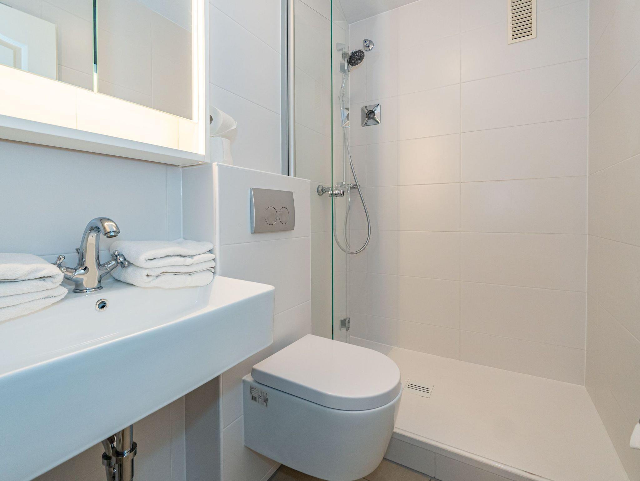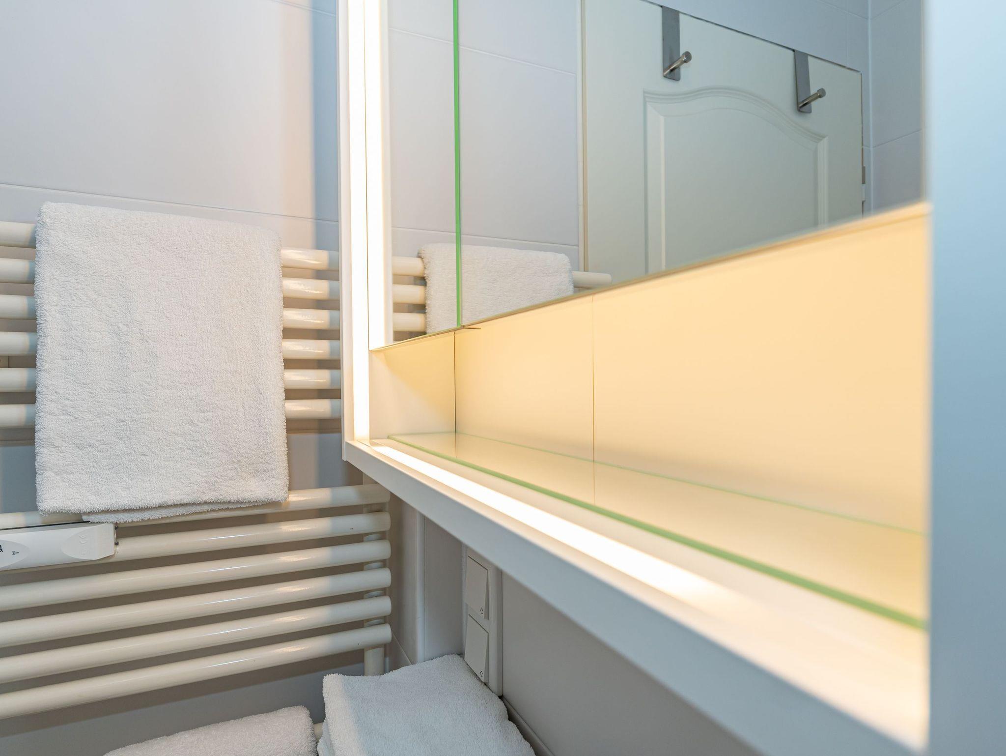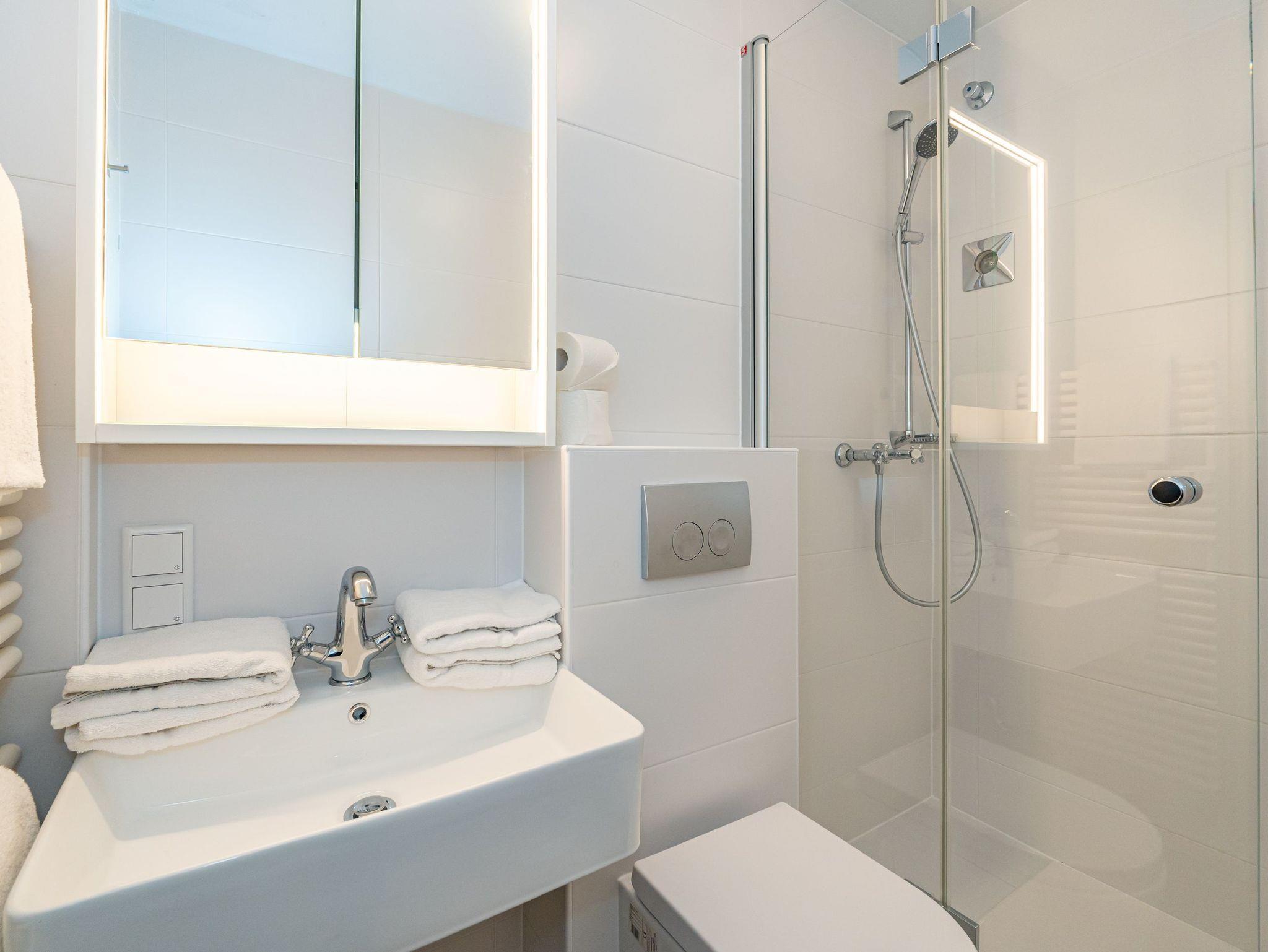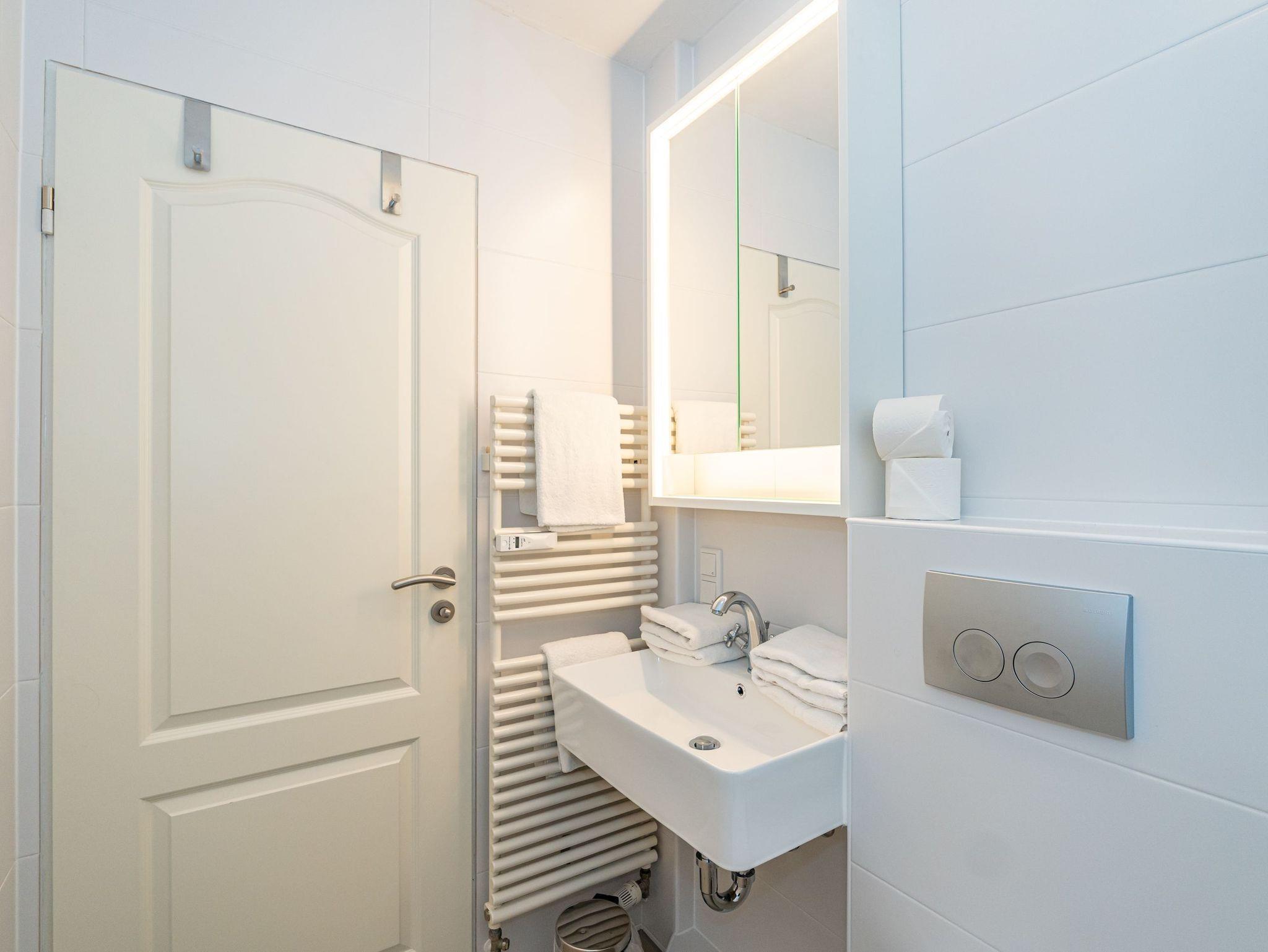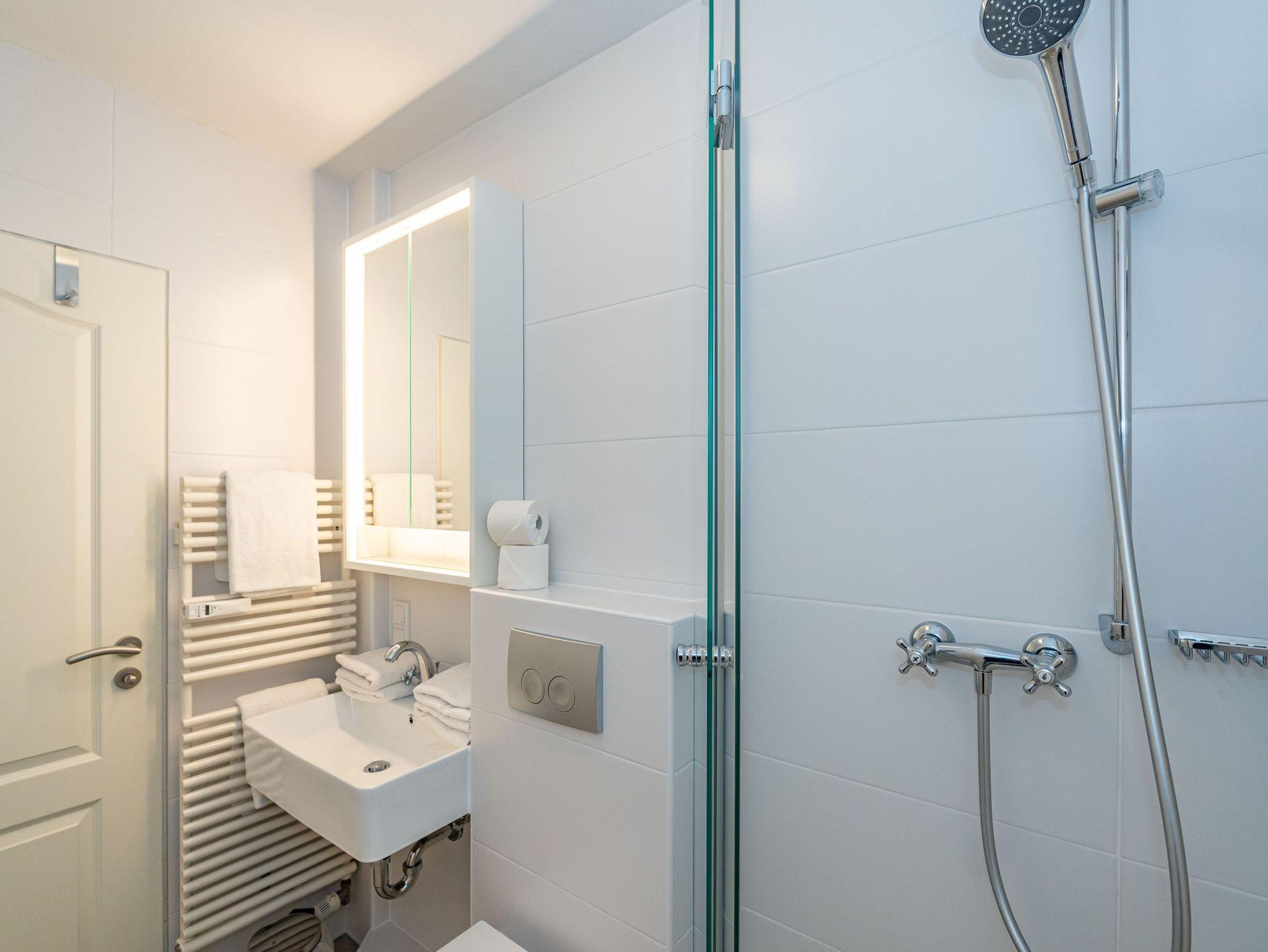 Das Badezimmer ist mit einer Dusche, einem Waschtisch, WC, Handtuchtrockner und einem Fön ausgestattet.