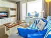 Vom Vorflur mit Garderobe gelangen Sie direkt ins gemütliche Wohnzimmer mit Zugang zur Loggia, in das kleine Schlafzimmer sowie ins helle Duschbad. Der Wohnbereich ist mit einer neuen Sitzgarnitur (2-Sitzer-Couch und zwei Korbsesseln), einem Essplatz und einem praktischen Doppelschrankbett (ausklappbar, 1,80 x 2,00 m) eingerichtet. Sat-Flachbild-TV, HiFi-Anlage und kostenfreier WLAN-Zugang (ohne Gewähr) sorgen für Unterhaltung.