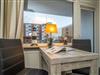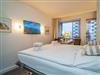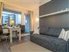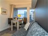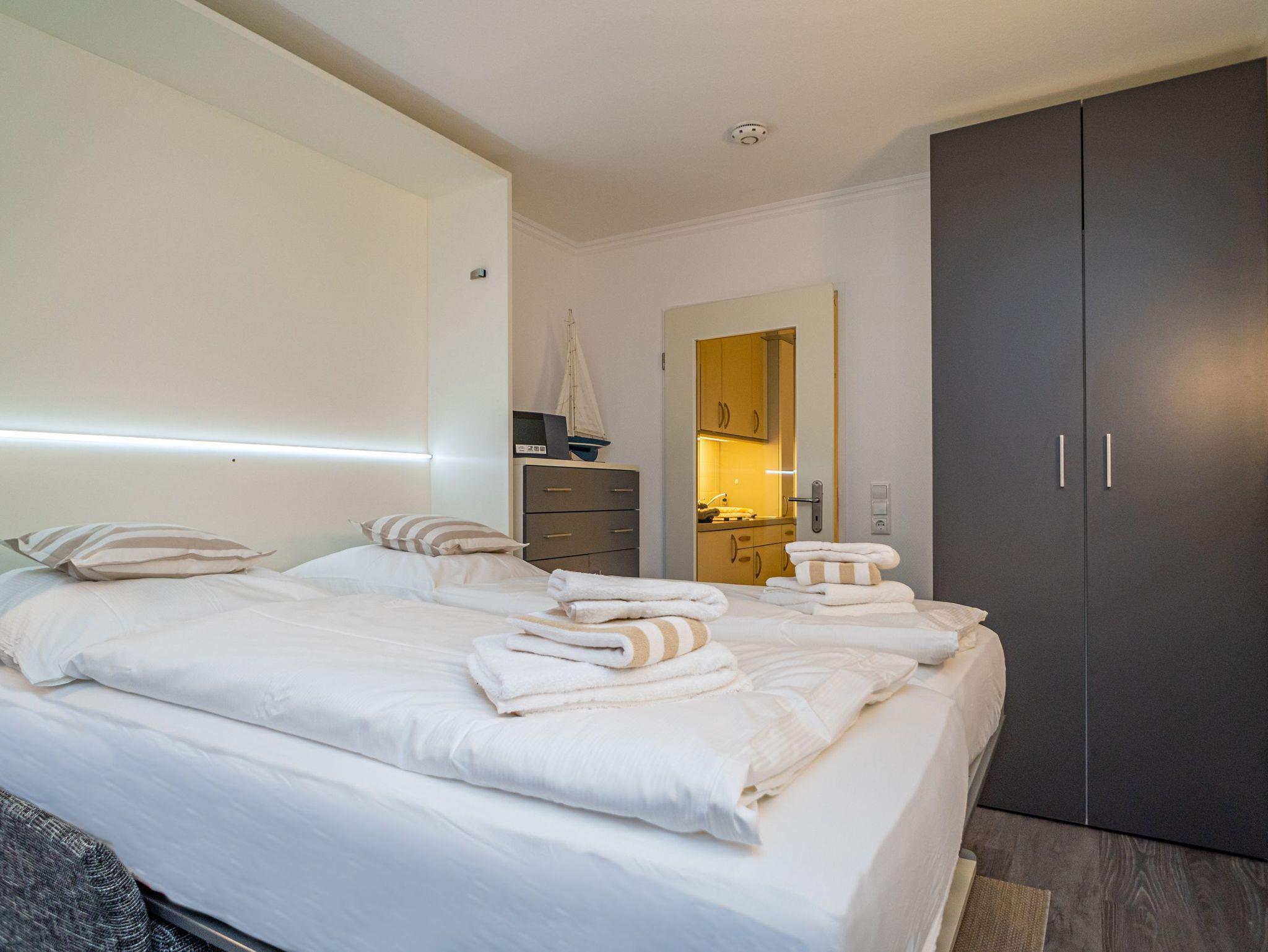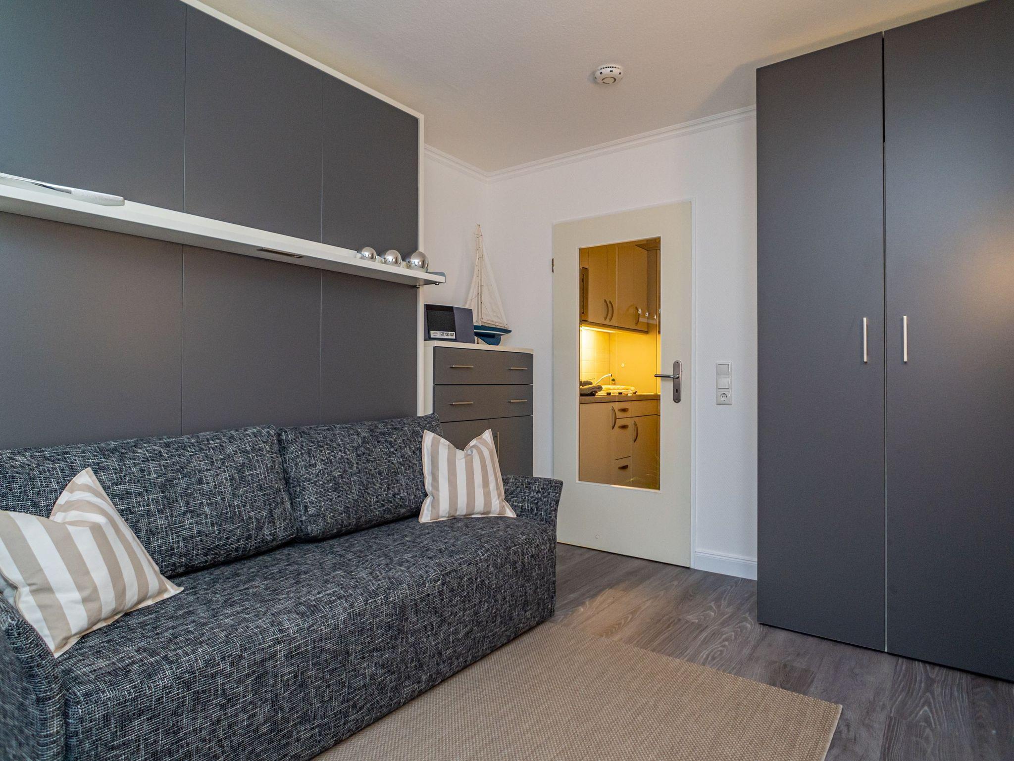 Vom Eingangsbereich mit Garderobe und integrierter Küchenzeile gelangen Sie in das kombinierte Wohn- und Schlafzimmer sowie in das modernisierte Duschbad. Der Wohn-/Schlafraum ist mit einem hochwertigen Designerboden in Holzoptik ausgelegt und verfügt über eine praktische Schrankbett-/Sofakombination, die sich mit wenigen Handgriffen zu einer komfortablen Liegefläche mit zwei separaten Matratzen ausklappen lässt. Ein Kabel-Flachbild-TV sowie ein Radio mit CD-Player sorgen für Komfort und Unterhaltung. Der Zugang zur Loggia mit Blick zur Landseite rundet den Raum harmonisch ab.